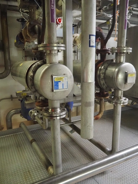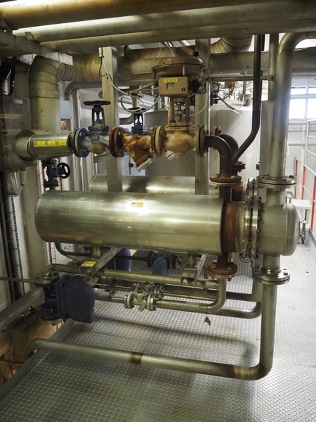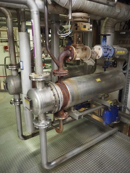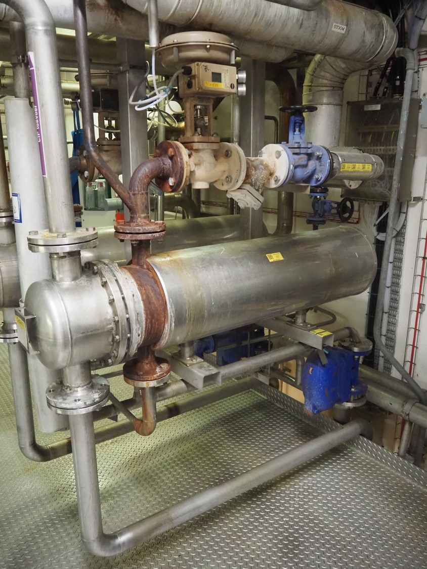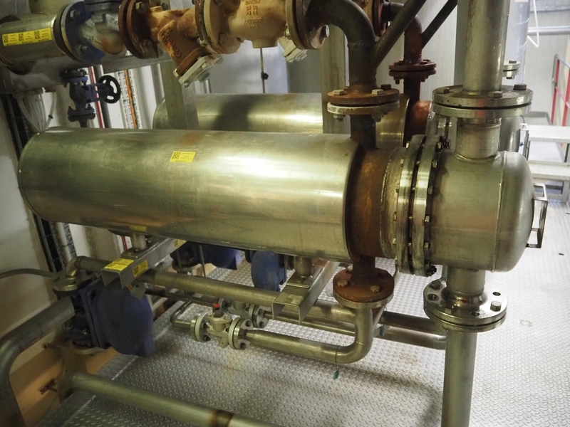 CIP heating skit consisting of 2 Klima tubular heat exchangers, type: (2x) H27-R5 DR.PR. and various valves, dimensions: 1700 mm x 1100 mm x 2000 mm.