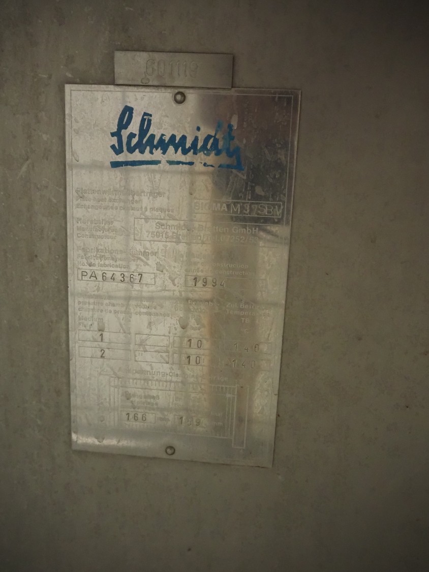 API Schmidt Bretten GmbH & Co. KG plate heat exchanger, type: SIGMA M37SBM, fabrication number: PA64367, year of construction: 1994, dimensions: 1000 mm x 600 mm x 1580 mm.