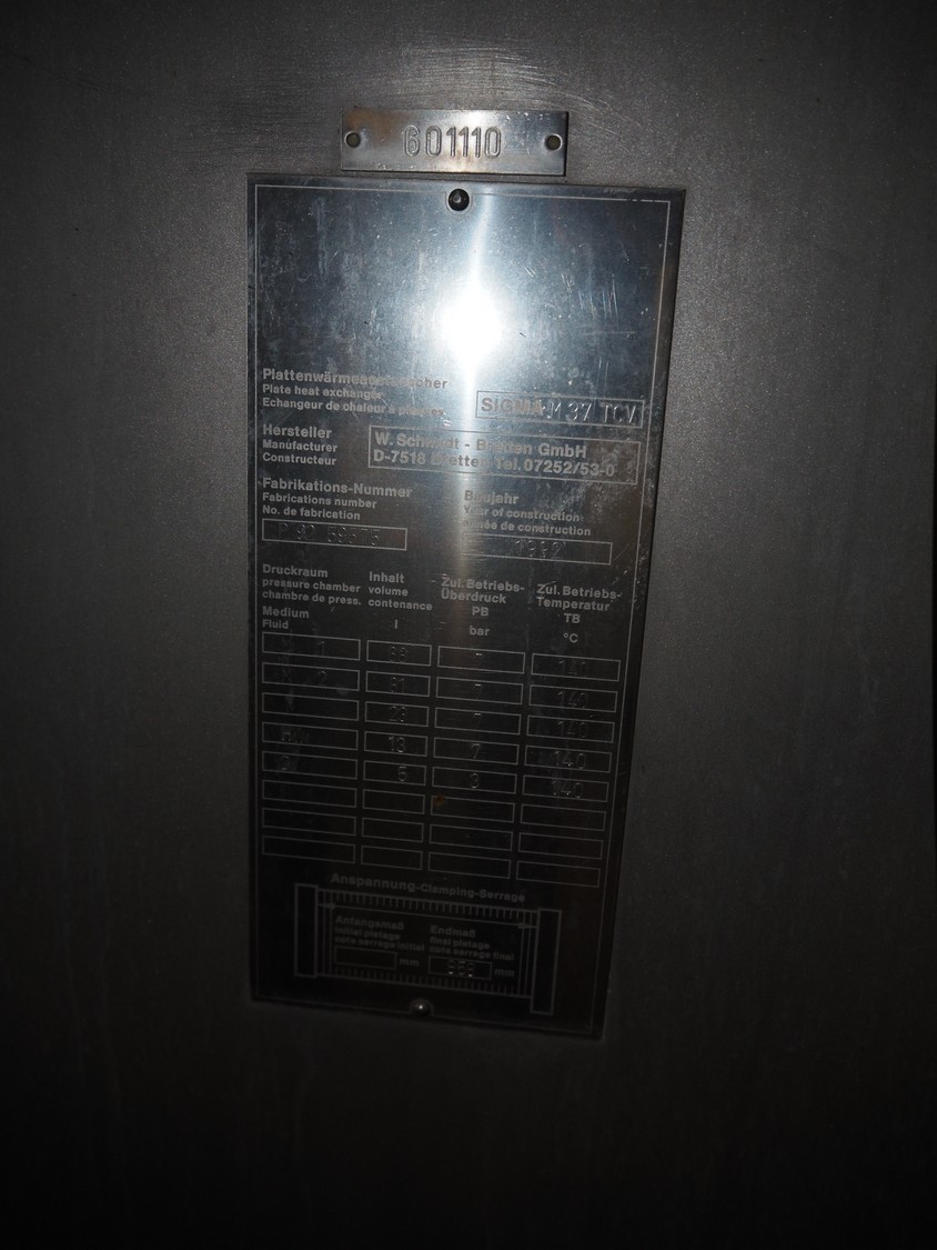 W. Schmidt - Bretten GmbH plate heat exchanger, type: SIGMA M37 TCV, fabrication number: P 92 59575, year of construction: 1992, dimensions: 2450 mm x 1000 mm x 2520 mm.