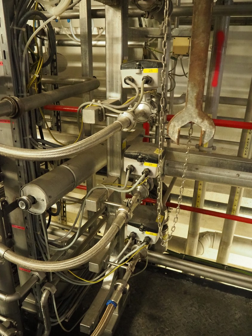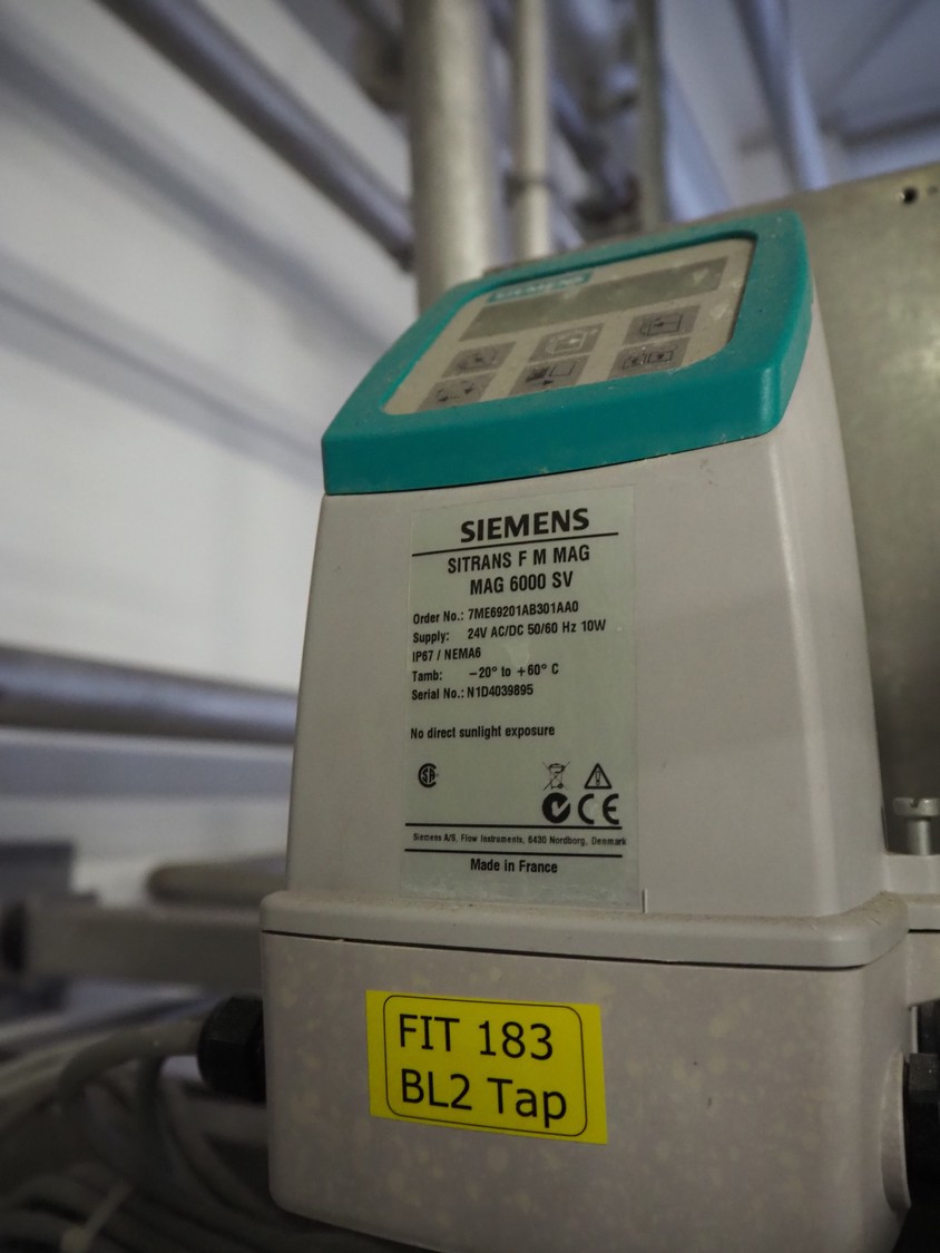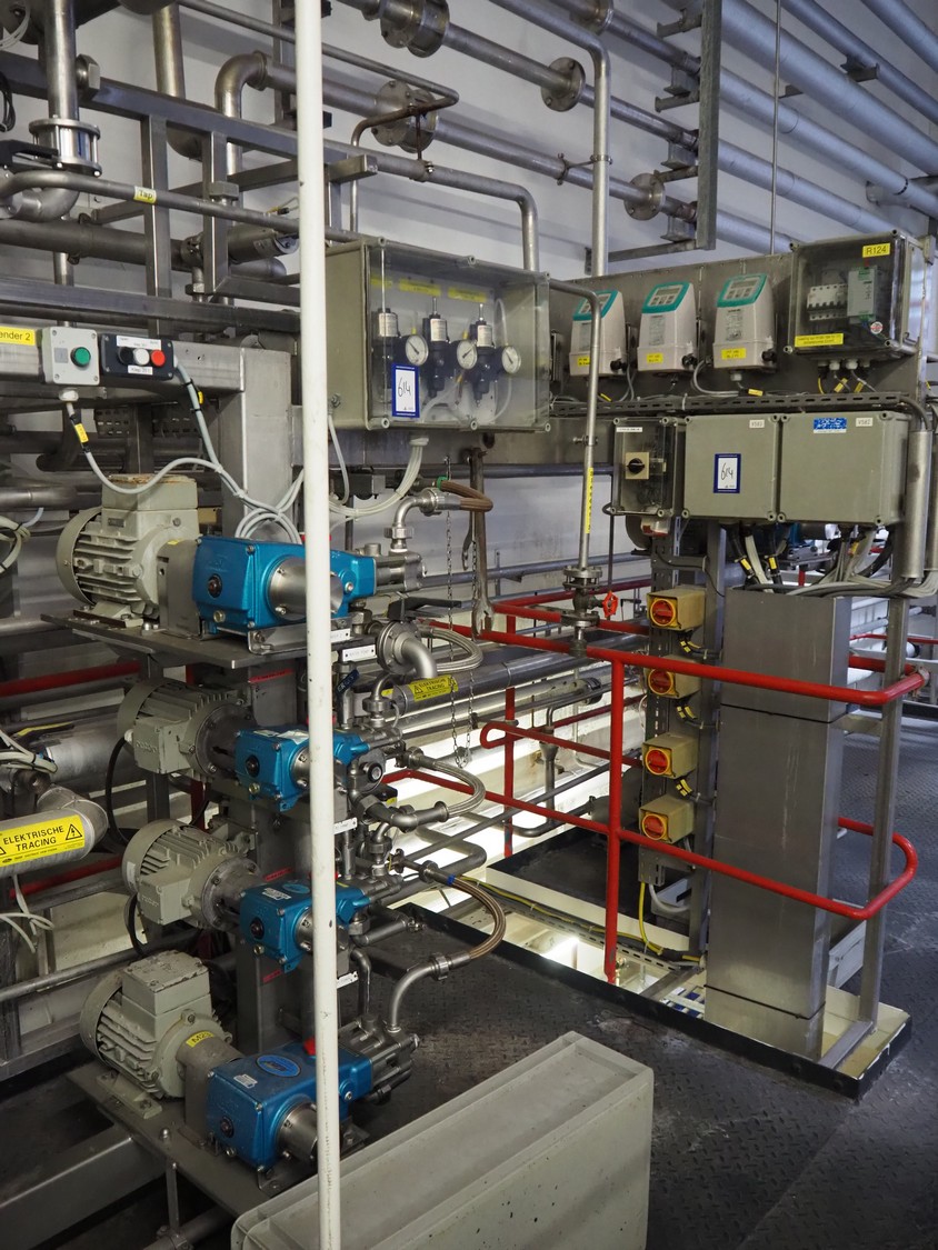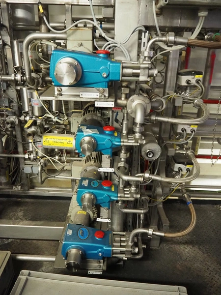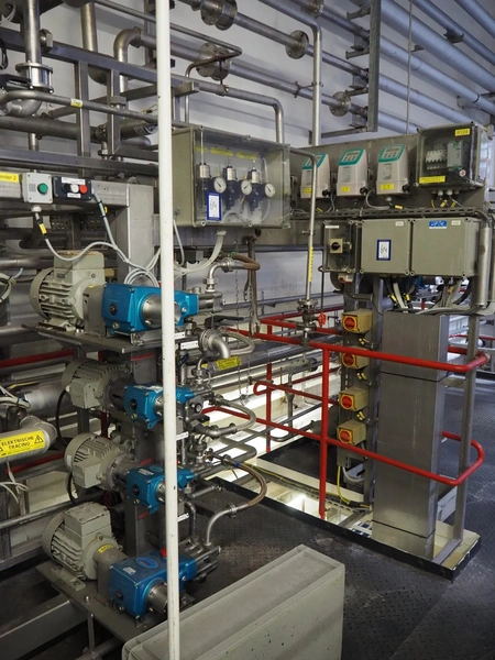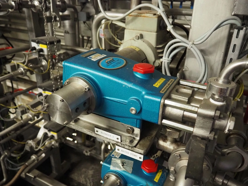 Blender installation consisting of 4 Cat Pumps high pressure positive displacement triplex piston pumps and 4 Siemens flowmeters, type: (3x) SITRANS F M MAG 1100 F, SITRANS FM MAGFLO MAG 1100 FOOD, total dimensions: 1800 mm x 1200 mm x 2050 mm.