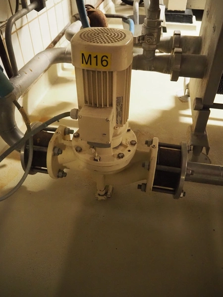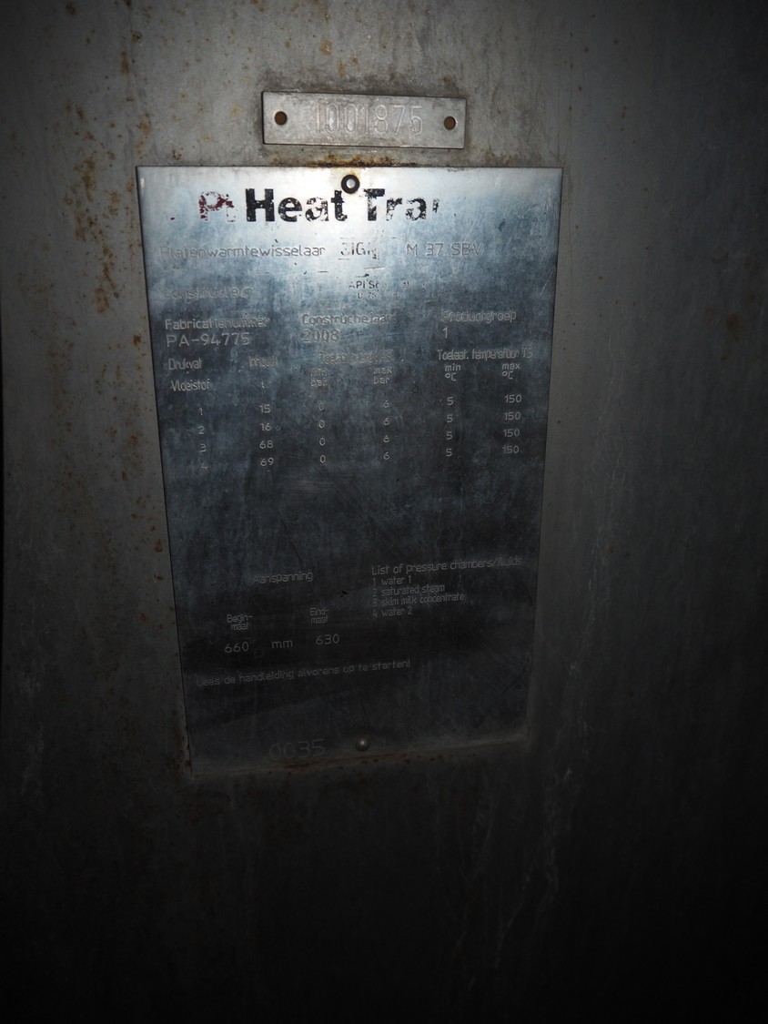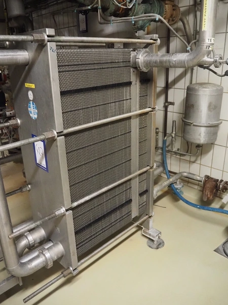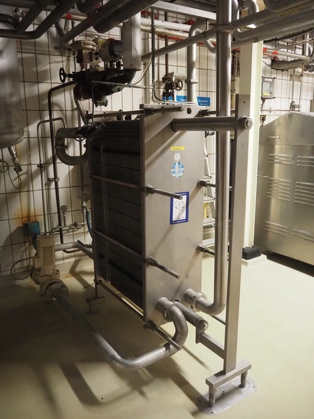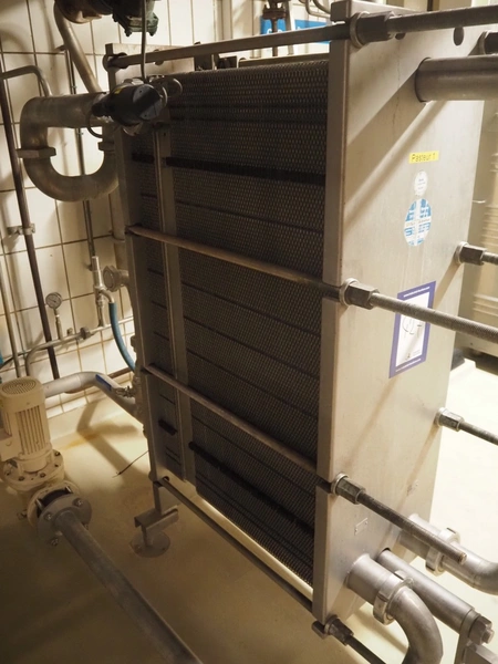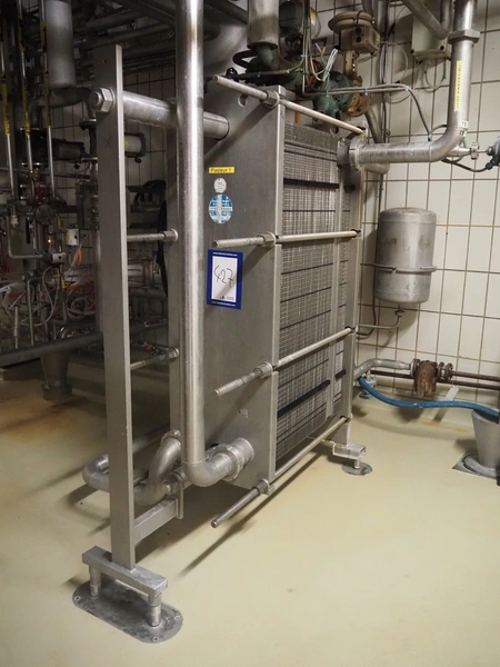 API Schmidt Bretten GmbH & Co. KG plate heat exchanger used as pasteurizer, type: SIGMA M37 SB-V, fabrication number: PA-94775, year of construction: 2008, dimensions: 1500 mm x 600 mm x 1600 mm. Including circulation pump and valves.