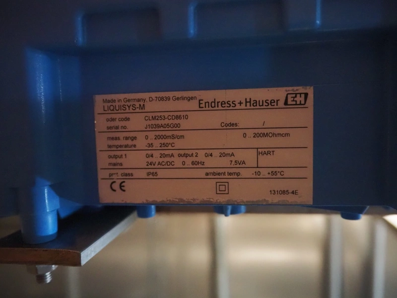 Endress+Hauser conductivity transmitter, type: Liquisys-M CLM253, measuring range: 0-2000mS/cm, temperature range: 35°C-250°C, dimensions: 150 mm x 110 mm x 250 mm.