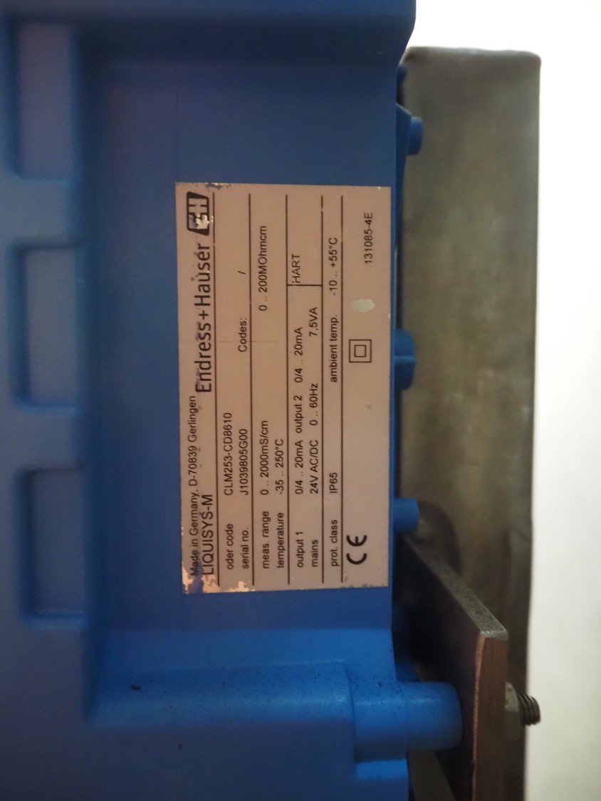 Endress+Hauser conductivity transmitter, type: Liquisys-M CLM253, measuring range: 0-2000mS/cm, temperature range: 35°C-250°C, dimensions: 150 mm x 110 mm x 250 mm.
