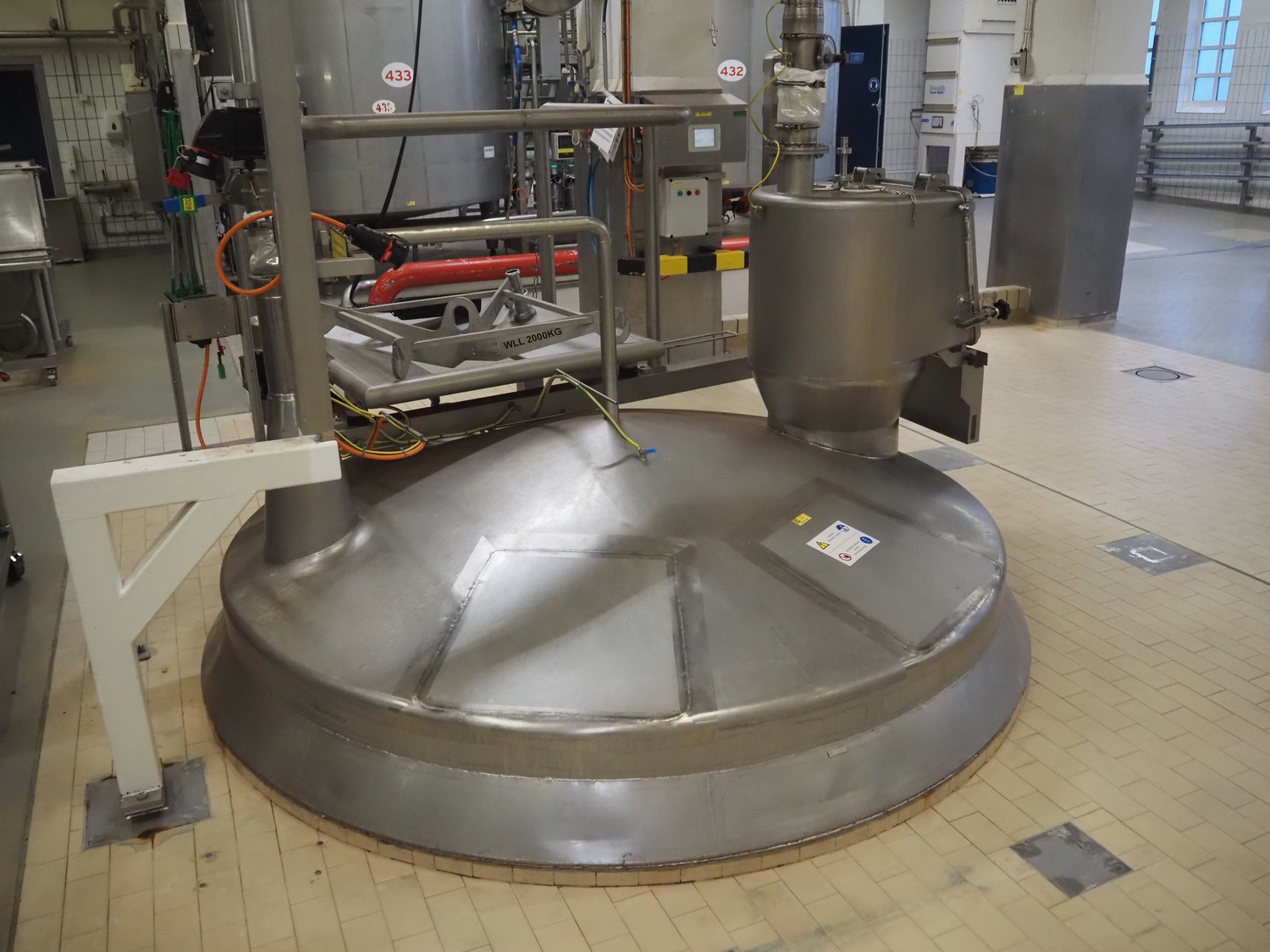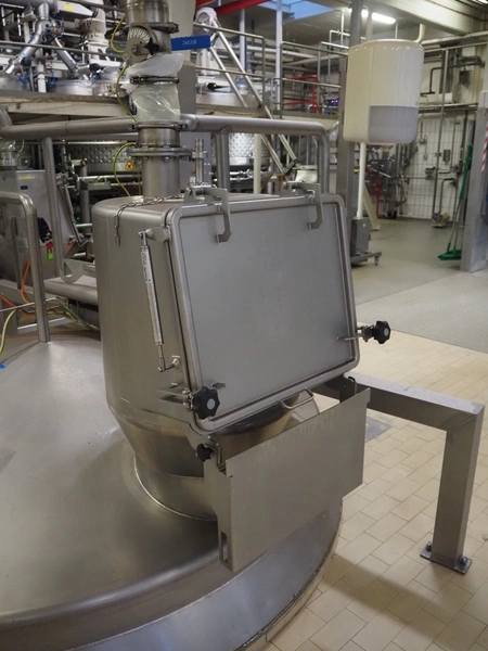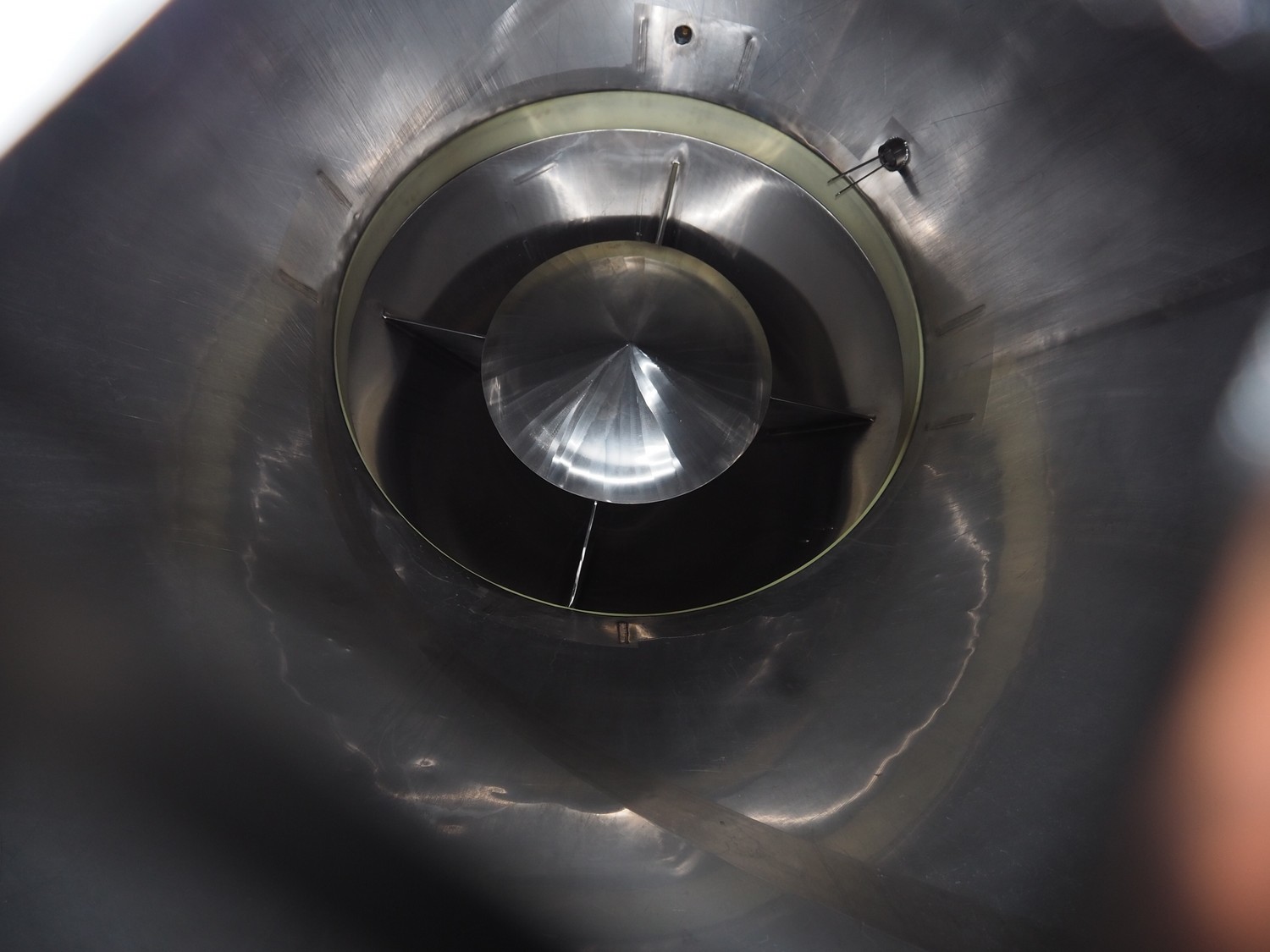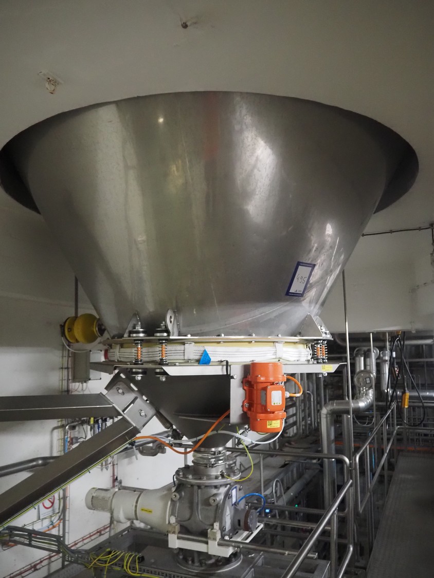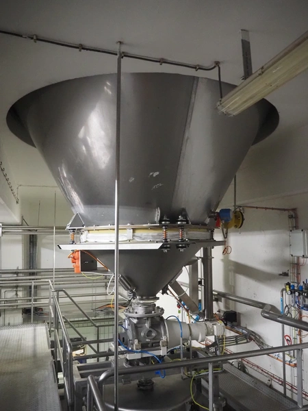S/s powder silo with vibrating base, dimensions: ø 2600 mm x 2800 mm.