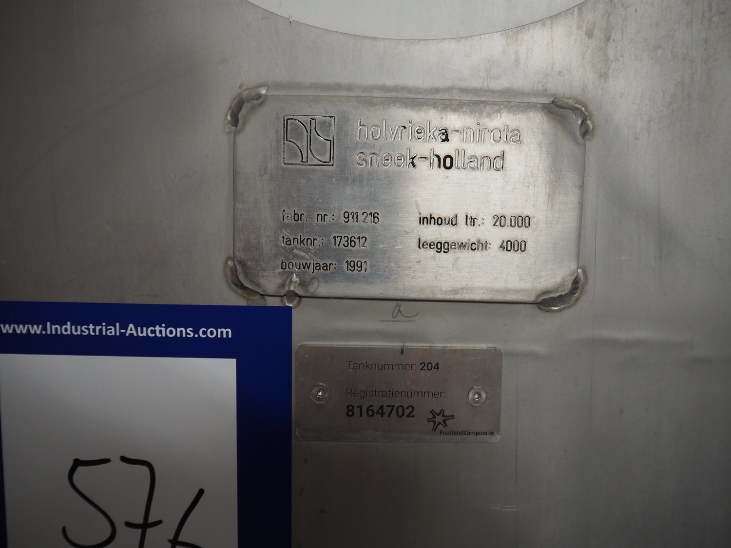 Holvrieka-Nirota s/s double jacketed tank with agitator, fabrication number: 911.216, year of construction: 1991, volume: 20000 litres, empty weight: 4000 kg, dimensions: ø 2650 mm x 7600 mm.