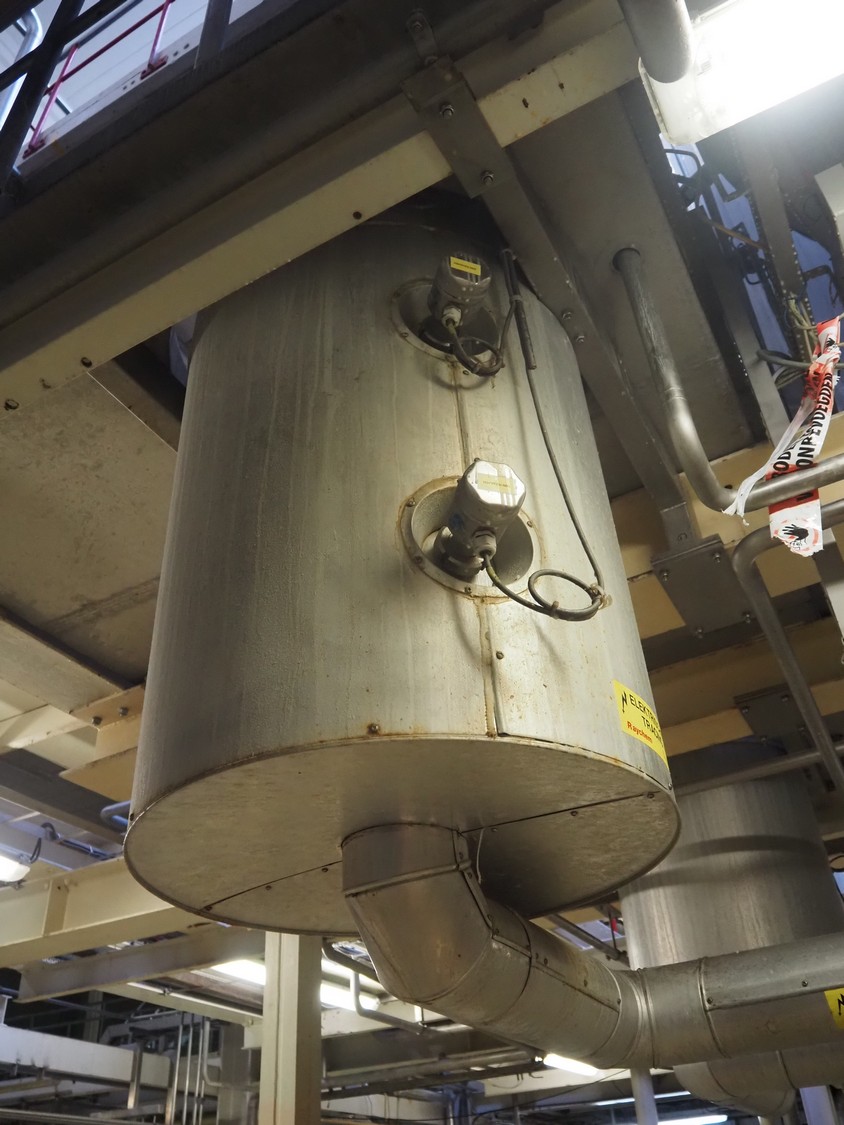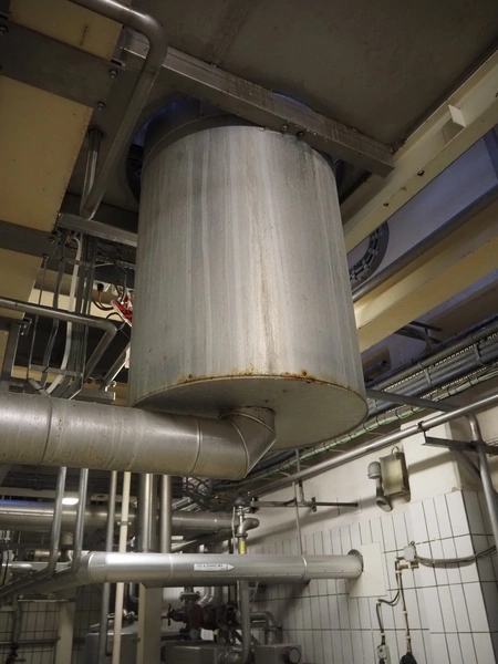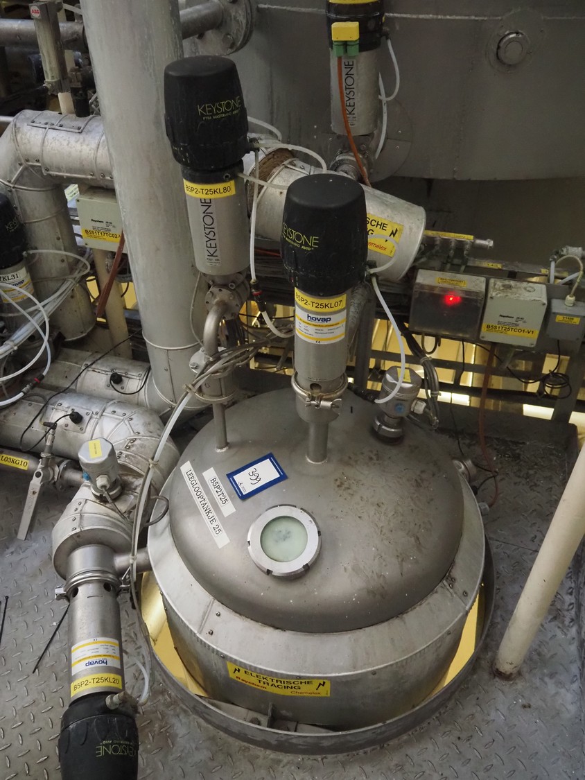 S/s double jacketed discharge tank, dimensions: Ø 650 mm x 1400 mm. Including various valves.