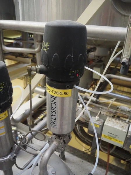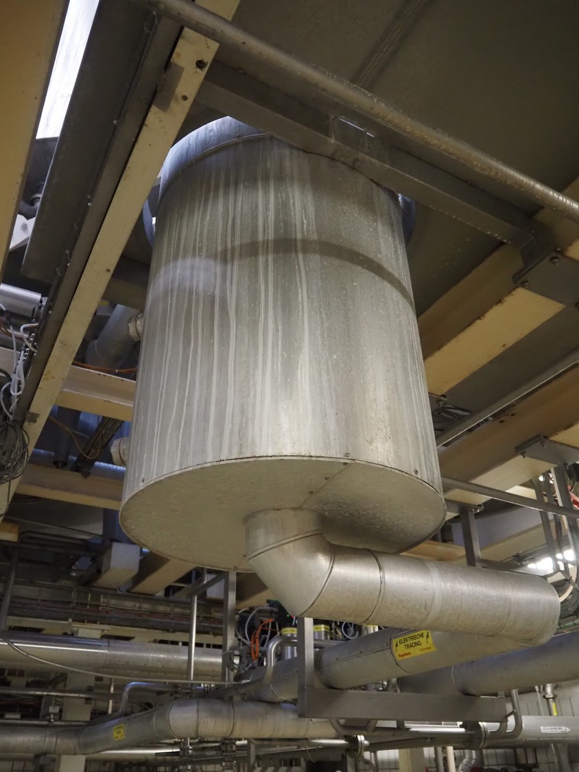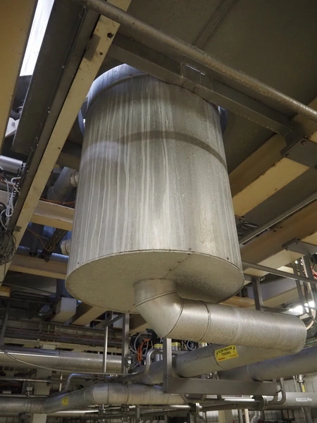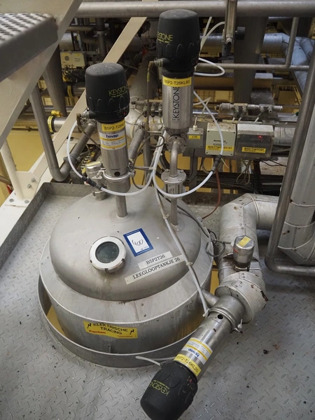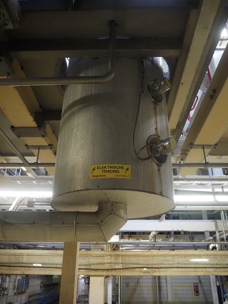 S/s double jacketed discharge tank, dimensions: Ø 650 mm x 1400 mm. Including various valves.