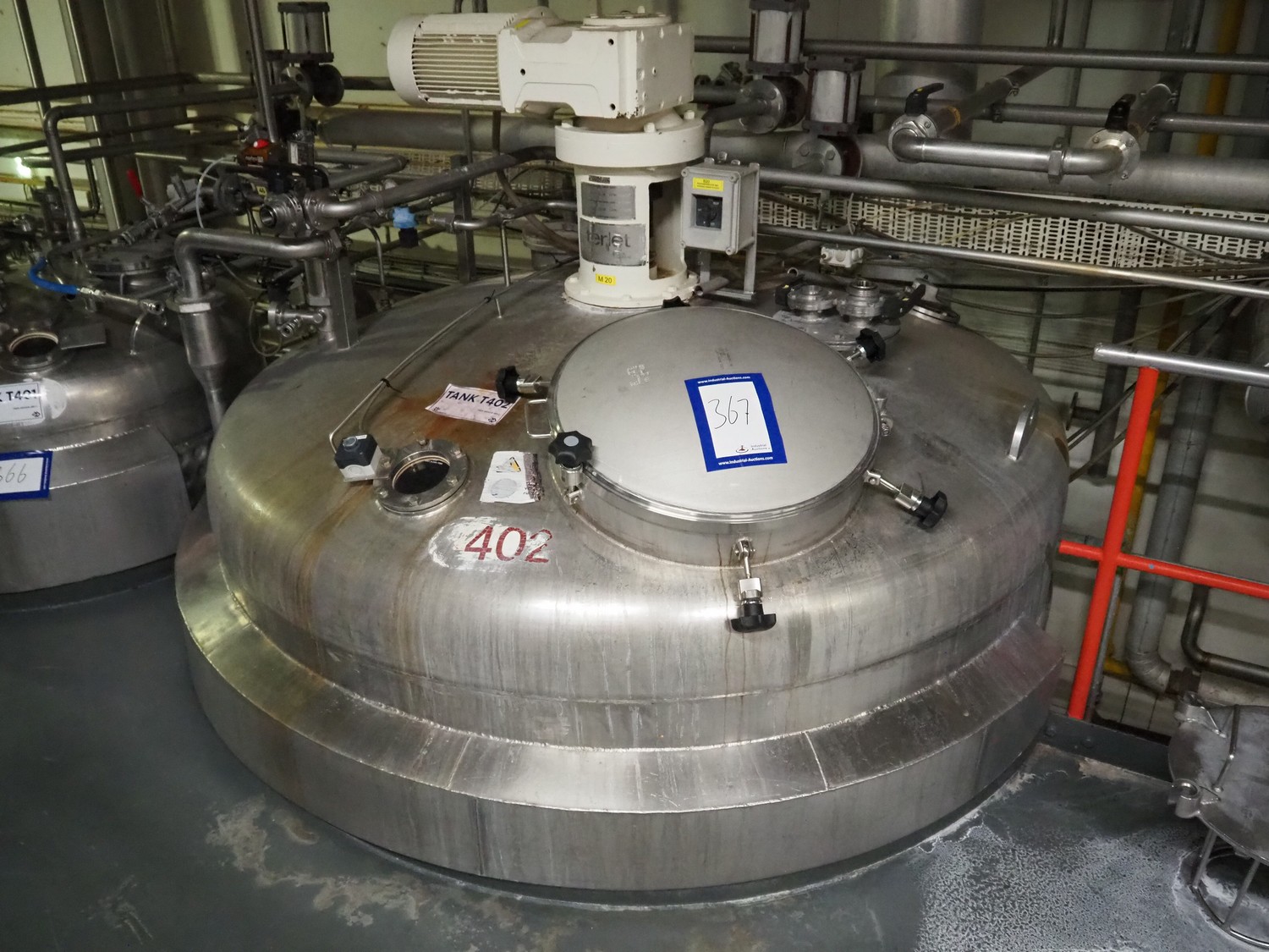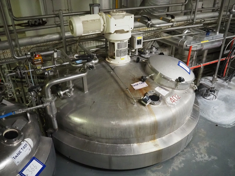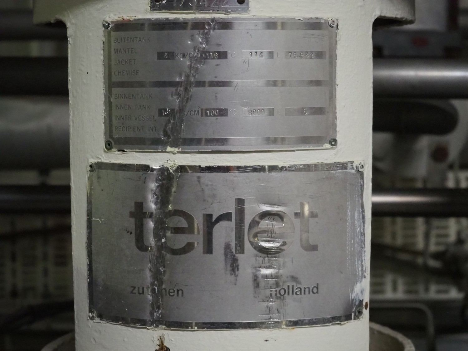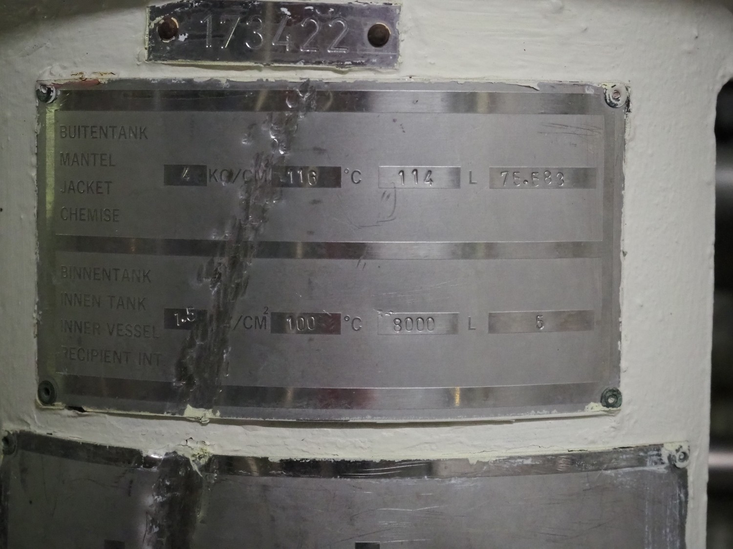 Terlet s/s double jacketed tank with agitator, volume: 8000 litre, dimensions: Ø 2000 mm x 4600 mm.