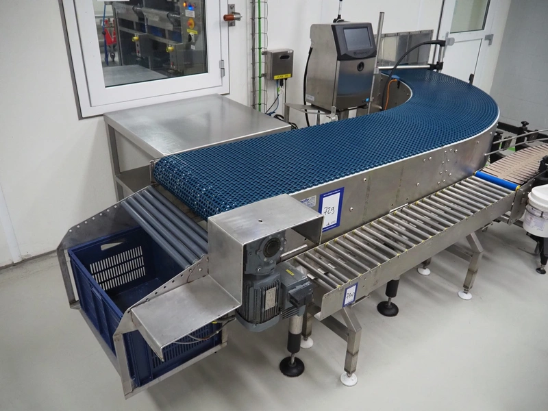 Narviflex 90° curve conveyor, plastic mesh belt, belt width: 595 mm, total dimensions: 3700 mm x 4300 mm x 930 mm.