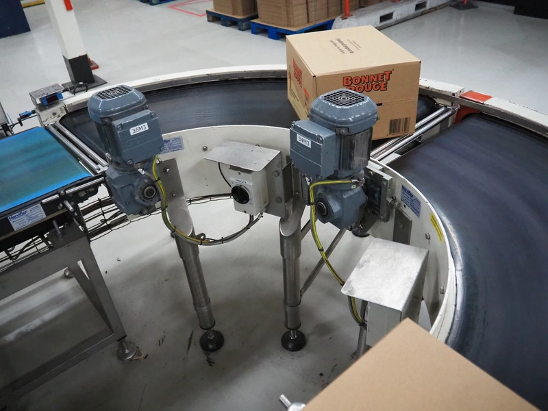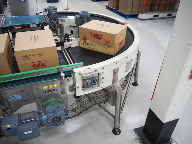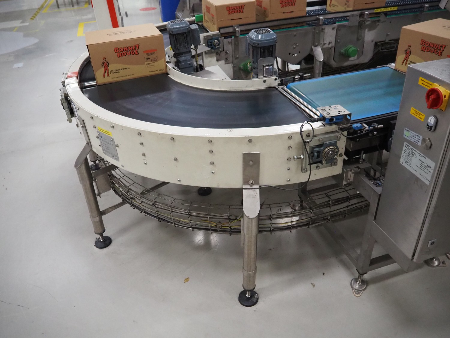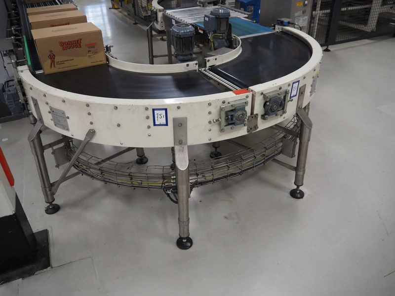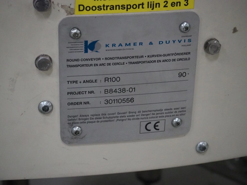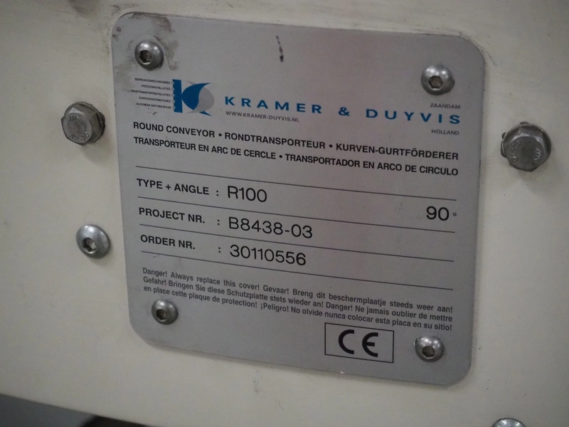 Kramer&Duyvis 180° curve conveyor, type+angle: (2x) R100 90°, plastic belt, belt width: 480 mm, total dimensions: 1200 mm x 2400 mm x 1200 mm.