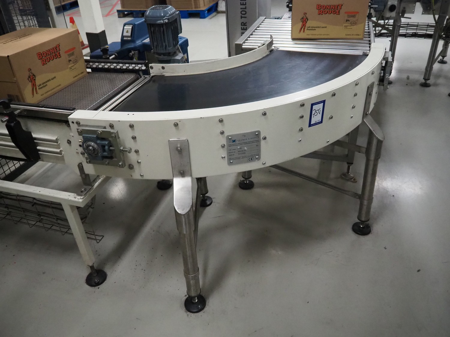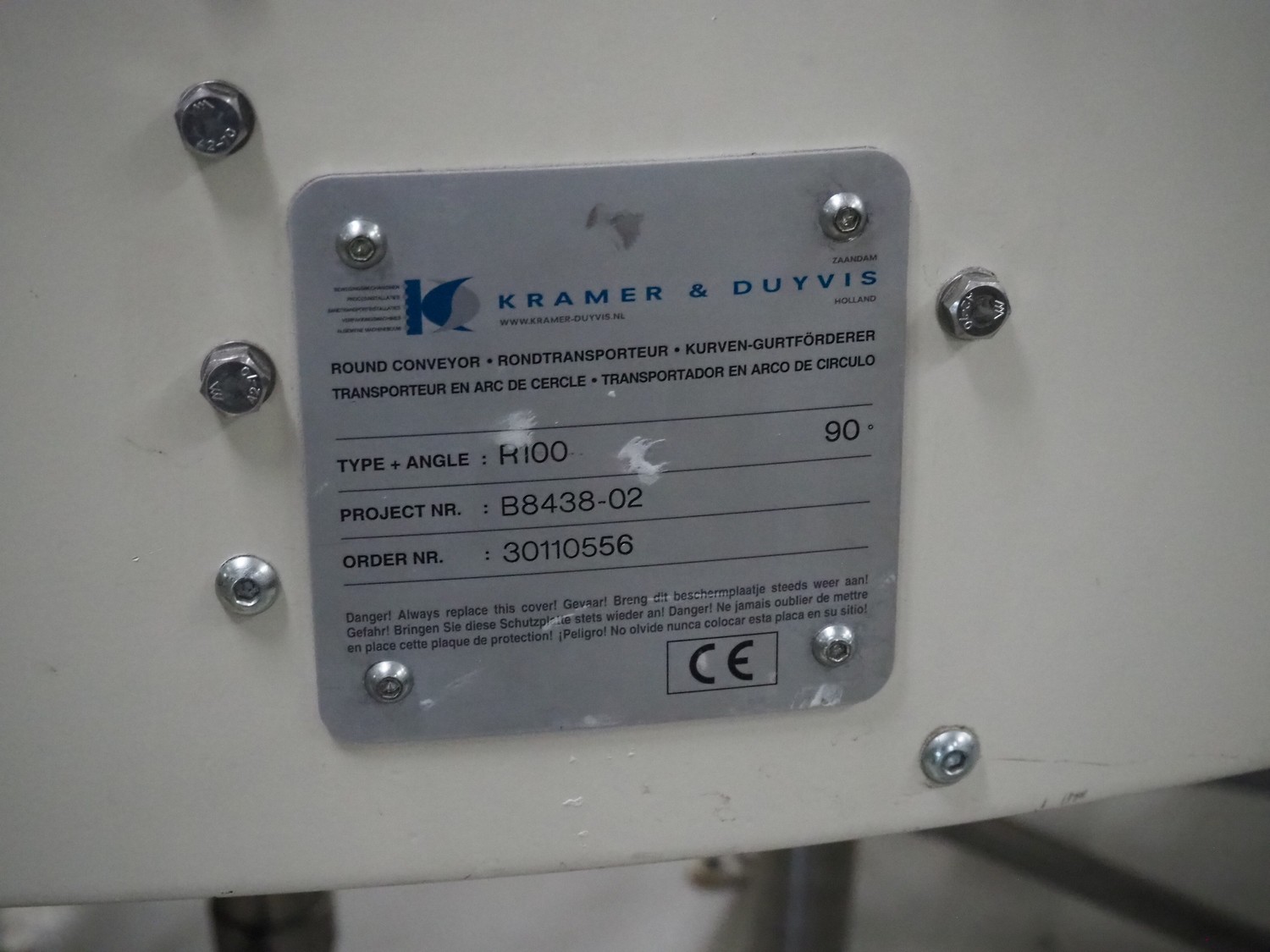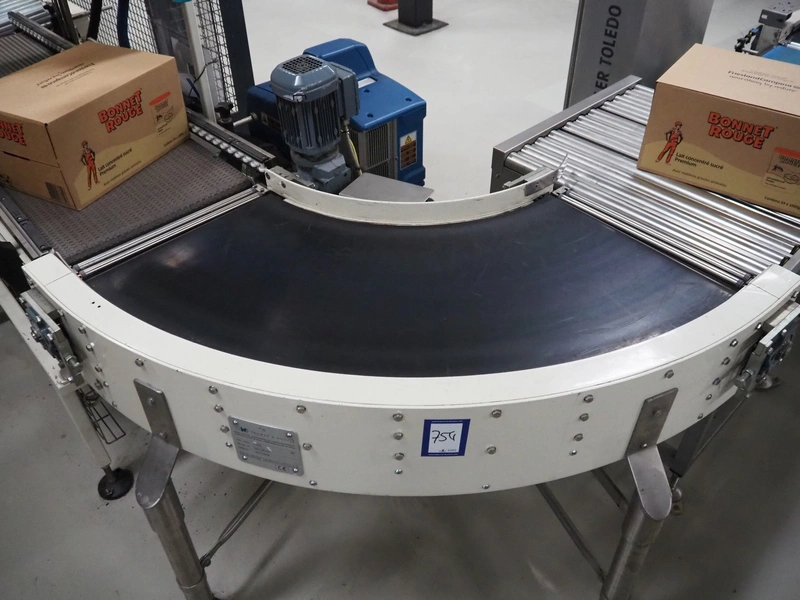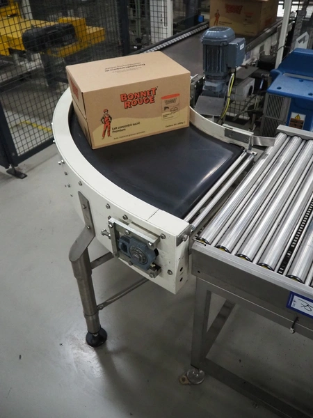 Kramer&Duyvis 90° curve conveyor, type+angle: R100 90°, plastic belt, belt width: 470 mm, total dimensions: 1100 mm x 1200 mm x 1350 mm.