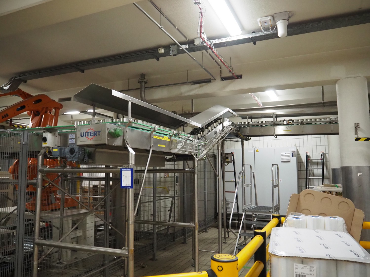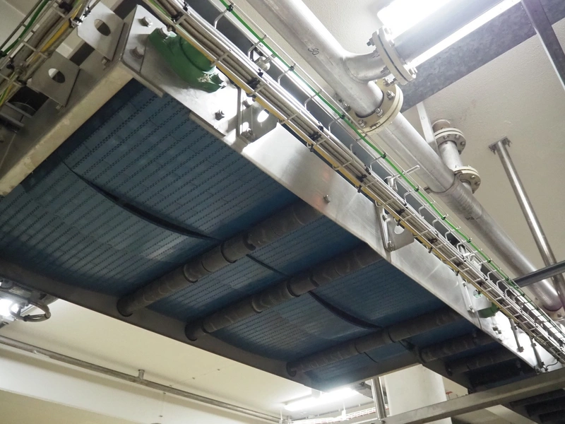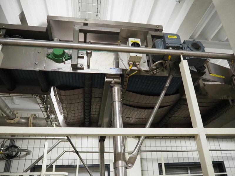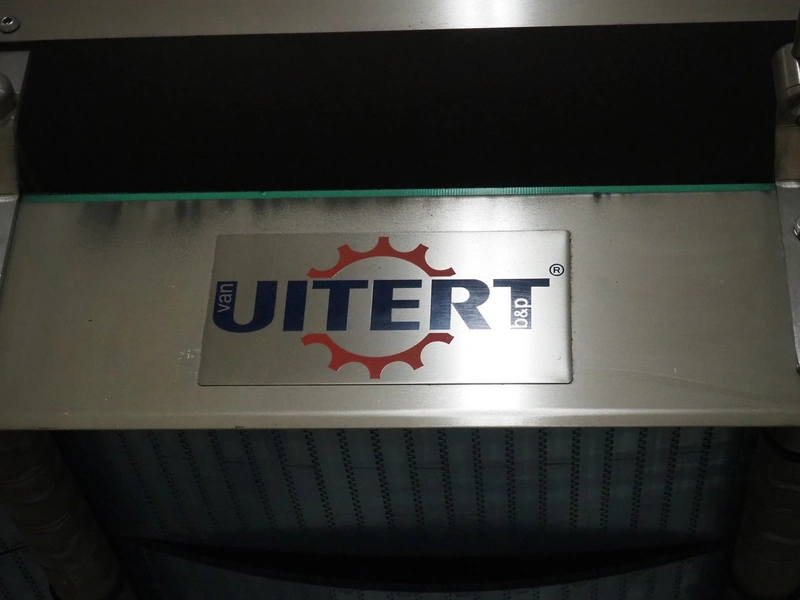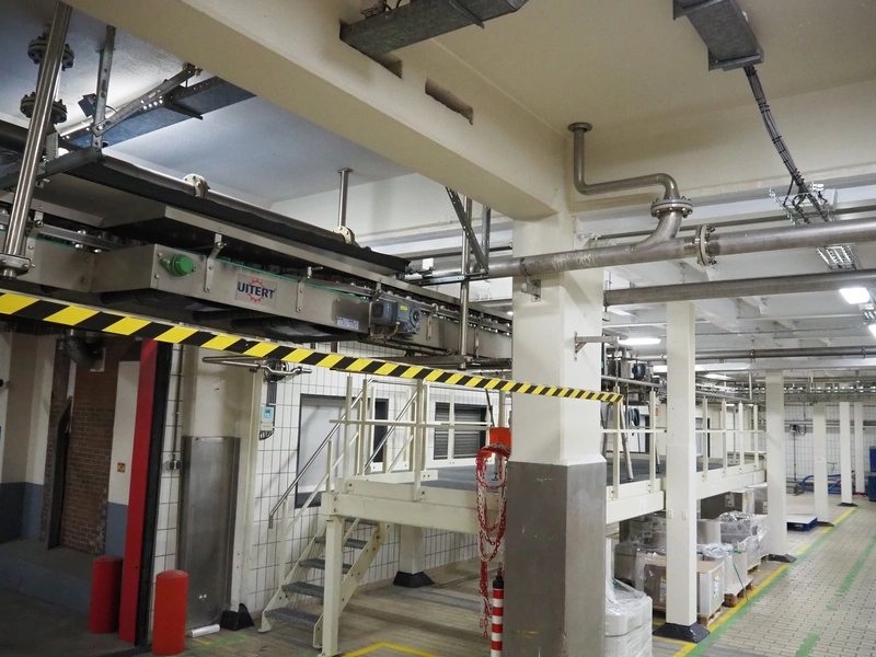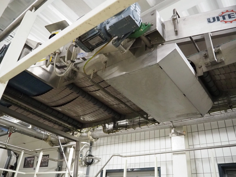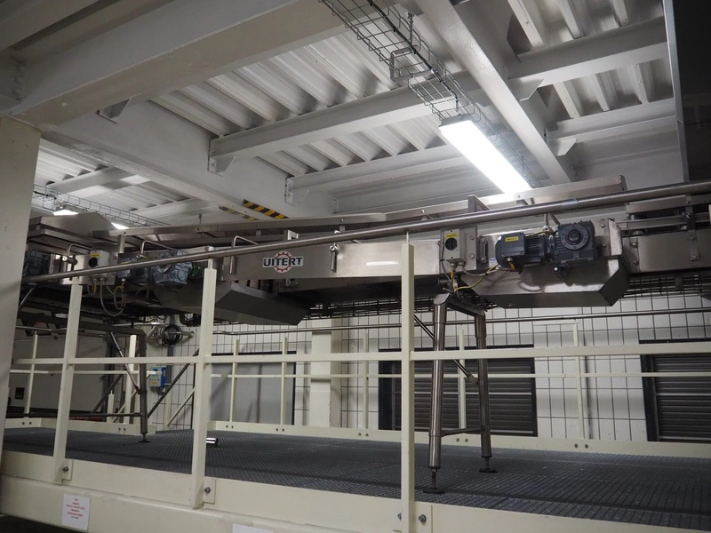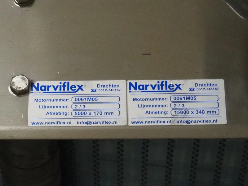 Uitert transport system with plastic belt, belt width: 340 mm and 80 mm, total dimensions: 6000 mm x 1300 mm x 3150 mm and 21000 mm x 14500 mm x 3150 mm.