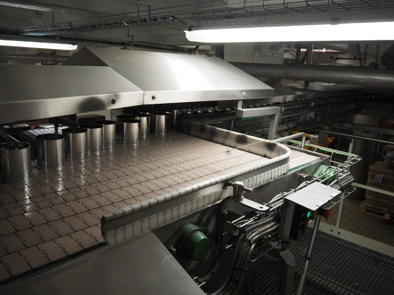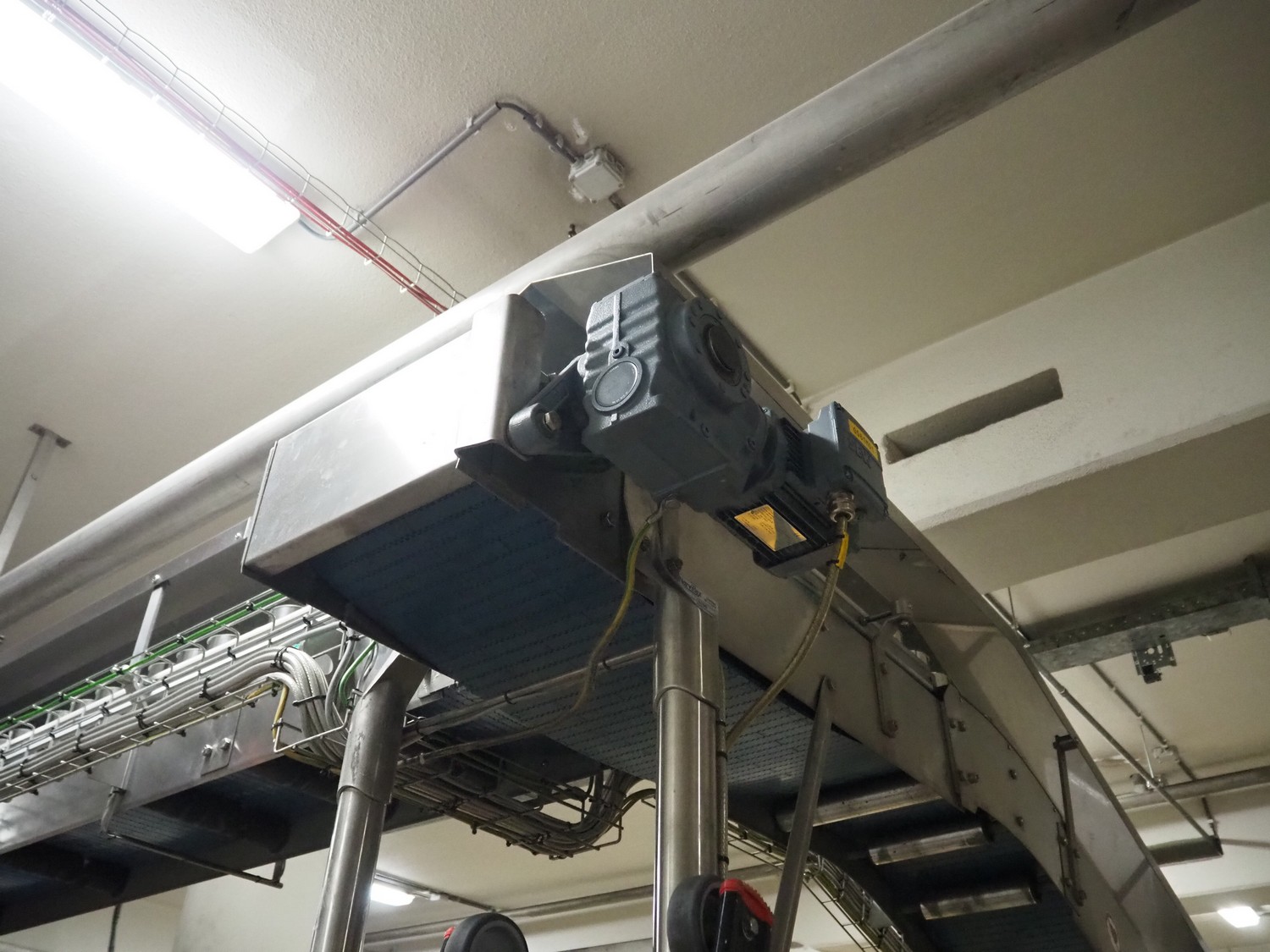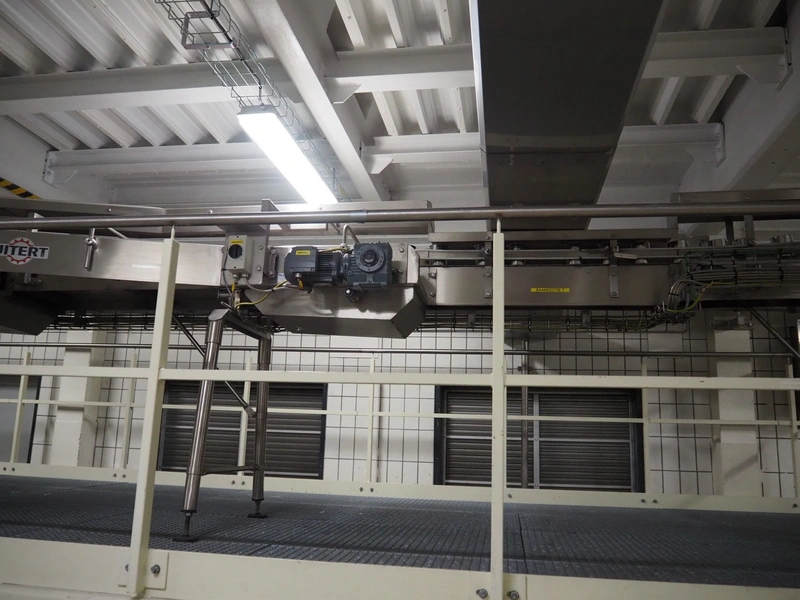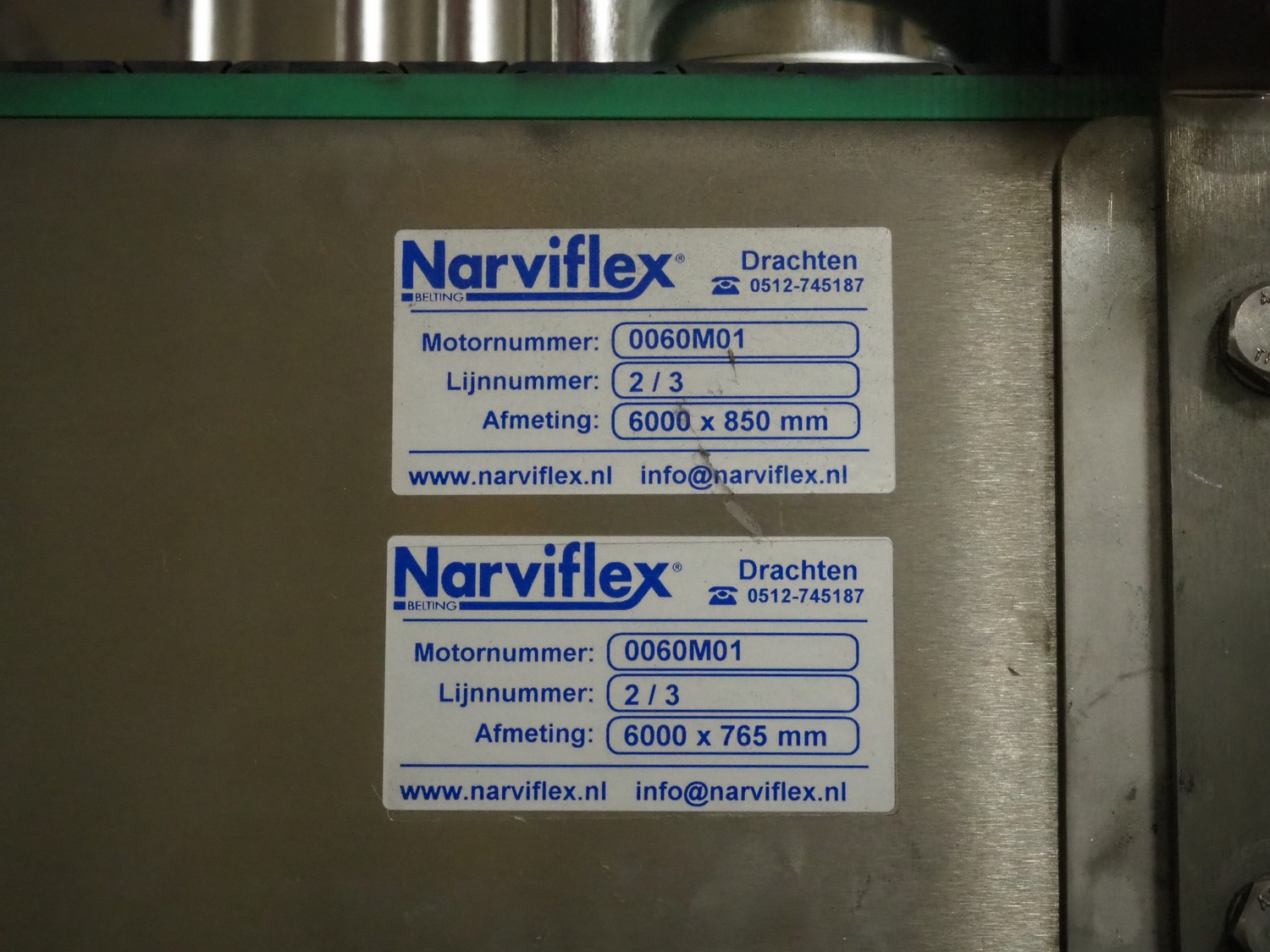 Uitert transport system with plastic belt, belt width: 340 mm and 80 mm, total dimensions: 6000 mm x 1300 mm x 3150 mm and 21000 mm x 14500 mm x 3150 mm.