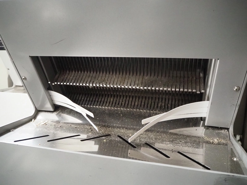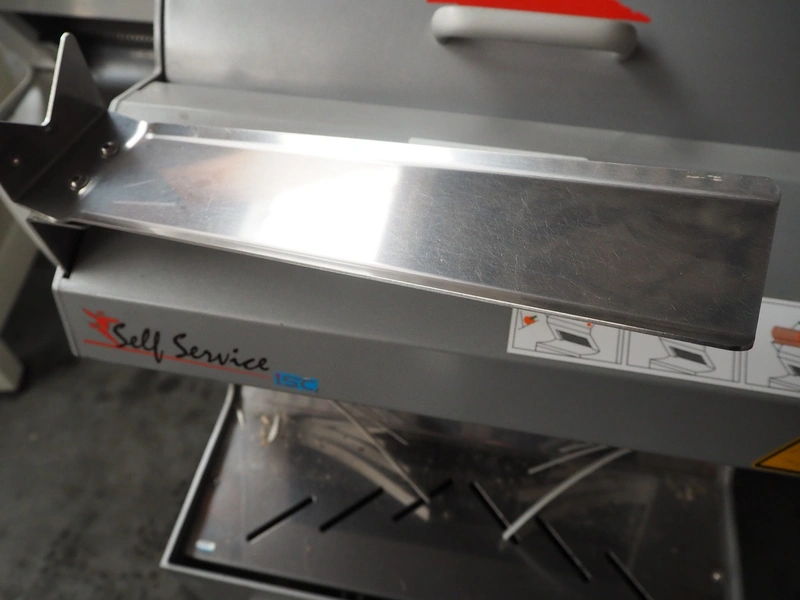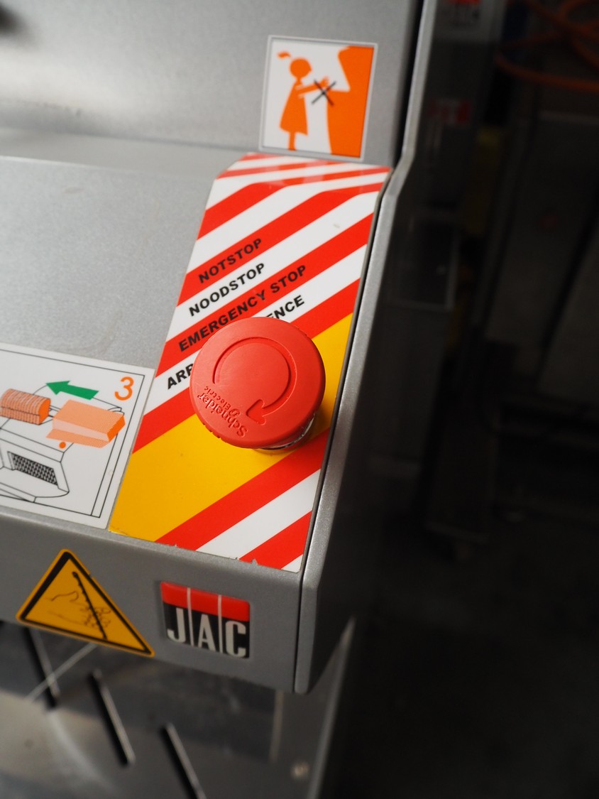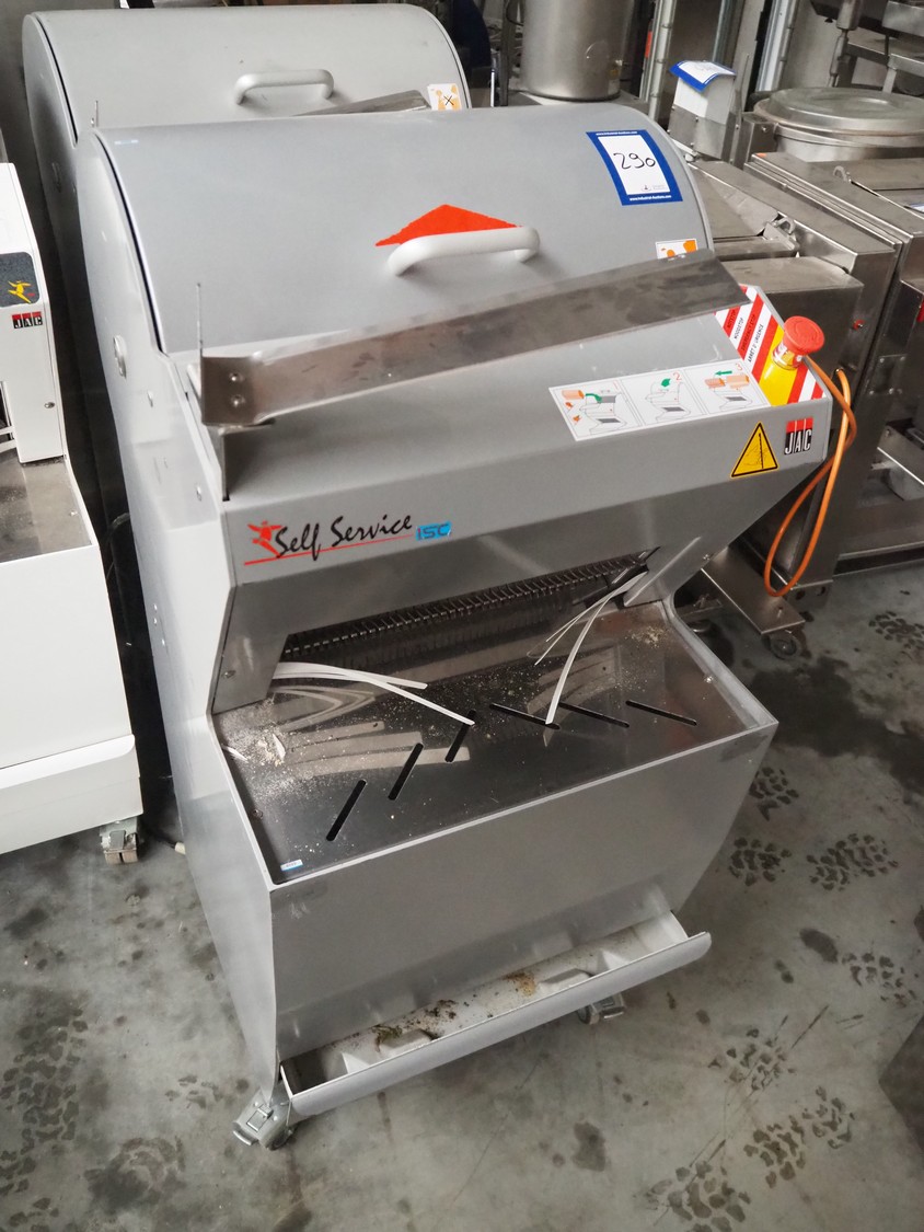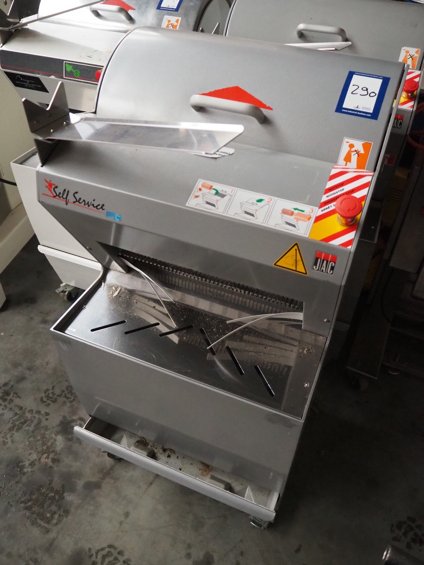 Jac mobile bread slicer, model: SLD 450/10, machine number: 13102019, year of construction: 20/06/2013, 400 V, 3 Ph, 50/60 Hz, 1.50 A, 0.49 kW, weight: 230 kg, working width: 410 mm, distance between knives: 10 mm, total dimensions: 700 mm x 600 mm x 1300 mm.