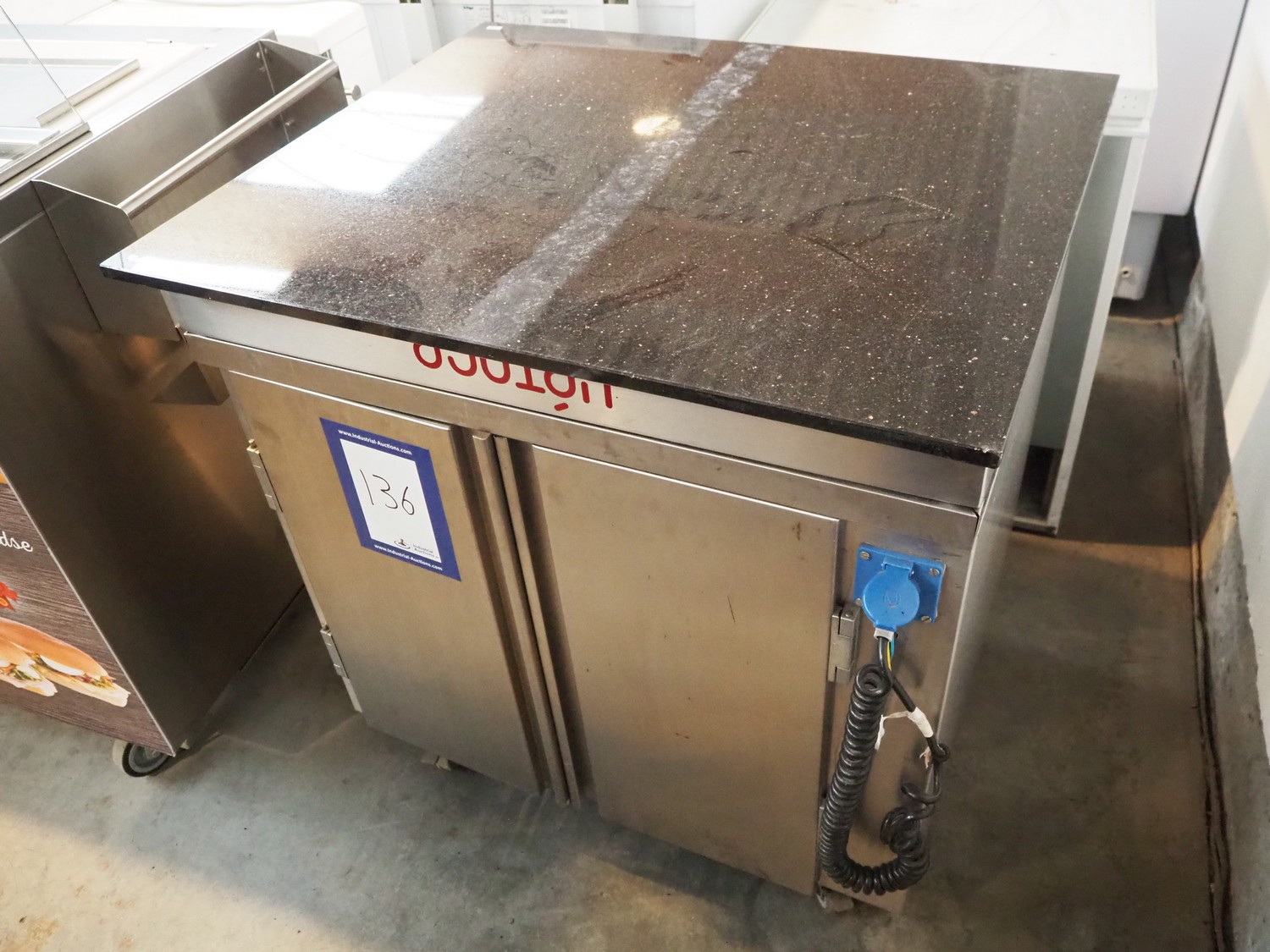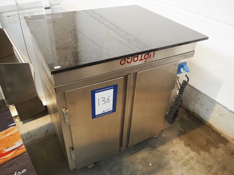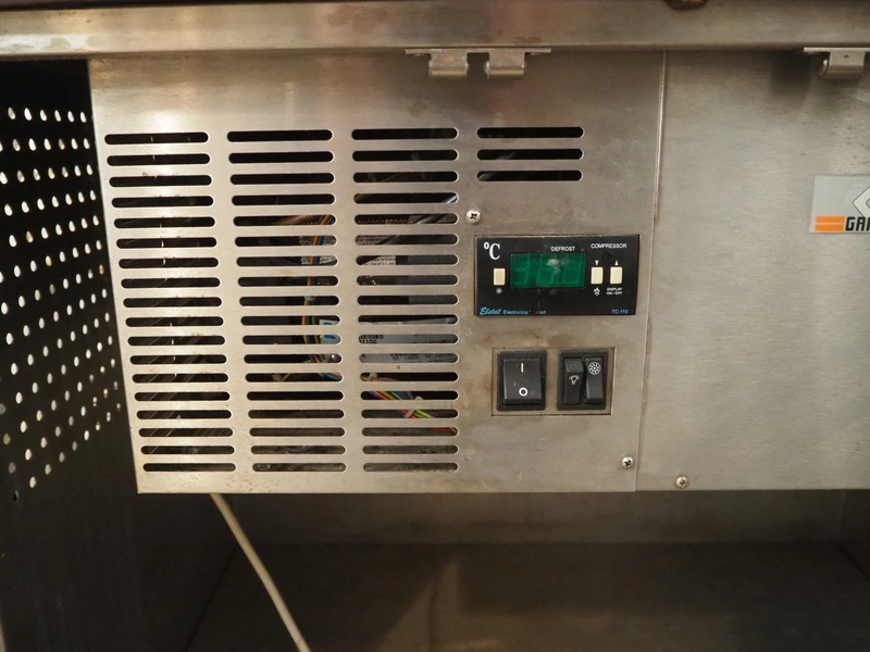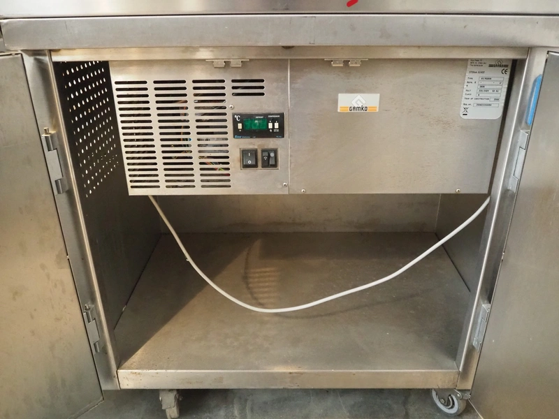 Gamko mobile refrigerated counter, type: AV/MU84N, year of construction: 2006, 220/240 V, 50 Hz, 380 W, top dimensions: 870 mm x 750 mm, total dimensions: 870 mm x 750 mm x 920 mm.