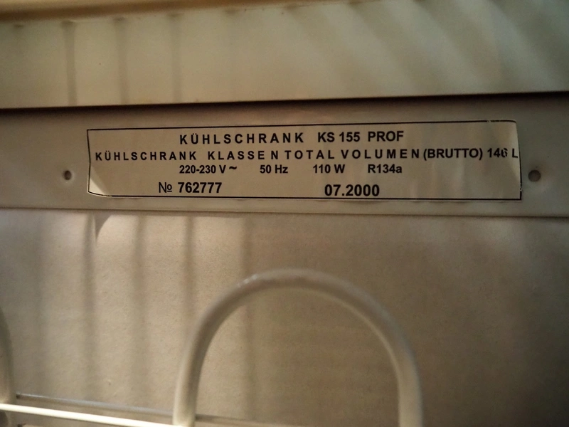 Kühlschrank refrigerator, model: KS 155 PROF, serial number: 762777, year of construction: 07.2000, 220/230 V, 50 Hz, 110 W, refrigerant: R134a, 6 floors, floor dimensions: (6x) 500 mm x 340 mm, total dimensions: 630 mm x 580 mm x 840 mm.