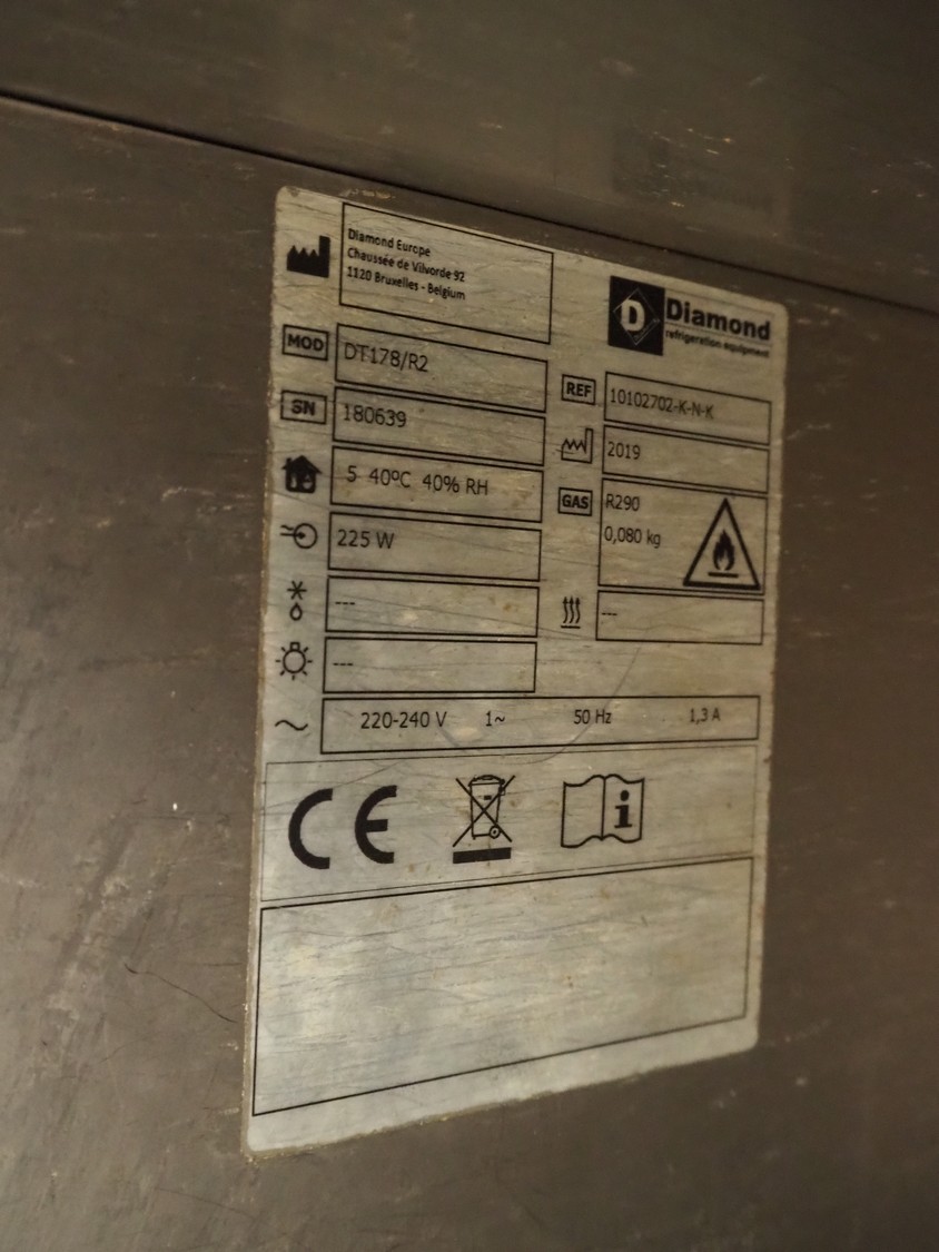 Diamond refrigerated counter, model: DT178/R2, serial number: 180639, year of construction: 2019, 220/240, 1 Ph, 50 Hz, 1.3 A, dimensions: 1750 mm x 700 mm x 840 mm.