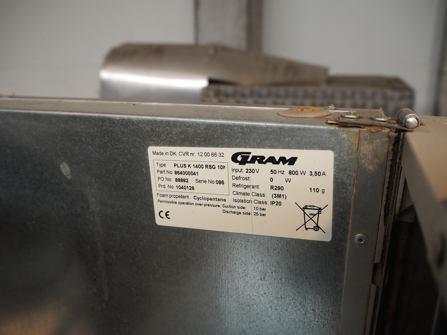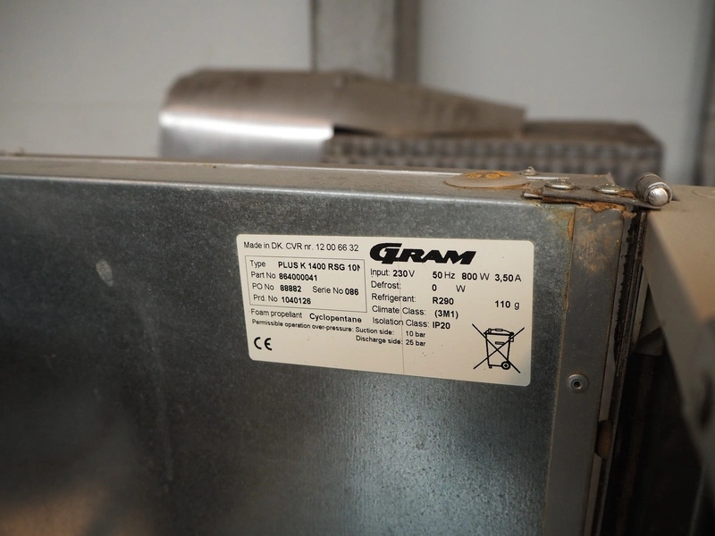 Gram refrigerator, type: PLUS K 1400 RSG 10 M, number: 12 00 66 32, serial number: 086, 230 V, 50 Hz, 800 W, 3.50 A, refrigerant: R290, 110 g, dimensions: 1400 mm x 850 mm x 2160 mm.