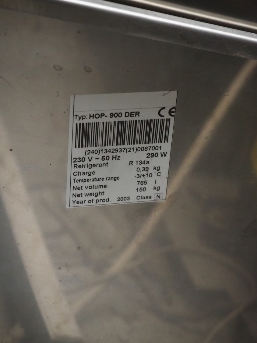 Refrigerator, type: HOP-900 DER, year of construction: 2003, 230 V, 290 W, refrigerant: R134a, weight: 150, volume: 765 L, 8 floors, floor dimensions: (8x) 800 mm x 600 mm, total dimensions: 1000 mm x 800 mm x 2000 mm.