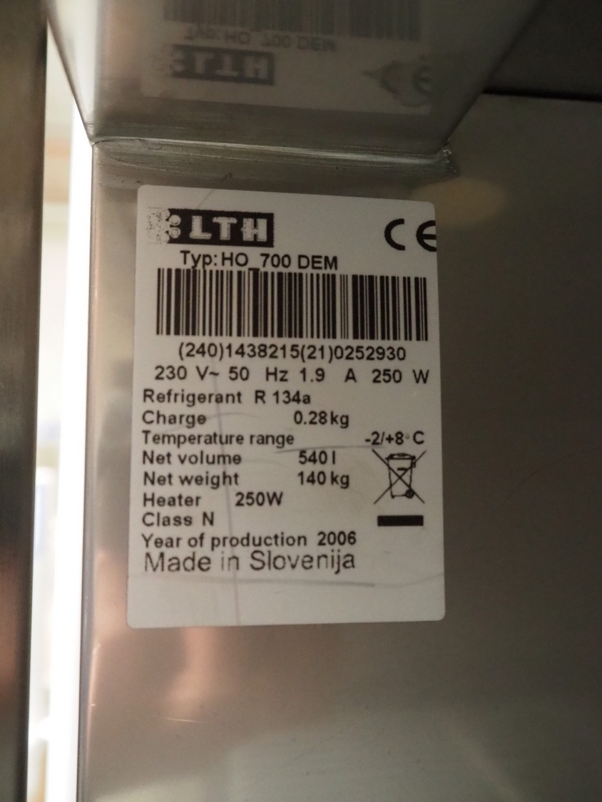 LTH refrigerator, type: HO_700 DEM, year of construction: 2006, 230 V, 50 Hz, 1.9 A, 250 W, Netto volume: 540 liter, Netto weight: 140 kg, refrigerant: R 134a - 0.28 kg, temperature range: -2/+8 °C, dimensions: 700 mm x 800 mm x 2000 mm.