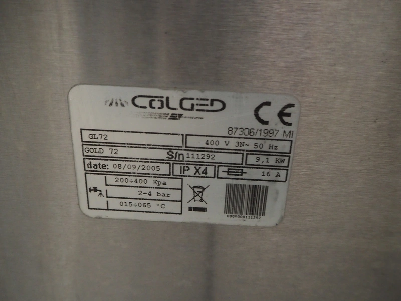 Colged dishwasher, model: GL72, serial number: 111292, year of construction: 08/09/2005, 400 V, 3 Ph, 50 Hz, 16 A, clearance: 500 mm x 500 mm, total dimensions: 830 mm x 700 mm x 1570 mm.