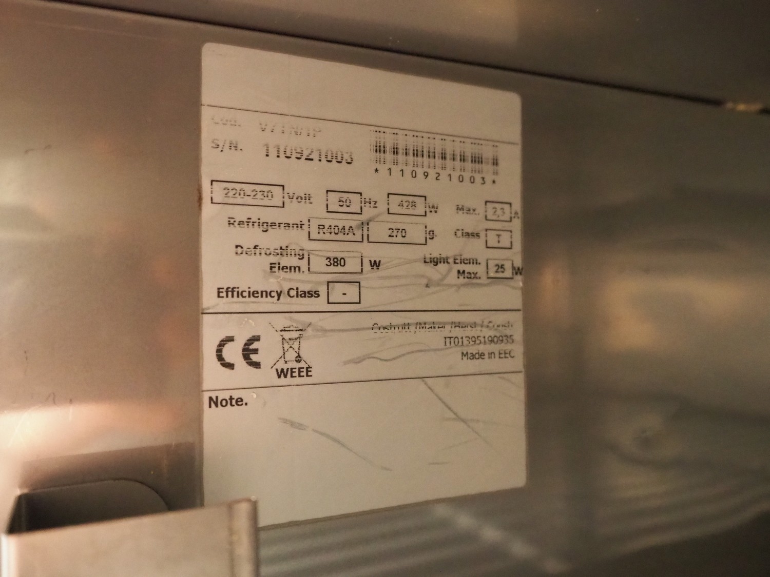 Rivacold freezer, serial number: 110921003, 220/230 V, 1 Ph, 50 Hz, 2.3 A, 380 W, refrigerant: R404A, 6 floors, floor dimensions: 650 mm x 530 mm, total dimensions: 810 mm x 730 mm x 2100 mm.