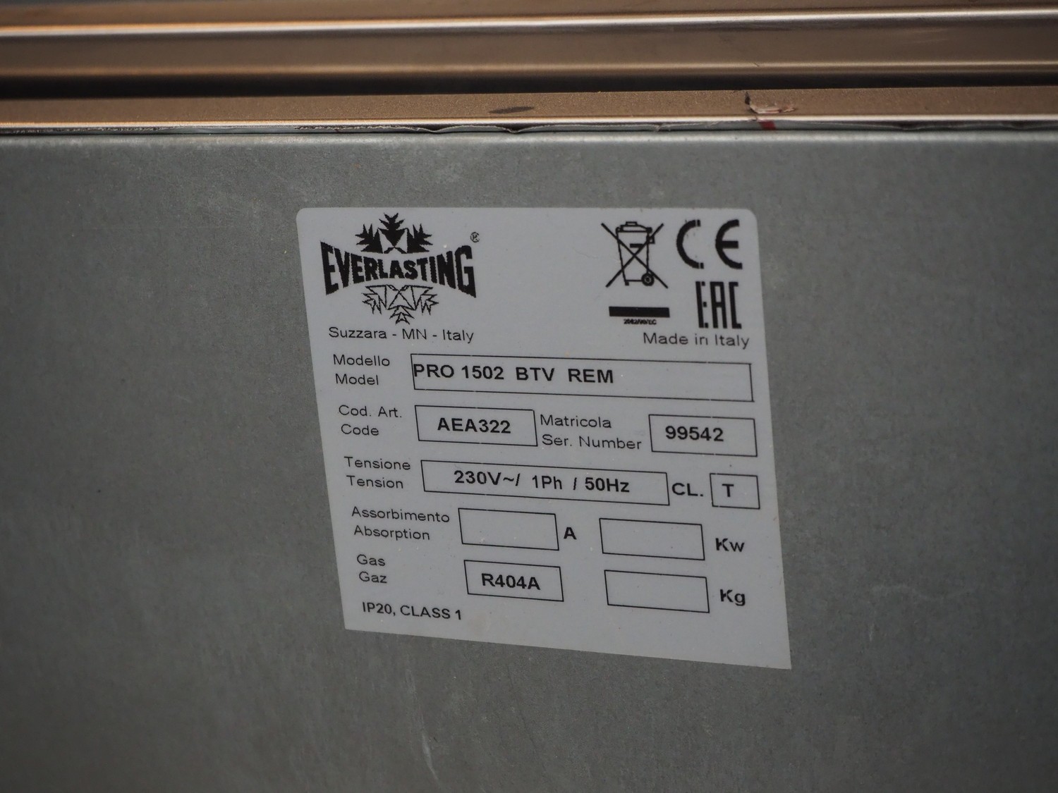 Everlasting double doors freezer, model: PRO 1502 BTV REM, serial number: 99542, 230 V, 1 Ph, 50 Hz, refrigerant: R404A, 8 floors, dimensions freezer: 1500 mm x 830 mm x 2090 mm. With Silensys cool motor, model: SJ80530202, serial number: 16B10 072936 SJ80530202, 220/240 V, 1 Ph, 50 Hz, 4.1 A, dimensions: 950 mm x 600 mm x 850 mm.
