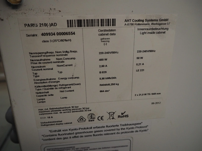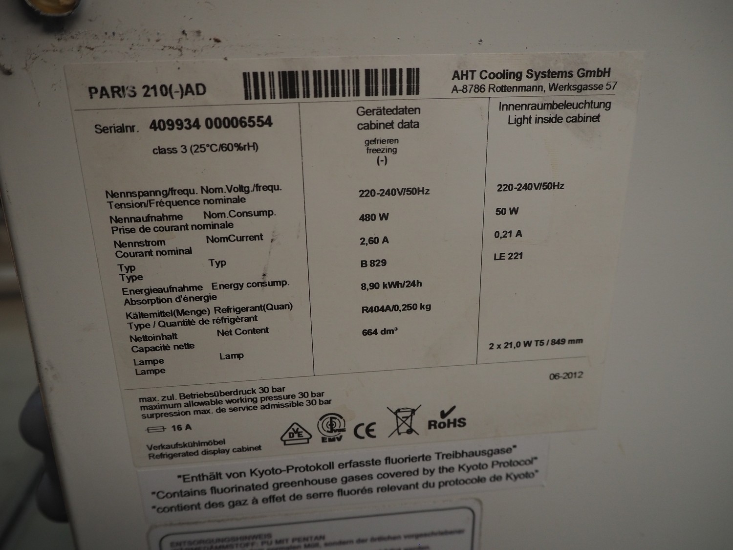 AHT freezer, type: PARIS: 210, serial number: 409934 00006554, year of construction: 06/2012, 220-240 V, 50 Hz, 2.6 A, 480 W, refrigerant: R404A/0.250 kg, capacity: 664 dm³, total dimensions: 1870 mm x 860 mm x 840 mm.