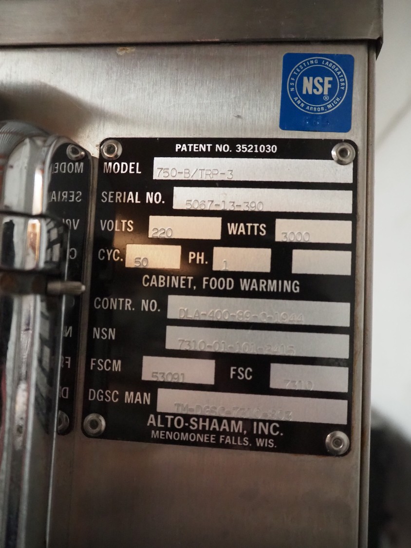 Alto-Shaam mobile warming cabinet, model: 750-B/TRP-3, serial number: 5067-13-390, 220 V, 1 Ph, 3000 W, (3x) 12 floors, dimensions floors: (12x) 650 mm x 540 mm, total dimensions: 820 mm x 730 mm x 1920 mm.