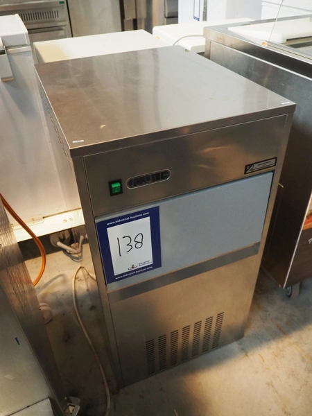 Flake ice machine with bunker, model: IMS-100, serial number: SHS100 1018028, 230 V, 50 Hz, 12.4 A, 520 W, netto weight: 58 kg, refrigerant: R134A, 130 g, capacity: 100 kg per hour, dimensions: 500 mm x 610 mm x 930 mm.