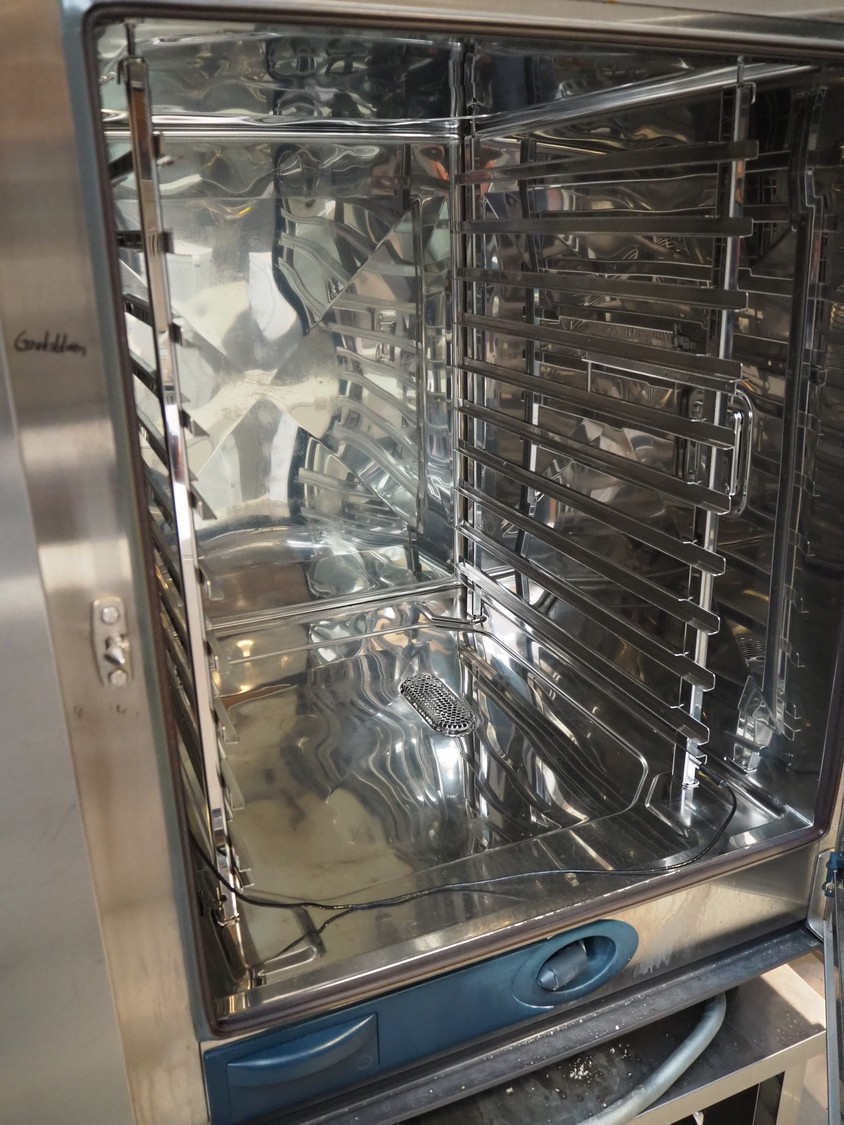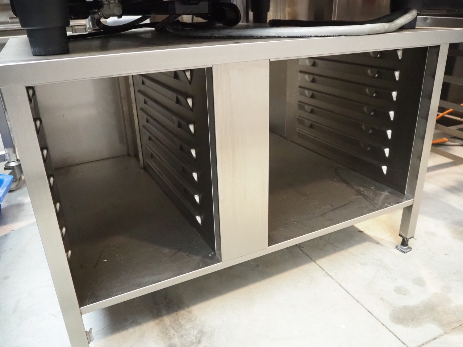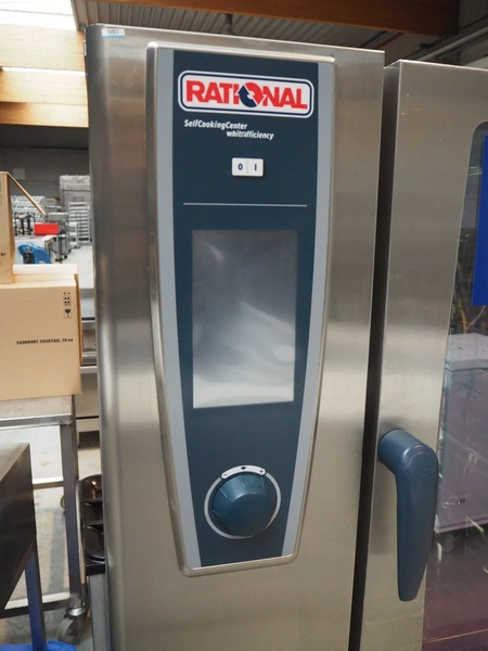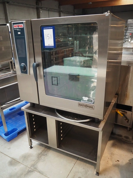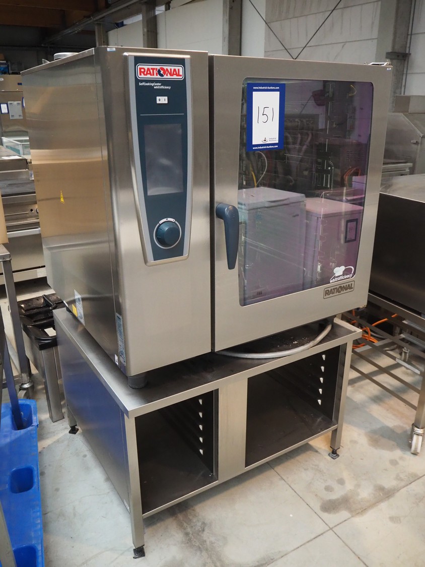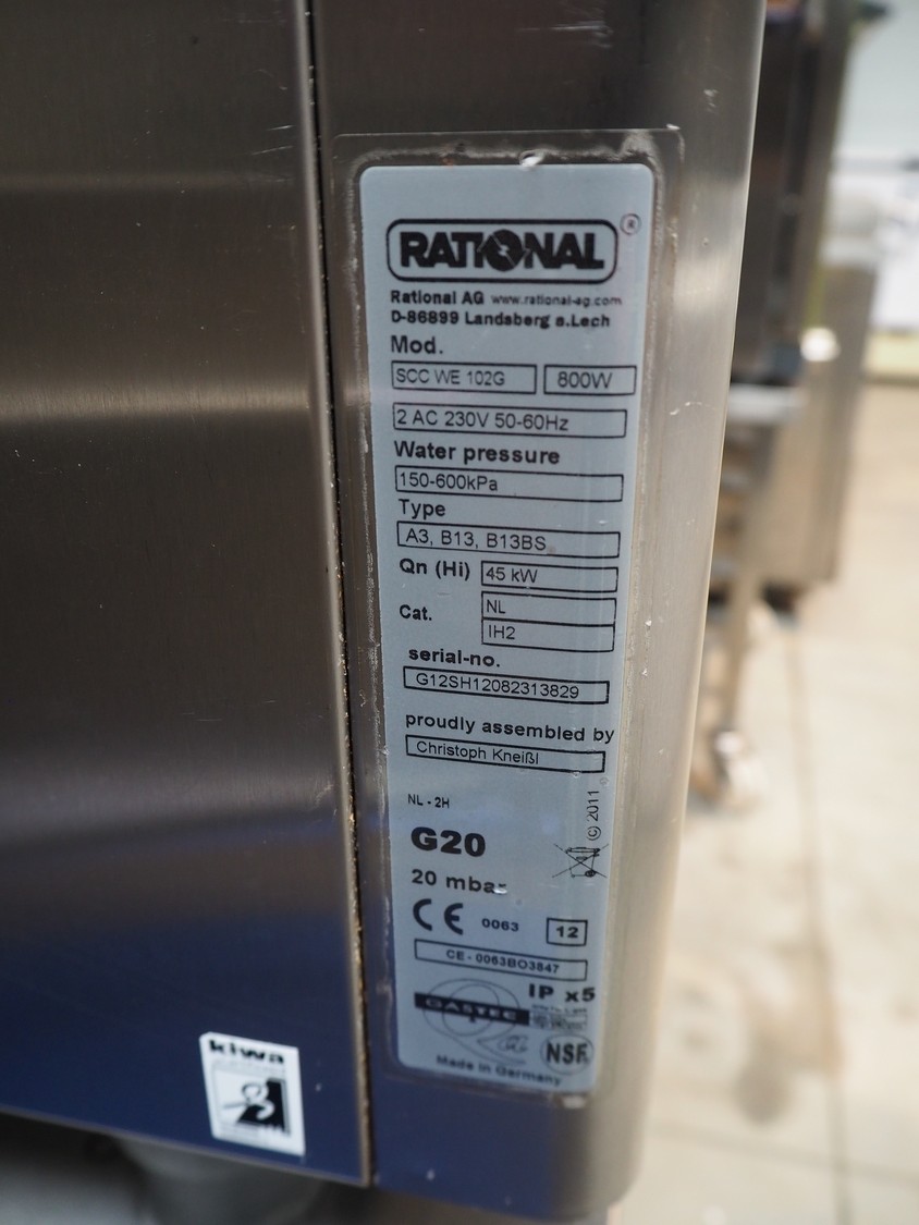 Rational combi steamer on s/s cabinet, model: SCC WE 102G, type: A3, B13, B13BS, serial number: G12SH12082313829, year of construction: 2012, 230 V, 50/60 Hz, 800 W, 10 floors, dimensions floor: (10x) 650 mm x 535 mm, total dimensions: 1070 mm x 1050 mm x 1800 mm.