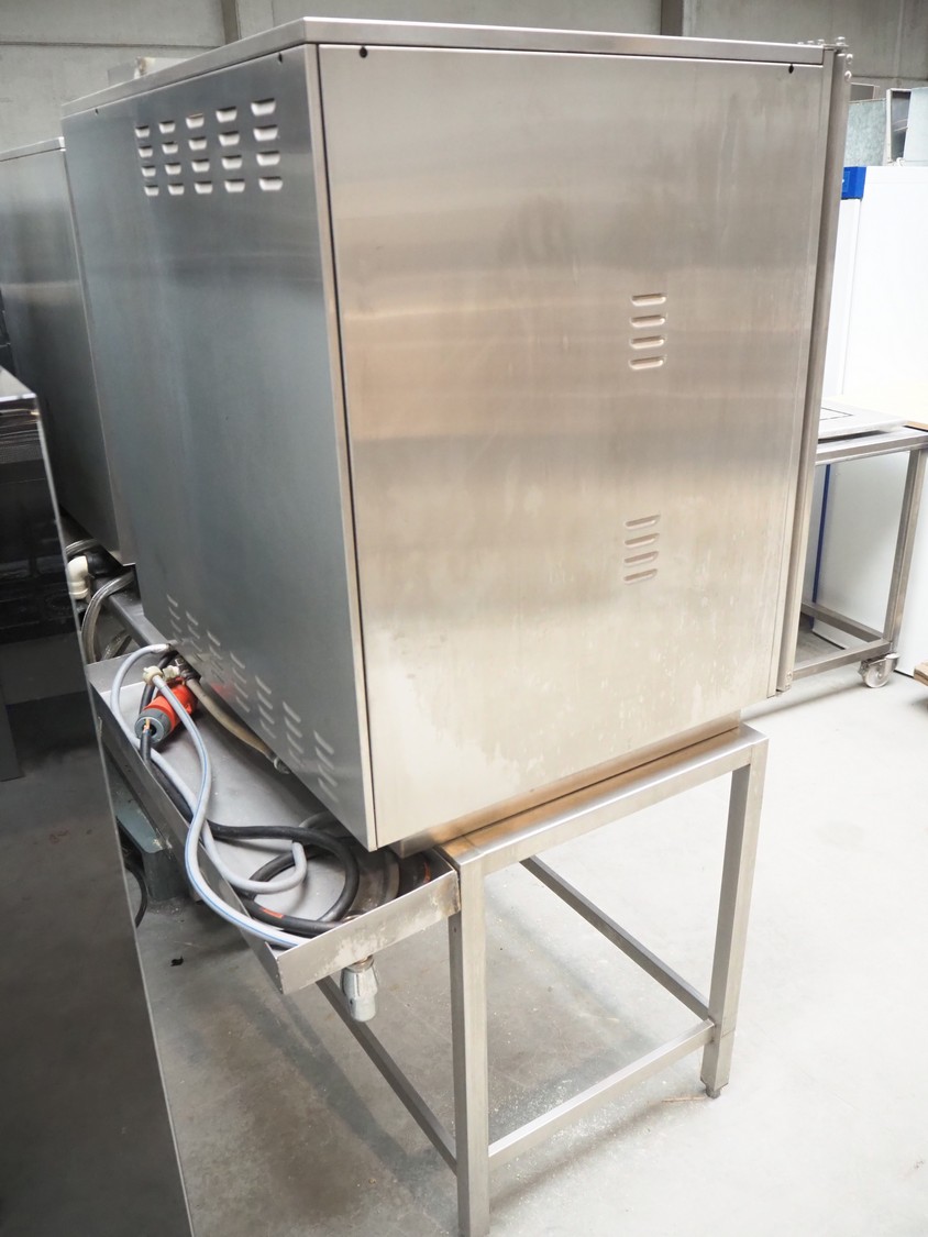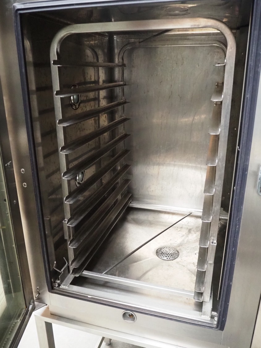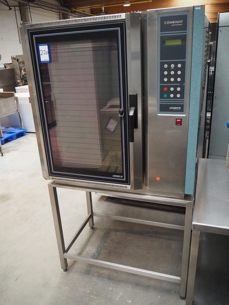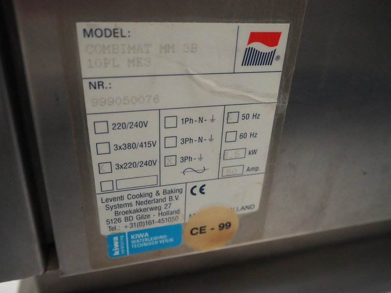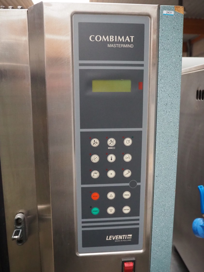 Leventi combi steamer on s/s frame, model: COMBIMAT MM 3B 10PL MK3, number: 999050076, 220/240 V, 3 Ph, 50 A, 18.5 kW, 10 floors, dimensions floors: (10x) 600 mm x 400 mm, total dimensions: 970 mm x 970 mm x 1850 mm.