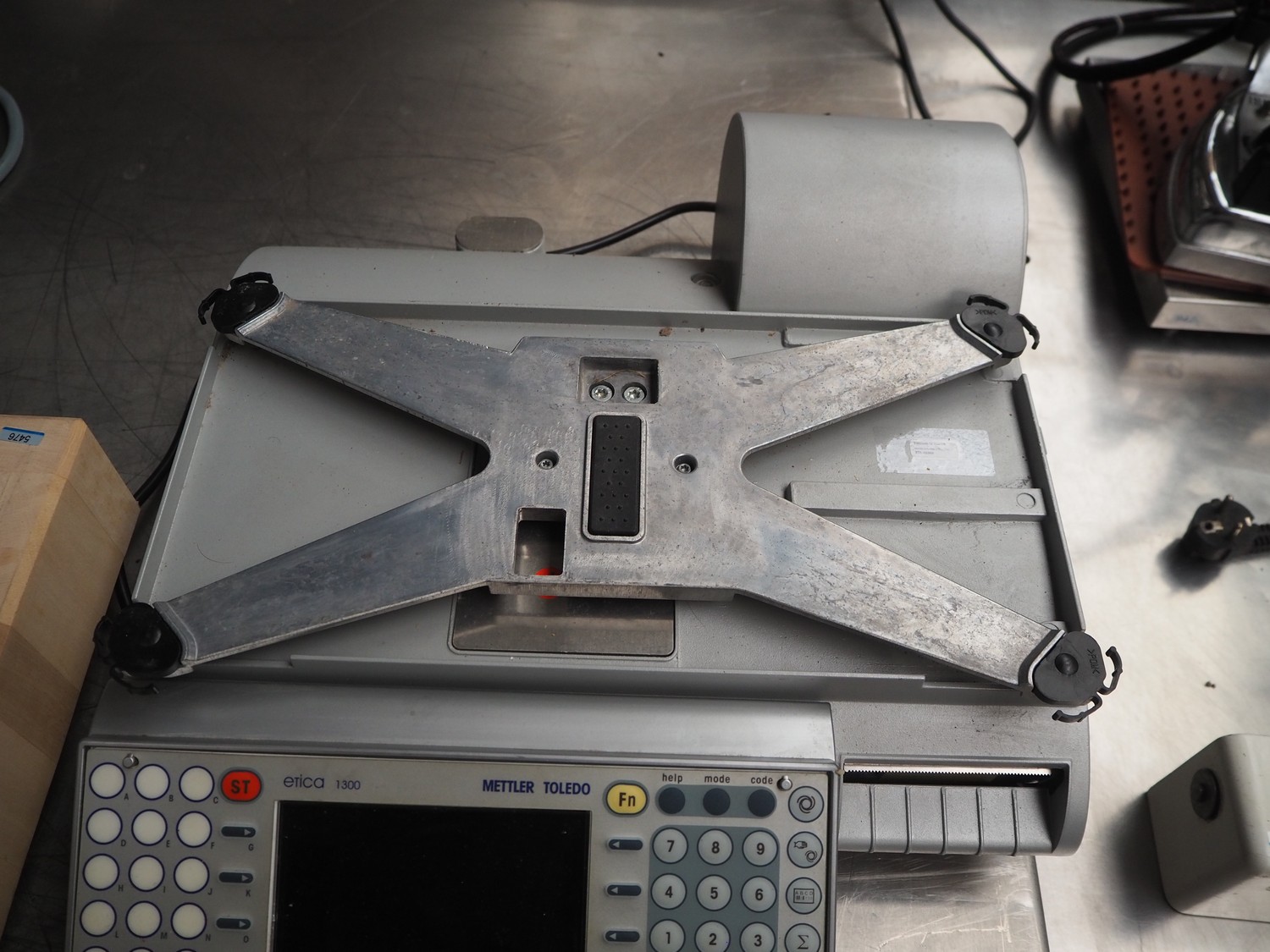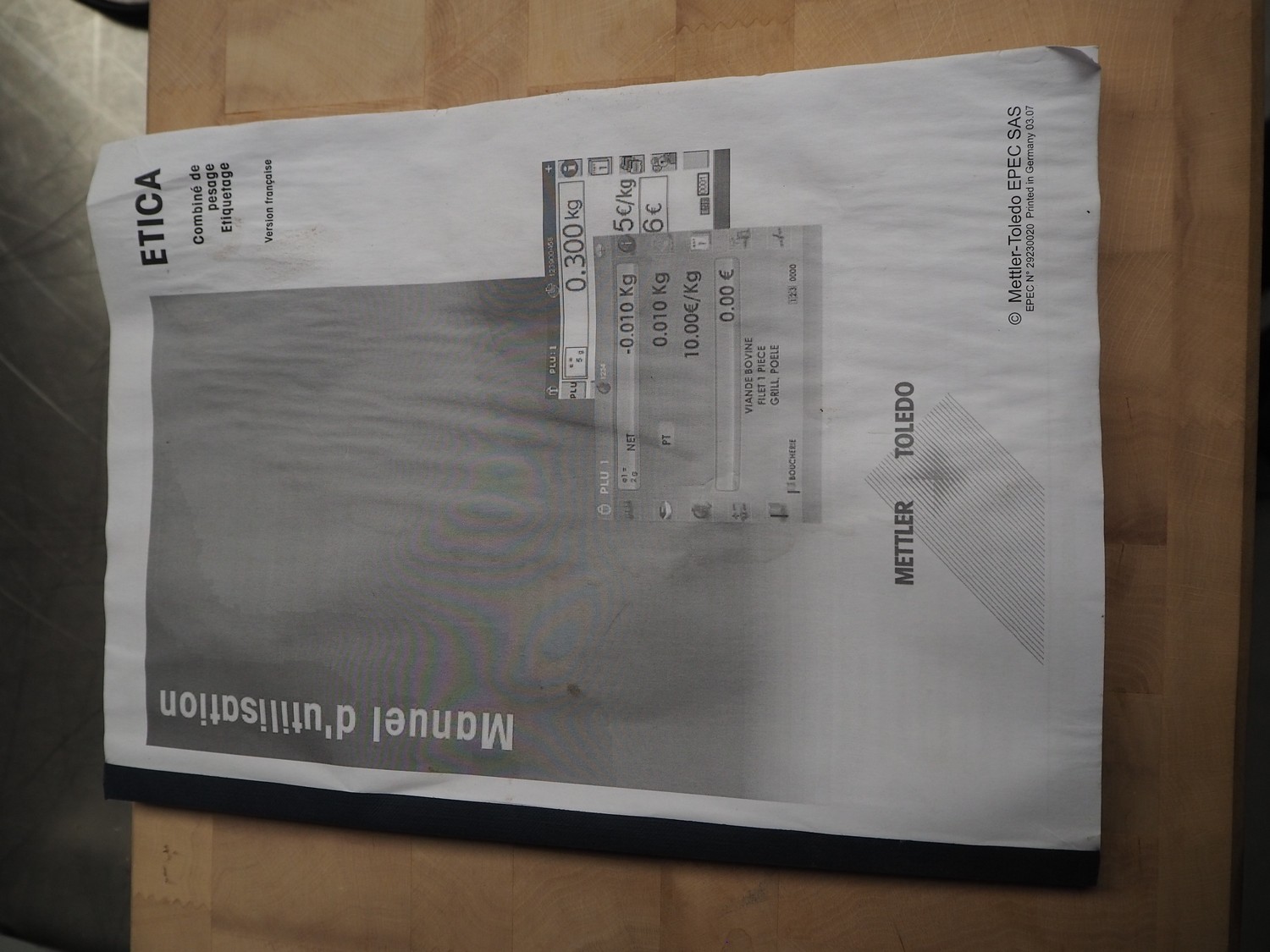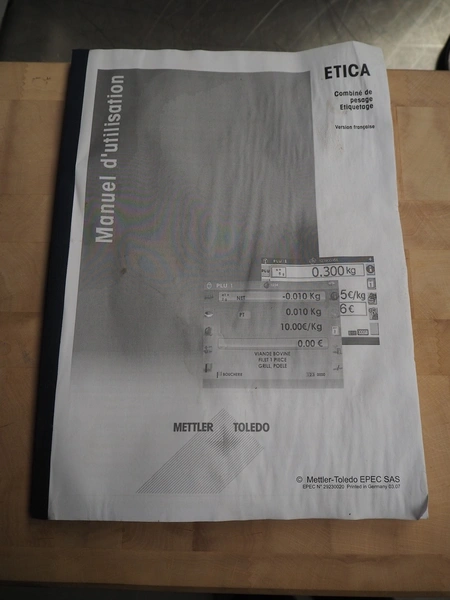 Mettler-Toledo GmbH weighing scale with label printer, type: E1300 / ETM03, serial number: 3031371, 100-240 V, 50/60 Hz, 2.2 A, minimum load: 40 g, maximum load: 6/15 kg, e=2/5 g, scale dimensions: 400 mm x 220 mm, total dimensions: 400 mm x 500 mm x 150 mm.