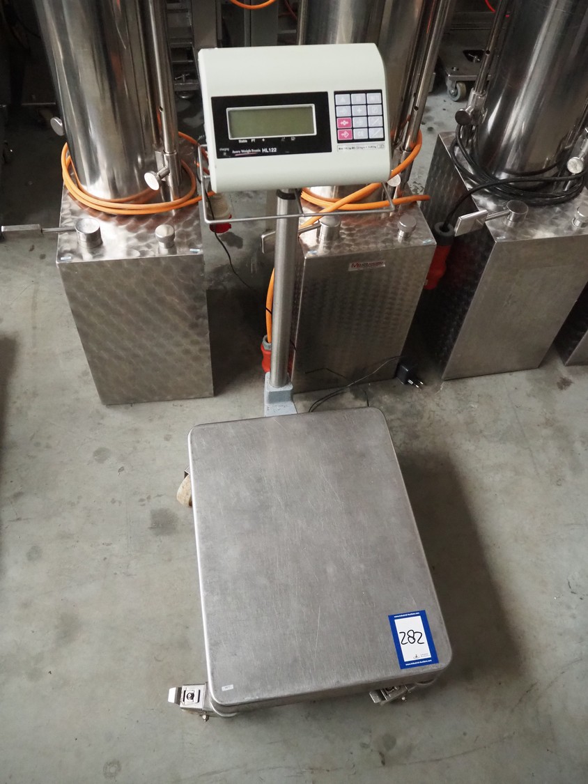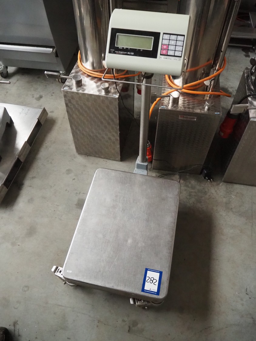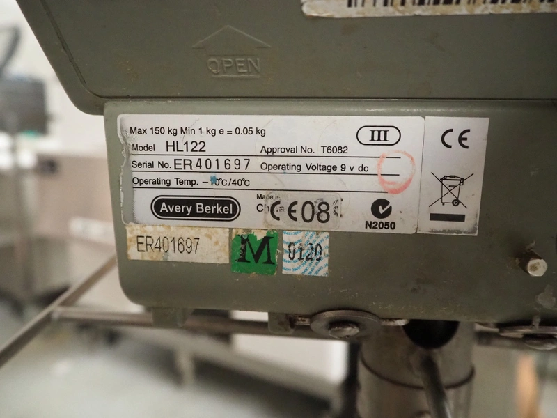 Avery Berkel mobile weighing scale, model: HL122, serial number: ER401697, year of construction: 2008, maximum weight: 150 kg, minimum weight: 1 kg, e=0.05 kg, 9 V, operating temp: -10°C/40°C, dimensions scale: 600 mm x 460 mm, total dimensions: 850 mm x 460 mm x 1000 mm.
