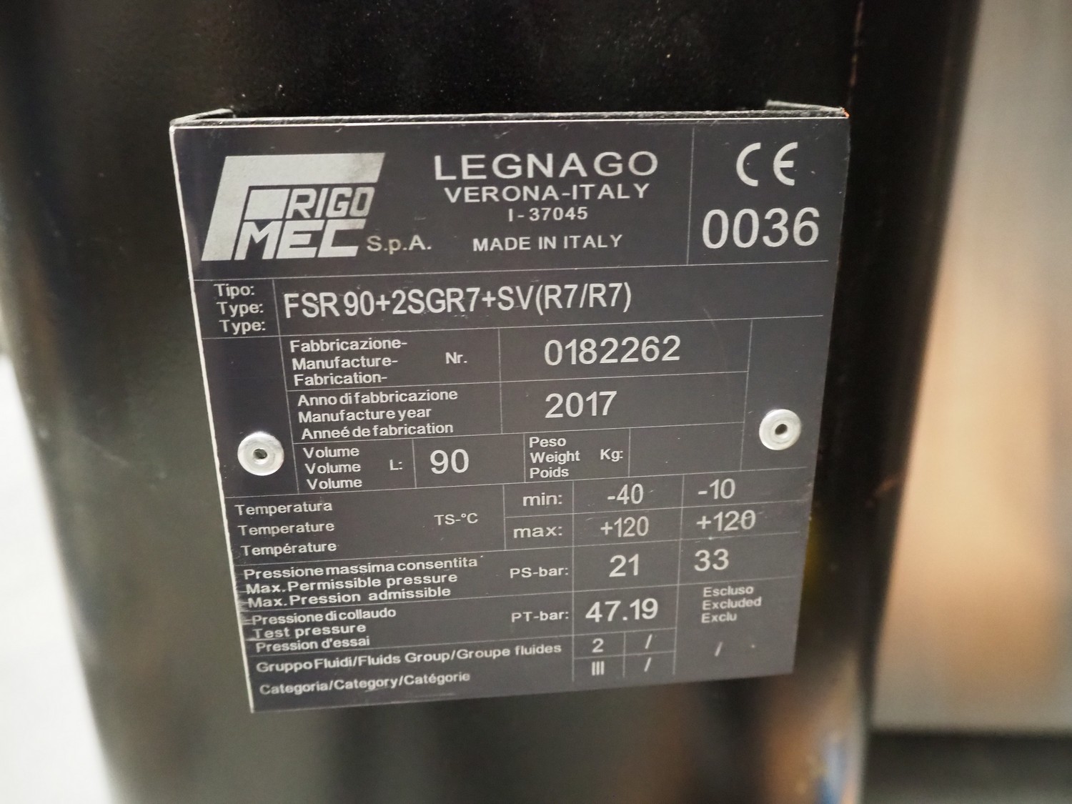 Frigomec S.p.A. pressure vessel, type: FSR 90+2SGR7+SV(R7/R7), number: 0182262, year of construction: 2017, volume: 90 liter, dimensions: 380 mm x 350 mm x 1100 mm.