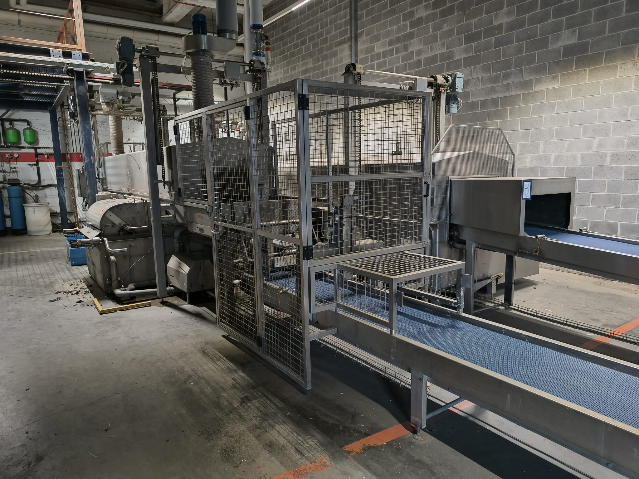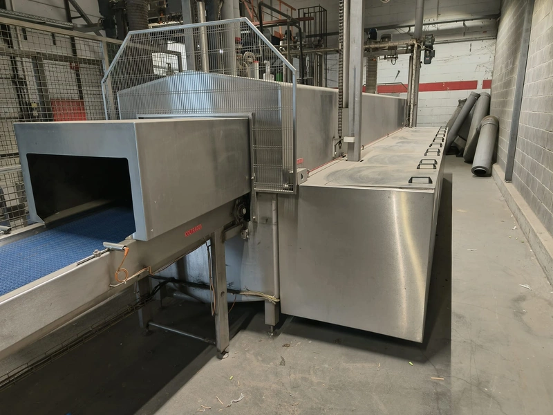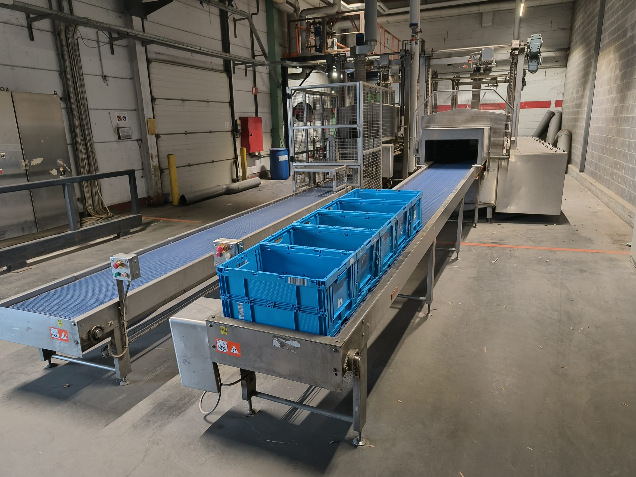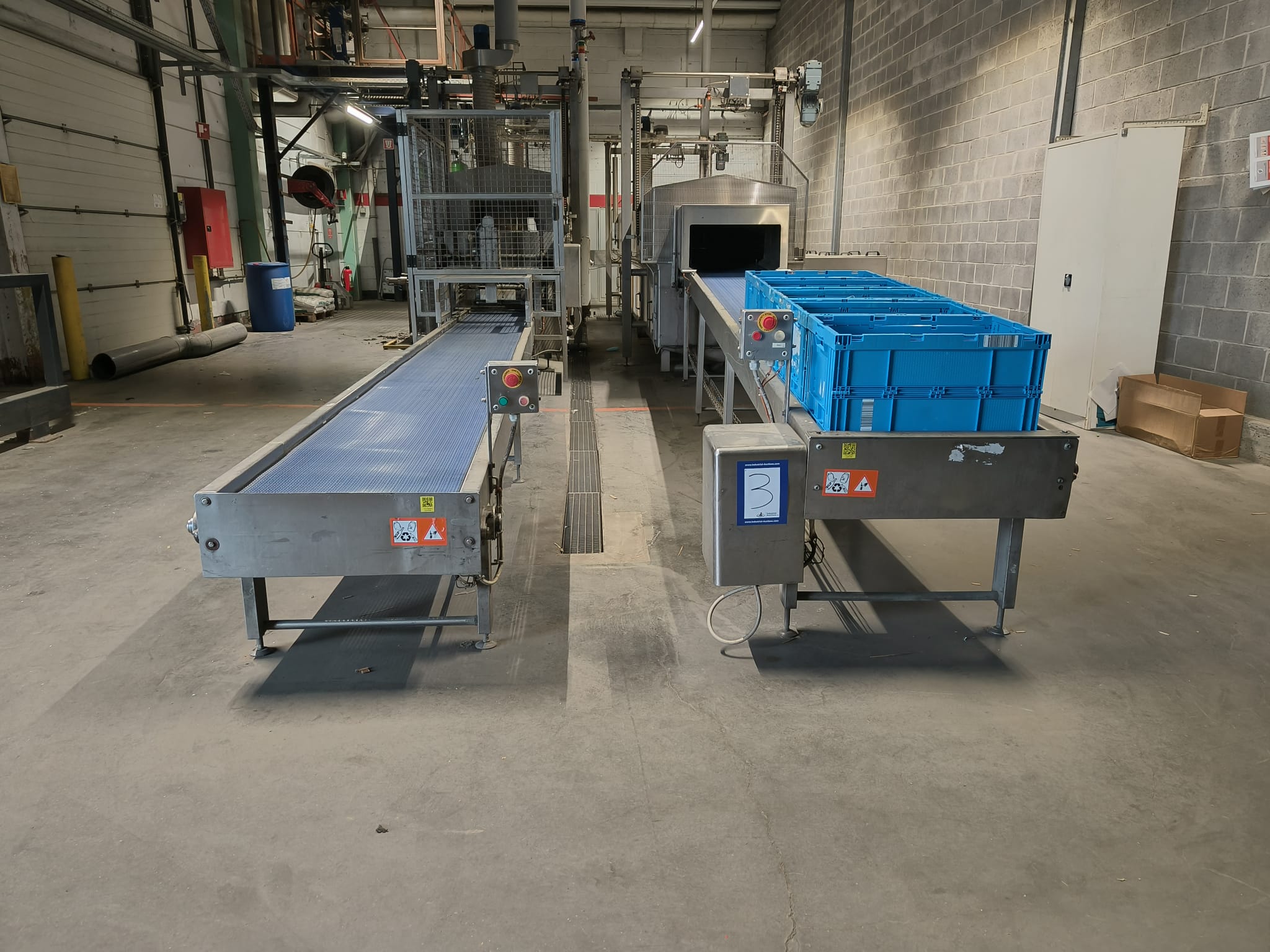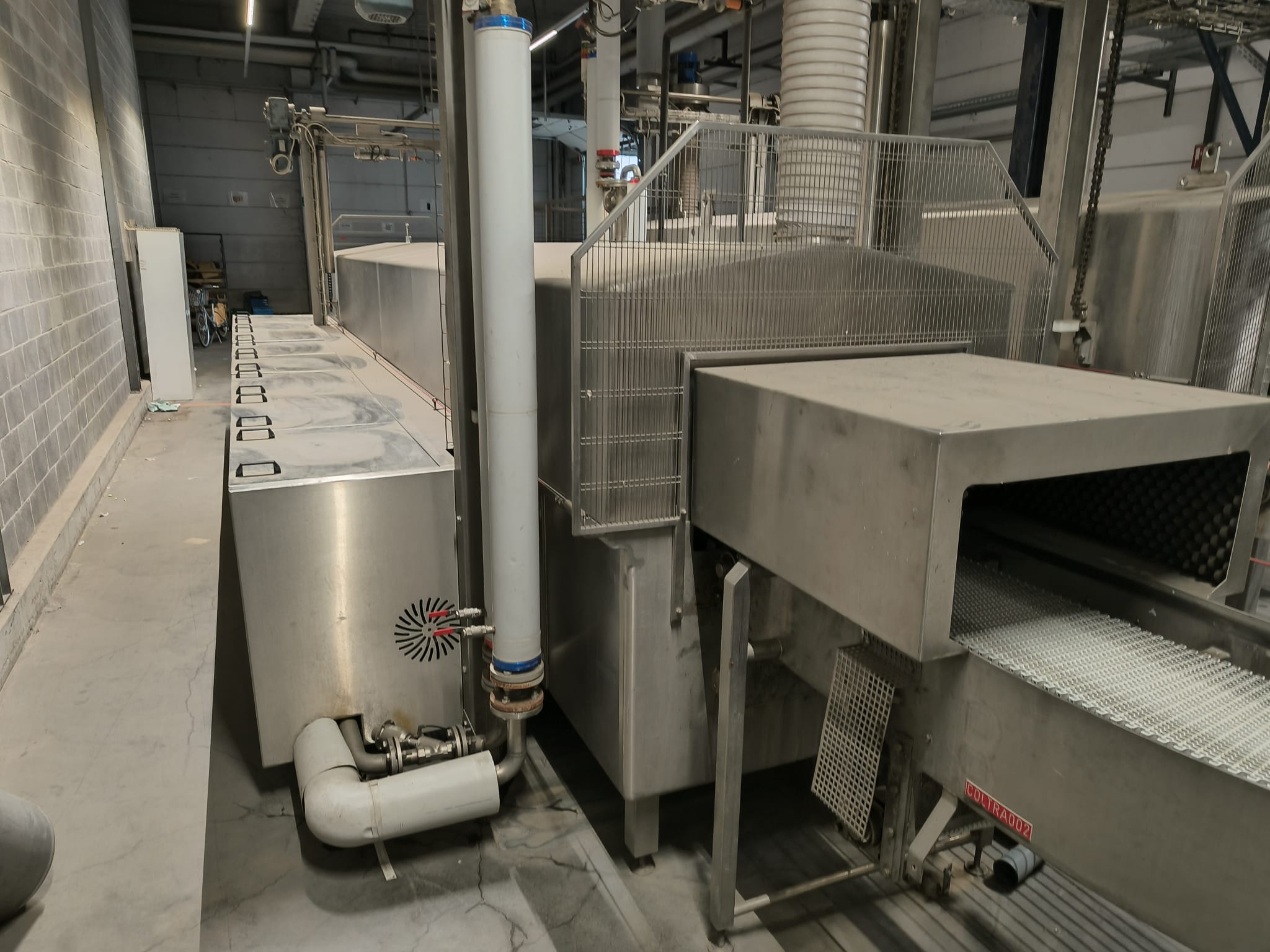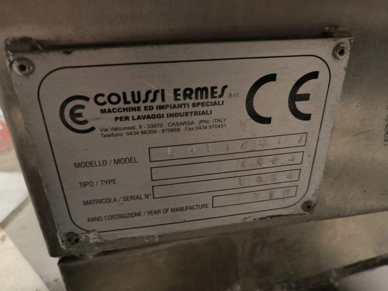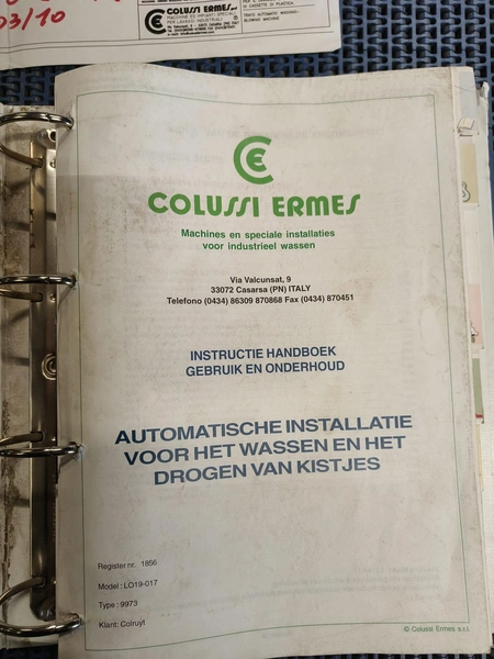 Colussi Ermes crate washing and drying line, type: L013/01, type: 9973, serial number: 1856, year of construction: 2010, maximum crate size: 600 mm x 400 mm x 330 mm, consisting of: infeed belt, plastic mesh belt, belt width: 620 mm, total dimensions: 7250 mm x 970 mm x 930 mm, washing machine with tilting device, dimensions: 7700 mm x 2500 mm x 3600 mm, dryer, dimensions: 9000 mm x 2600 mm x 3600 mm, outfeed belt, dimensions: 6160 mm x 1100 mm x 1100 mm, switch cabinet, dimensions: 1620 mm x 650 mm x 2260 mm.