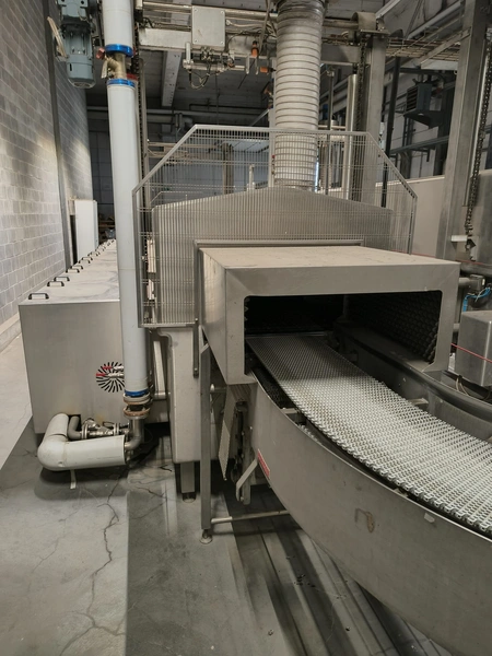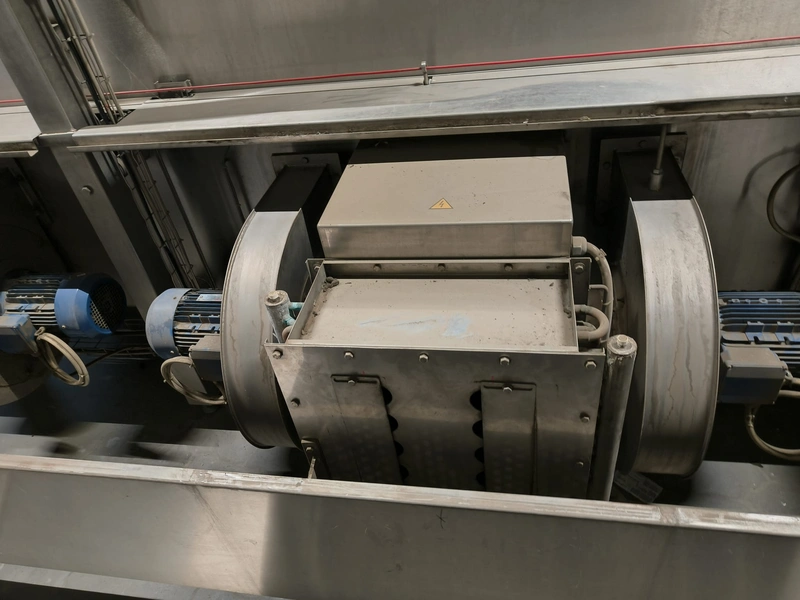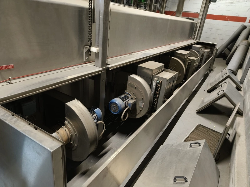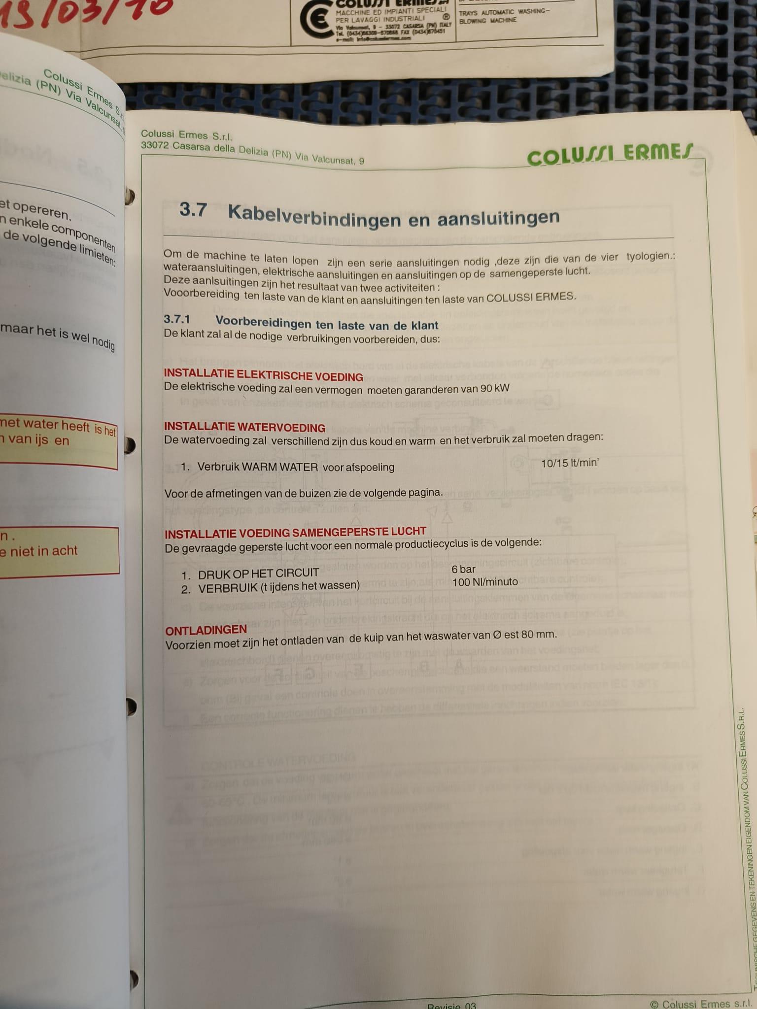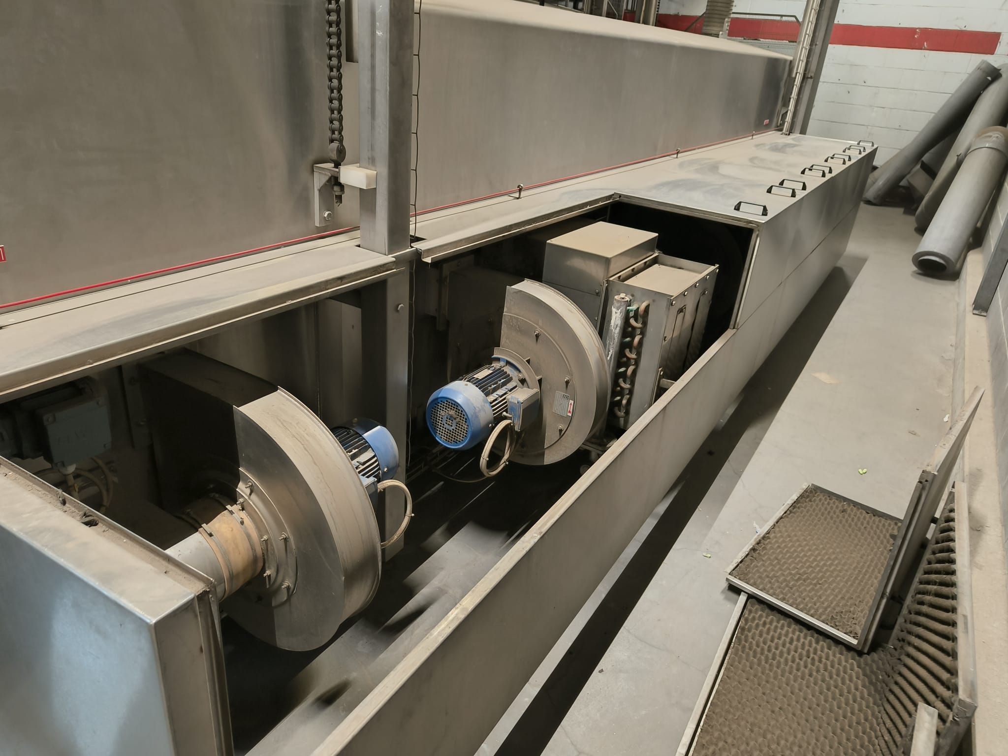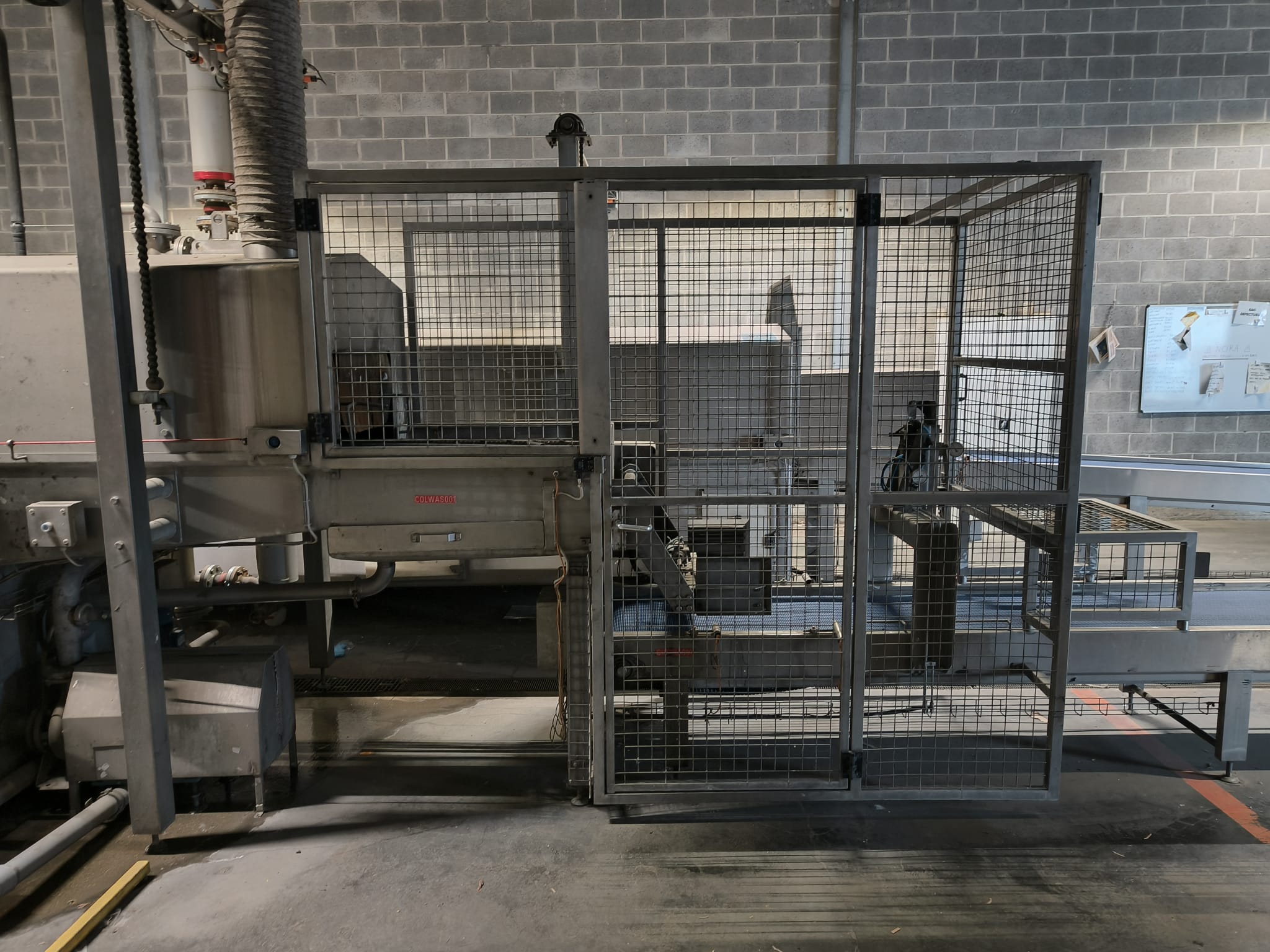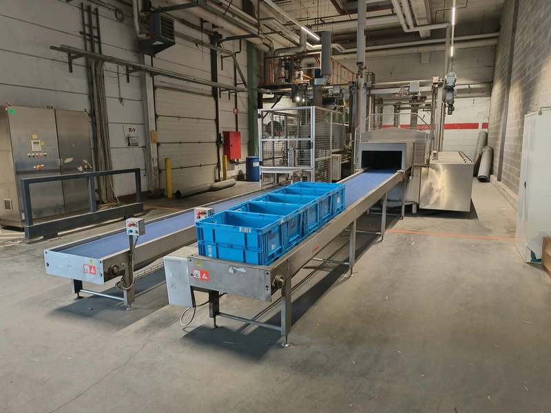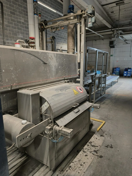 Colussi Ermes crate washing and drying line, type: L013/01, type: 9973, serial number: 1856, year of construction: 2010, maximum crate size: 600 mm x 400 mm x 330 mm, consisting of: infeed belt, plastic mesh belt, belt width: 620 mm, total dimensions: 7250 mm x 970 mm x 930 mm, washing machine with tilting device, dimensions: 7700 mm x 2500 mm x 3600 mm, dryer, dimensions: 9000 mm x 2600 mm x 3600 mm, outfeed belt, dimensions: 6160 mm x 1100 mm x 1100 mm, switch cabinet, dimensions: 1620 mm x 650 mm x 2260 mm.