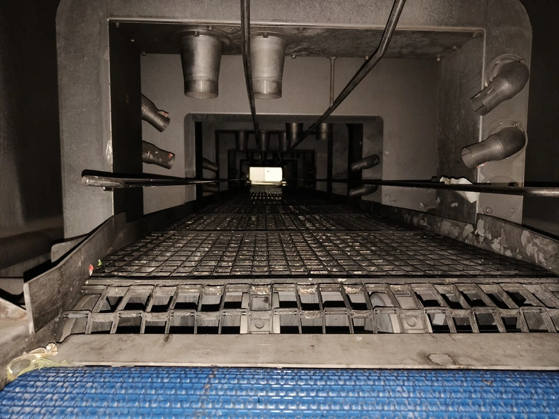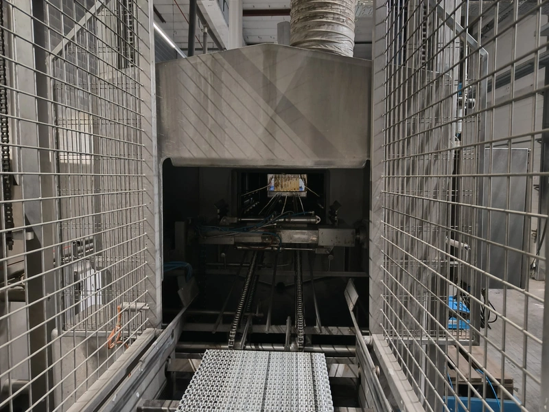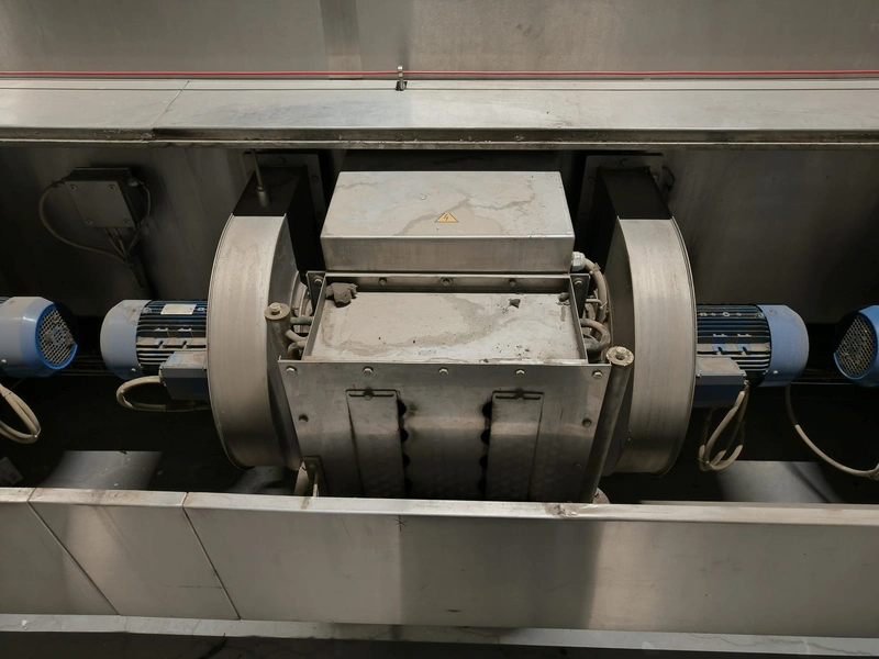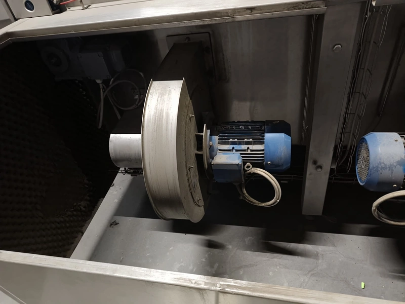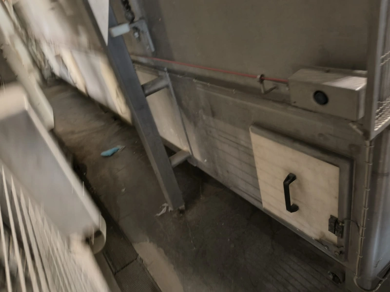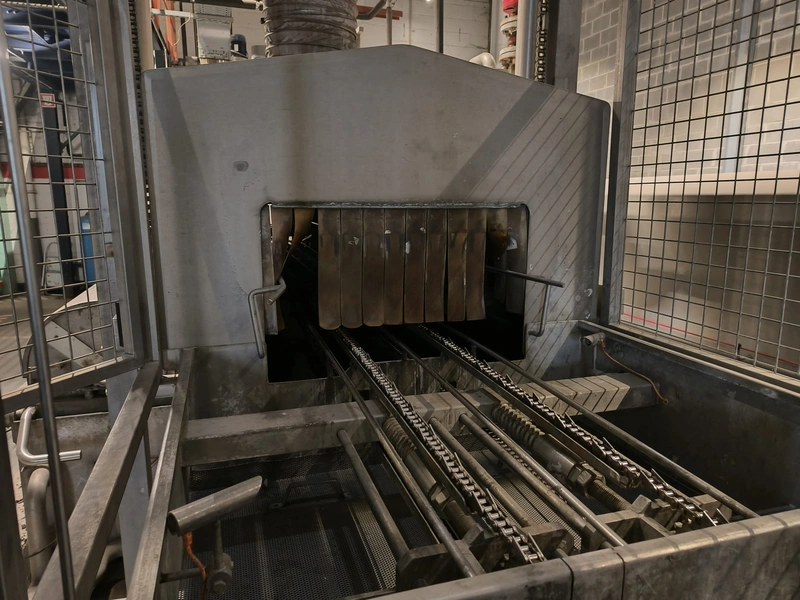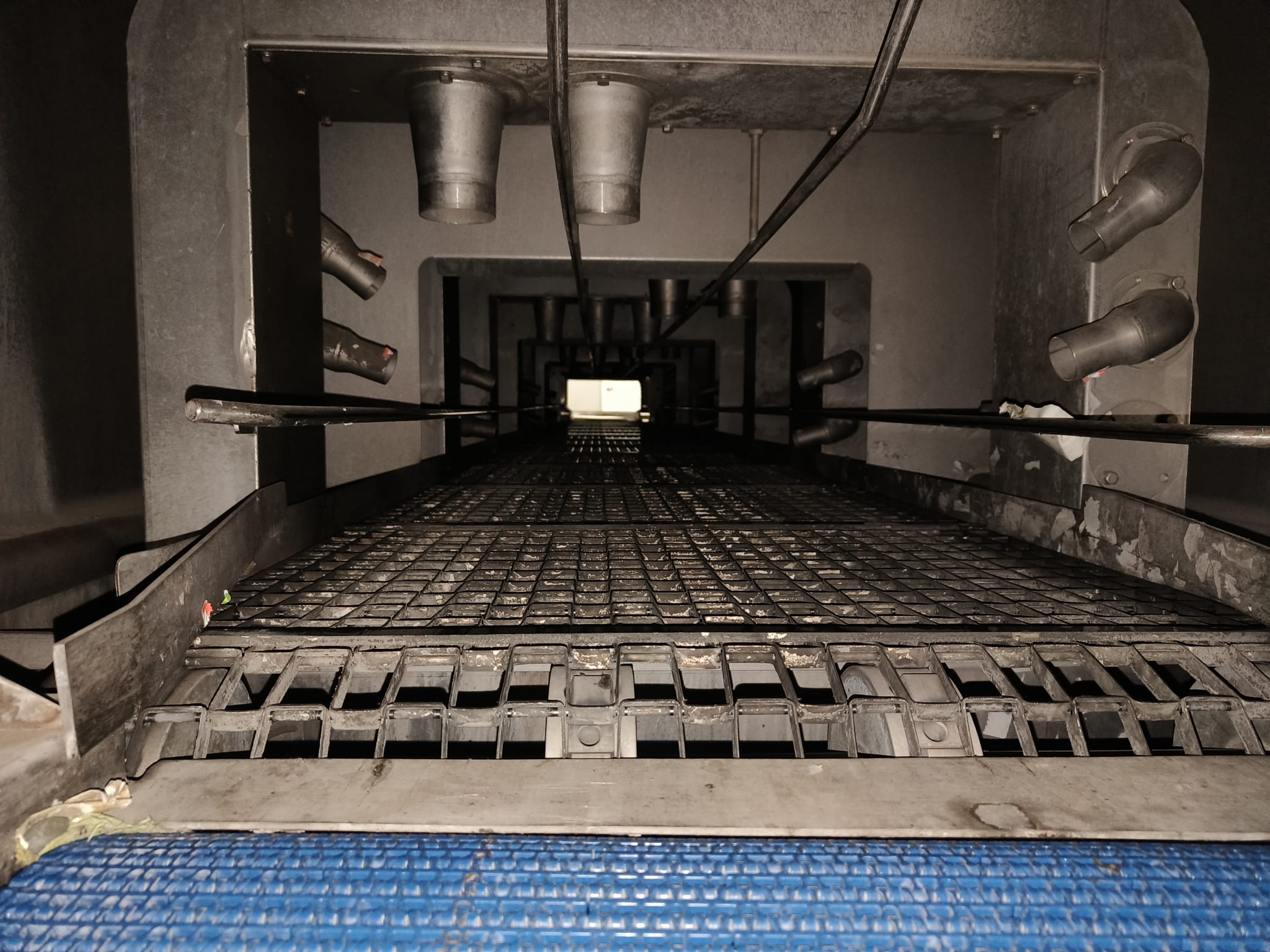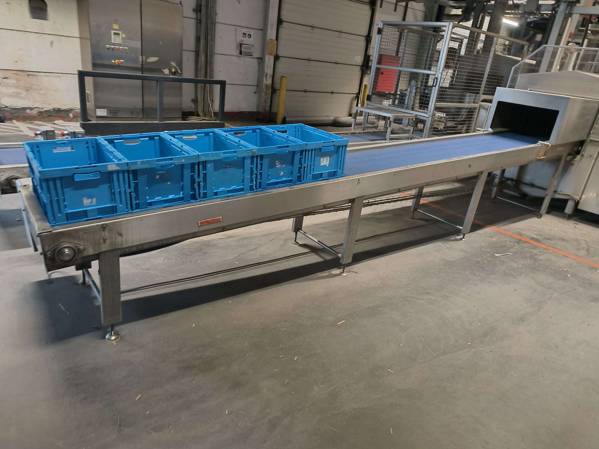 Colussi Ermes crate washing and drying line, type: L013/01, type: 9973, serial number: 1856, year of construction: 2010, maximum crate size: 600 mm x 400 mm x 330 mm, consisting of: infeed belt, plastic mesh belt, belt width: 620 mm, total dimensions: 7250 mm x 970 mm x 930 mm, washing machine with tilting device, dimensions: 7700 mm x 2500 mm x 3600 mm, dryer, dimensions: 9000 mm x 2600 mm x 3600 mm, outfeed belt, dimensions: 6160 mm x 1100 mm x 1100 mm, switch cabinet, dimensions: 1620 mm x 650 mm x 2260 mm.