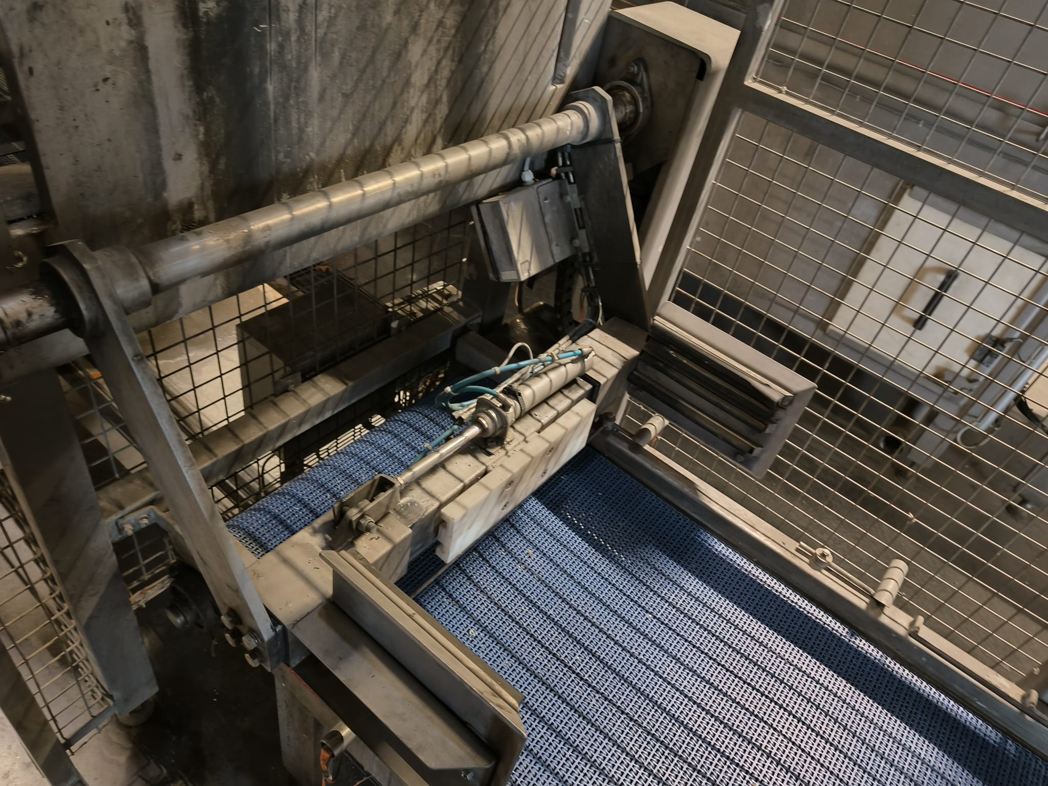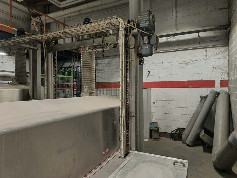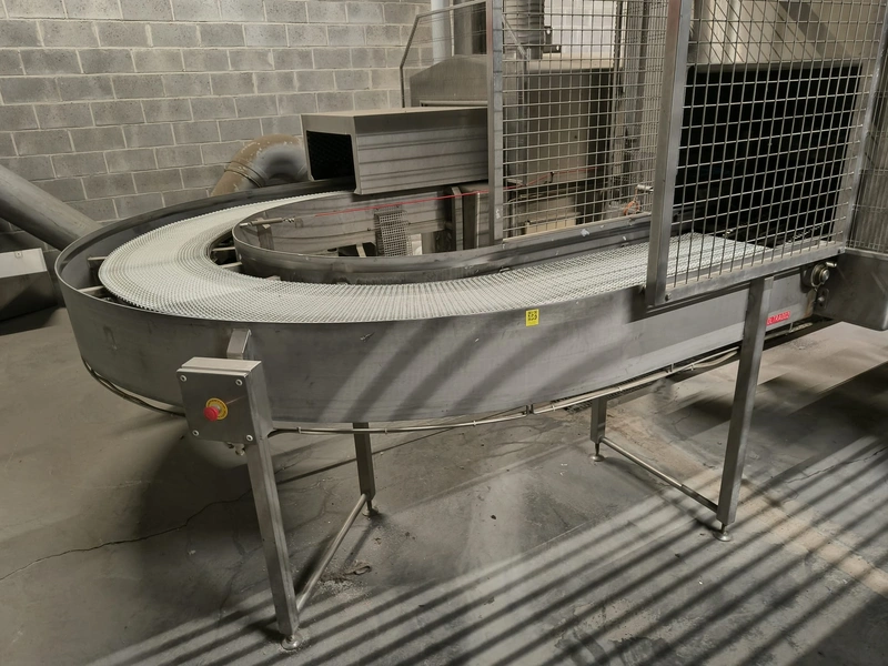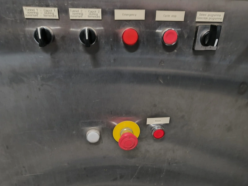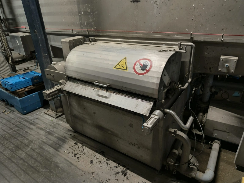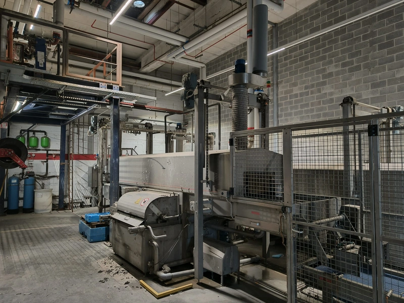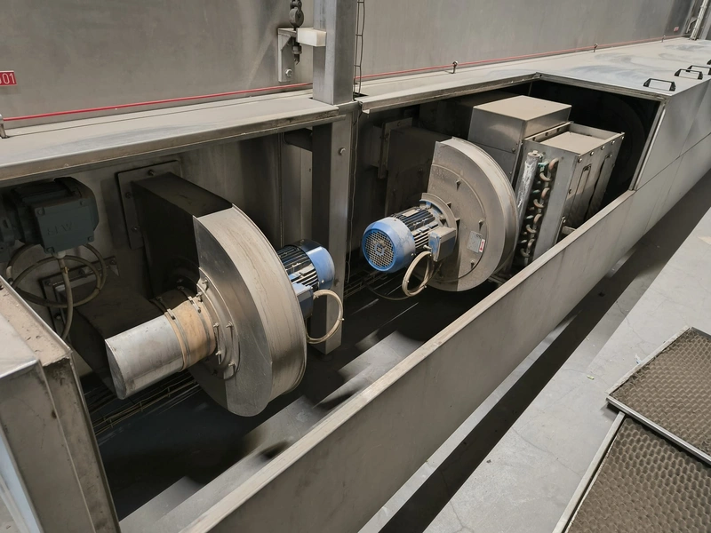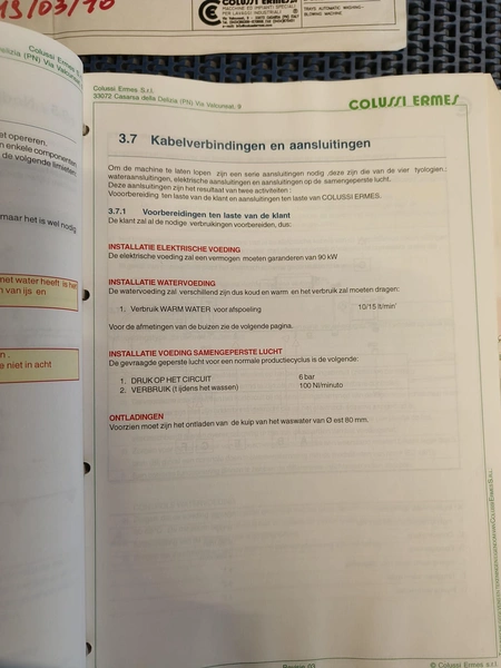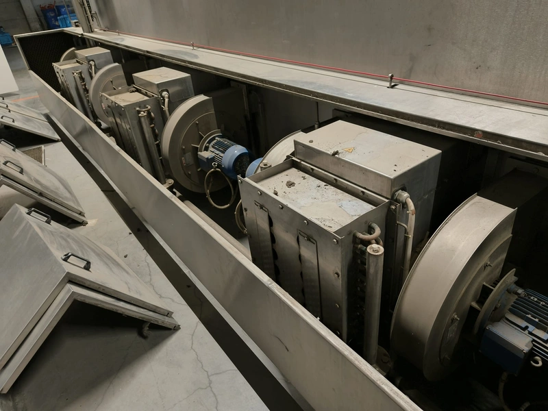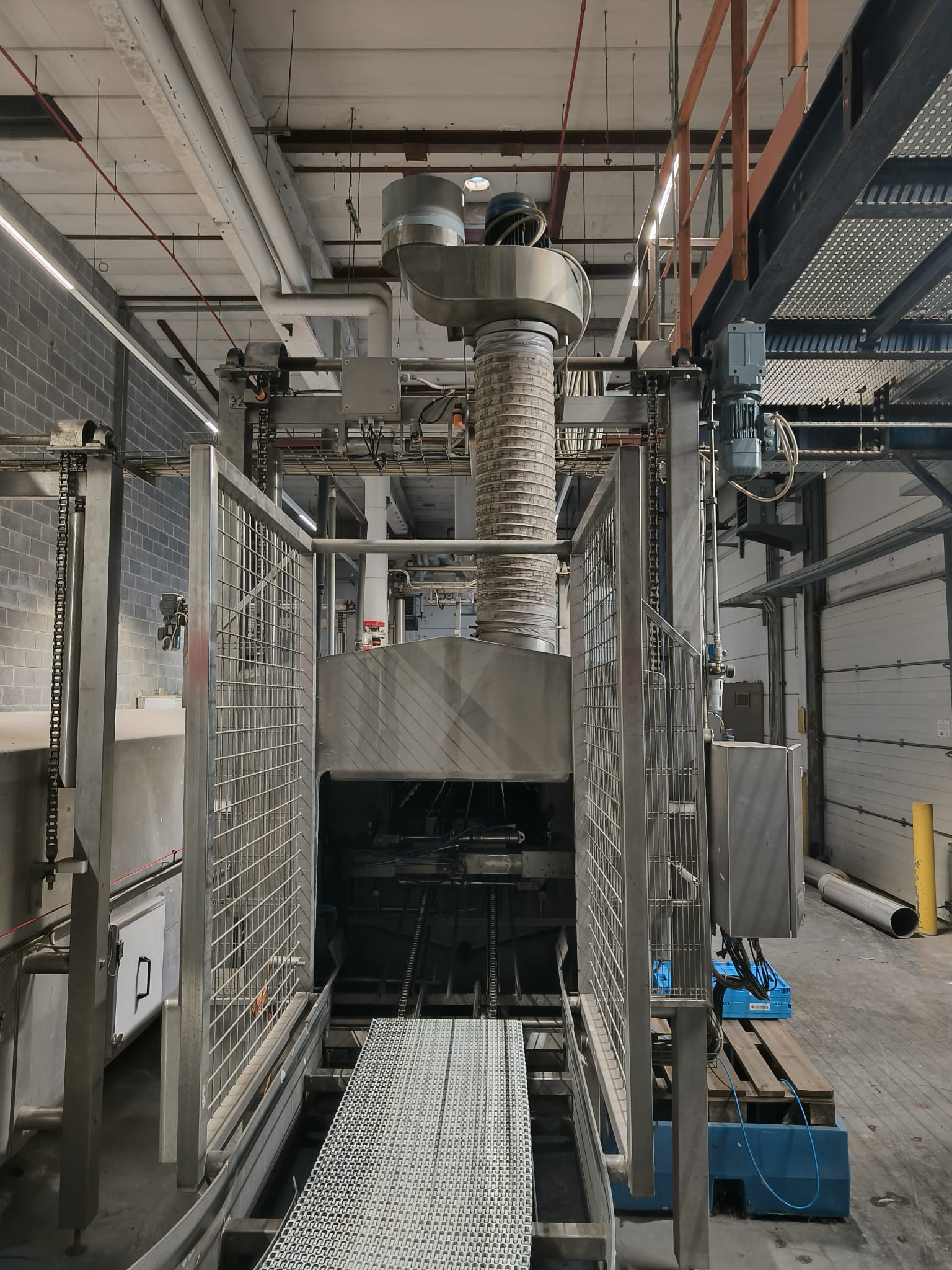 Colussi Ermes crate washing and drying line, type: L013/01, type: 9973, serial number: 1856, year of construction: 2010, maximum crate size: 600 mm x 400 mm x 330 mm, consisting of: infeed belt, plastic mesh belt, belt width: 620 mm, total dimensions: 7250 mm x 970 mm x 930 mm, washing machine with tilting device, dimensions: 7700 mm x 2500 mm x 3600 mm, dryer, dimensions: 9000 mm x 2600 mm x 3600 mm, outfeed belt, dimensions: 6160 mm x 1100 mm x 1100 mm, switch cabinet, dimensions: 1620 mm x 650 mm x 2260 mm.