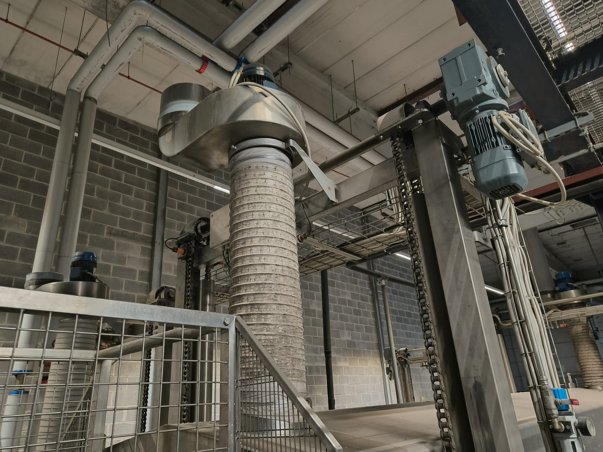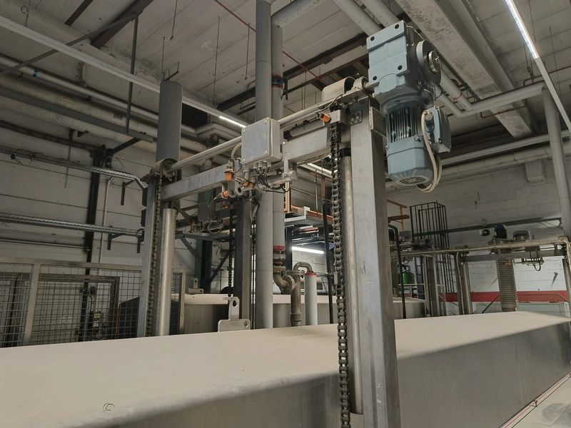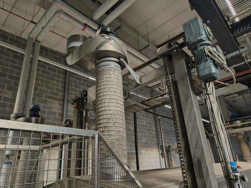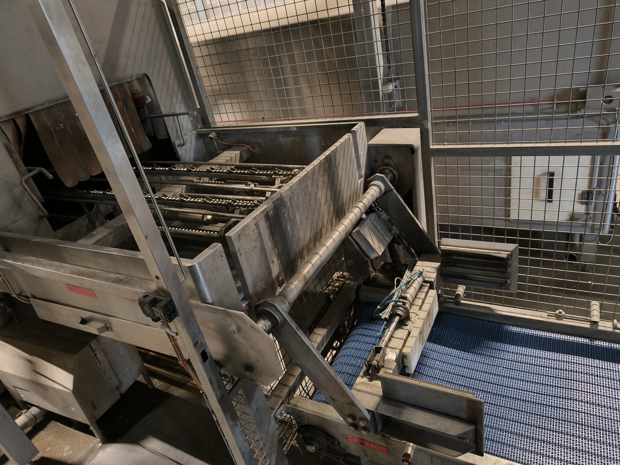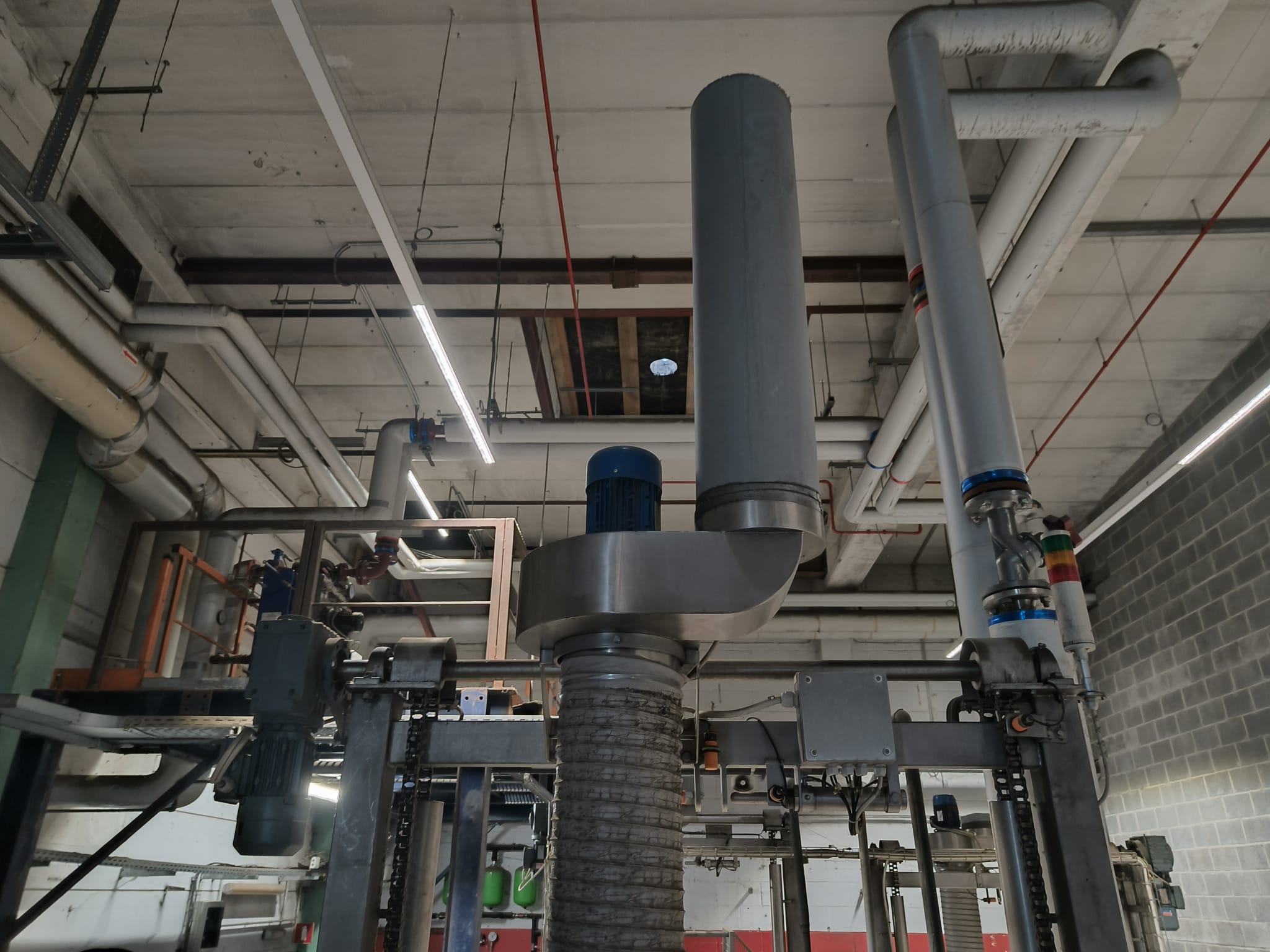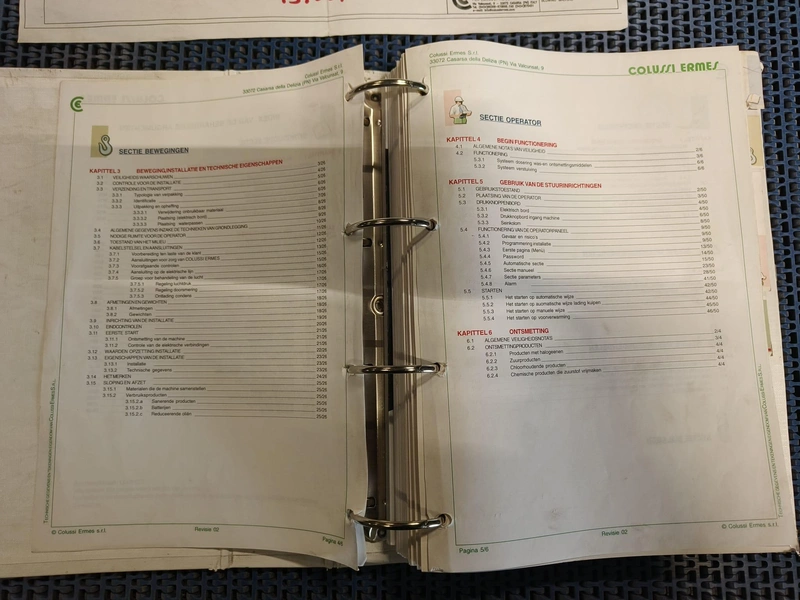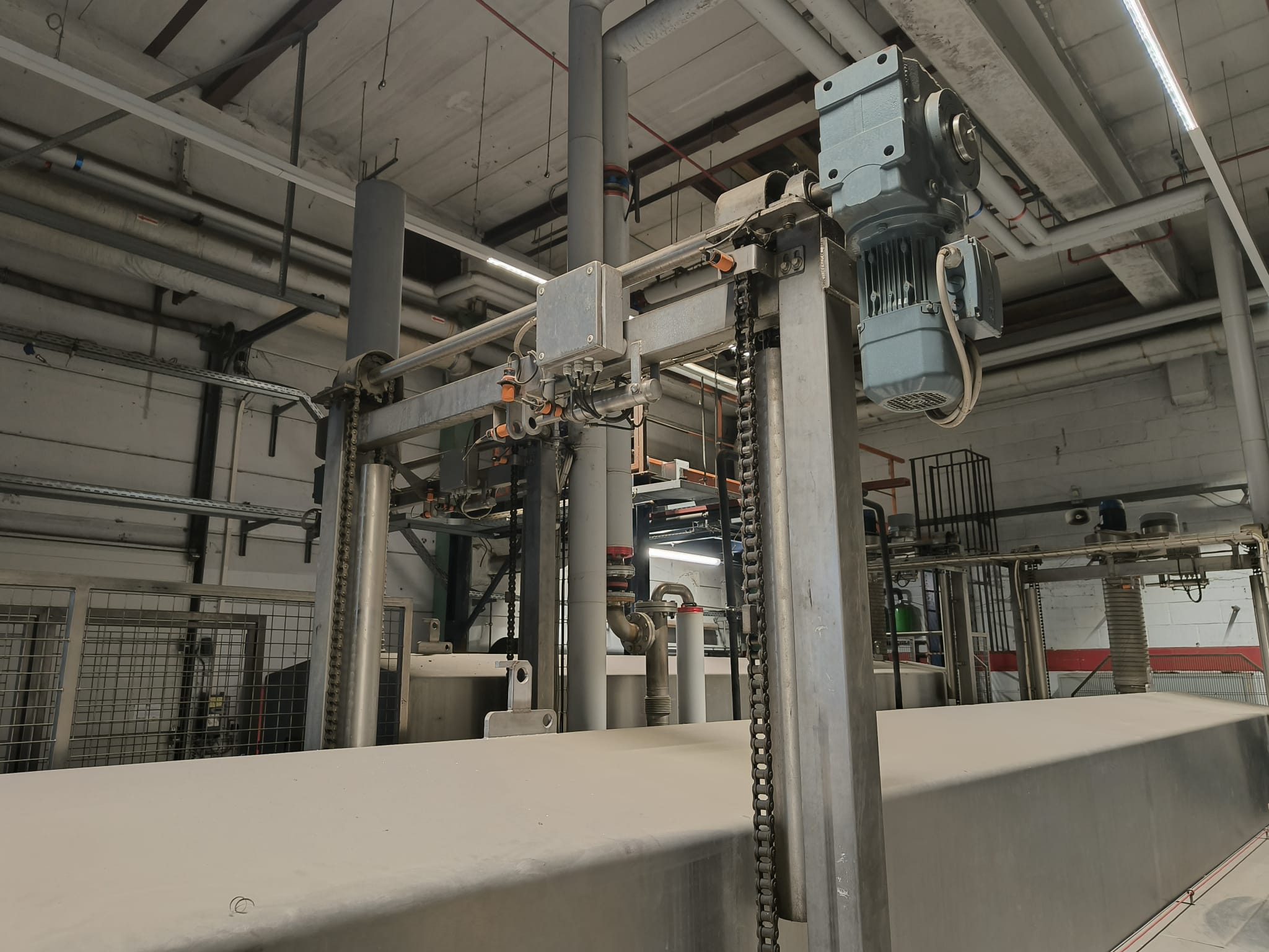 Colussi Ermes crate washing and drying line, type: L013/01, type: 9973, serial number: 1856, year of construction: 2010, maximum crate size: 600 mm x 400 mm x 330 mm, consisting of: infeed belt, plastic mesh belt, belt width: 620 mm, total dimensions: 7250 mm x 970 mm x 930 mm, washing machine with tilting device, dimensions: 7700 mm x 2500 mm x 3600 mm, dryer, dimensions: 9000 mm x 2600 mm x 3600 mm, outfeed belt, dimensions: 6160 mm x 1100 mm x 1100 mm, switch cabinet, dimensions: 1620 mm x 650 mm x 2260 mm.