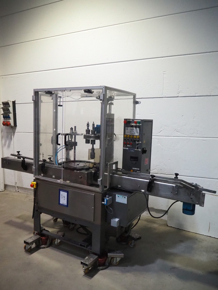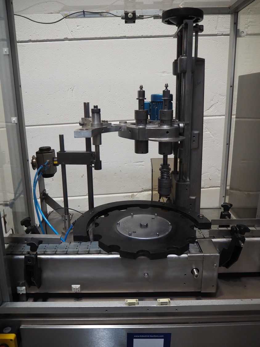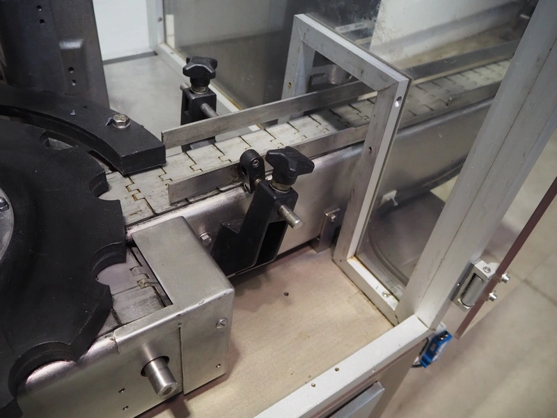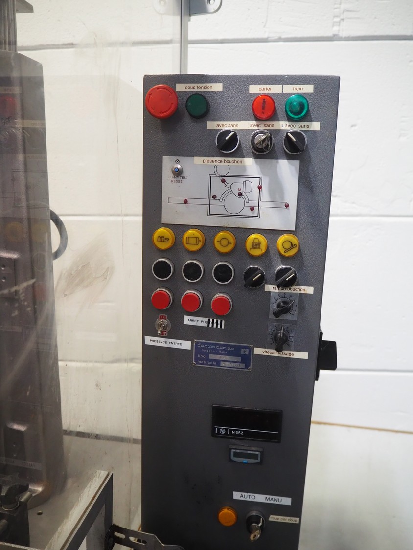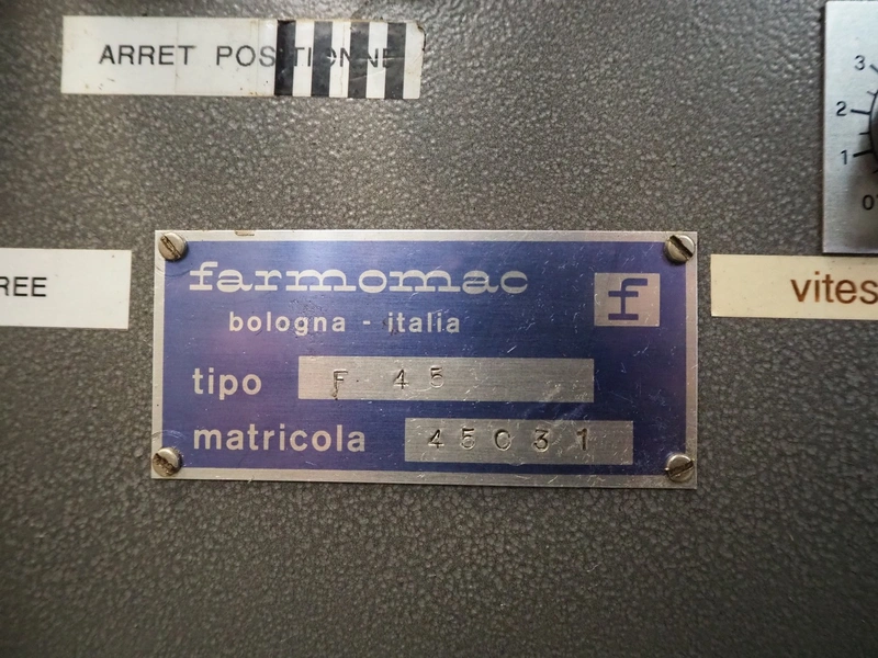 Farmomac filling and closing machine, 1 station, type: F 45, serial number: 45031, plastic belt, belt width: 80 mm, Ø cans: 45 mm, input clearance: 115 mm x 40 mm, output clearance: 95 mm x 70 mm, total dimensions: 2900 mm x 970 mm x 2000 mm. Rollies not included.