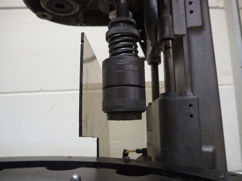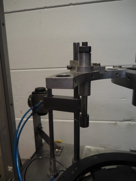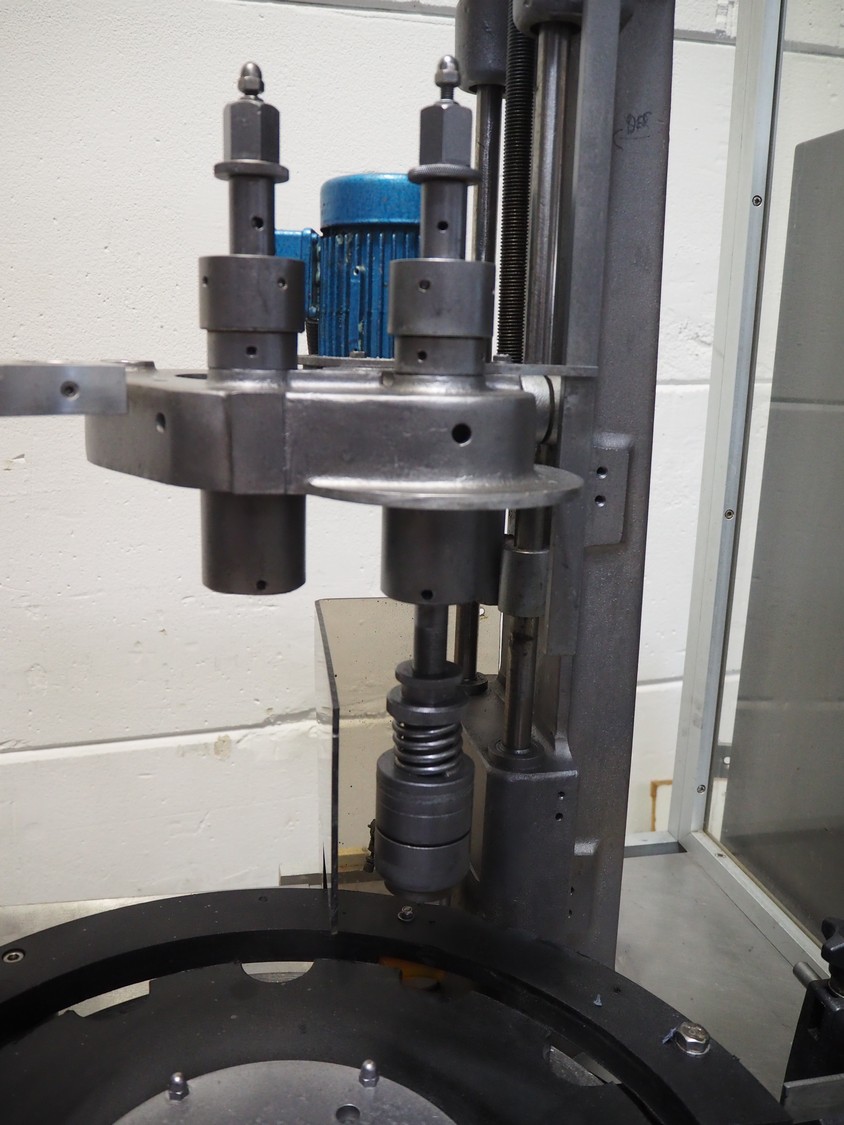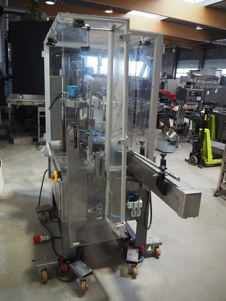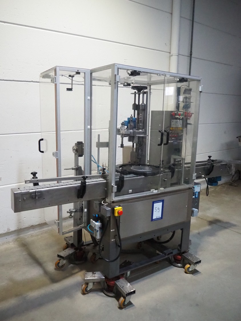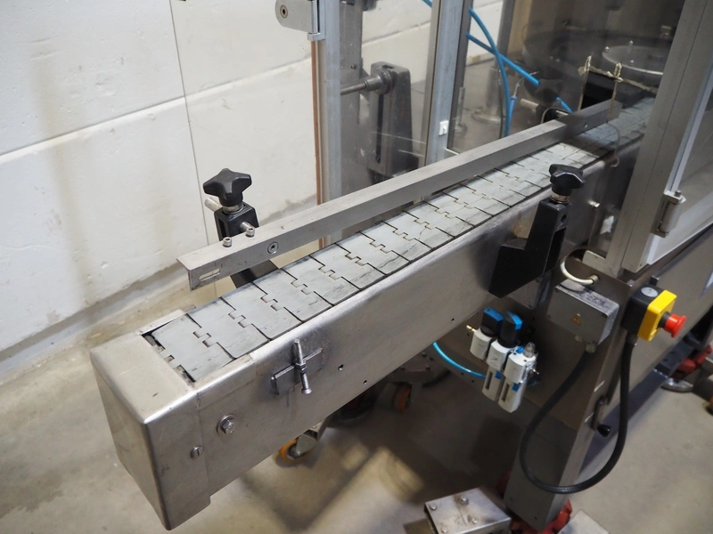 Farmomac filling and closing machine, 1 station, type: F 45, serial number: 45031, plastic belt, belt width: 80 mm, Ø cans: 45 mm, input clearance: 115 mm x 40 mm, output clearance: 95 mm x 70 mm, total dimensions: 2900 mm x 970 mm x 2000 mm. Rollies not included.