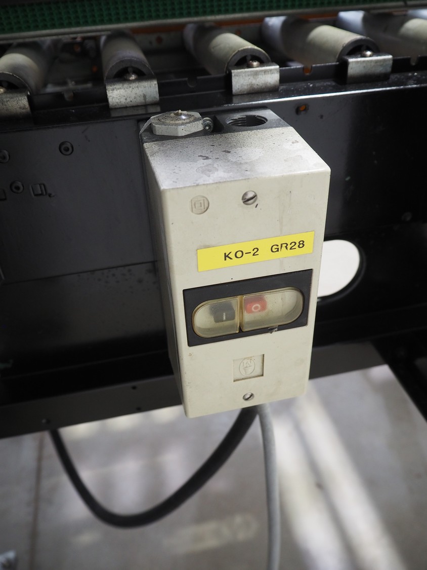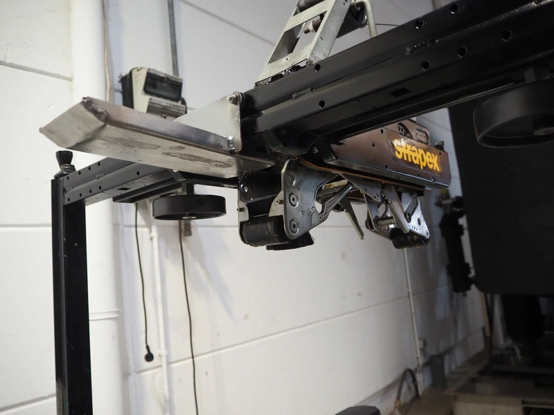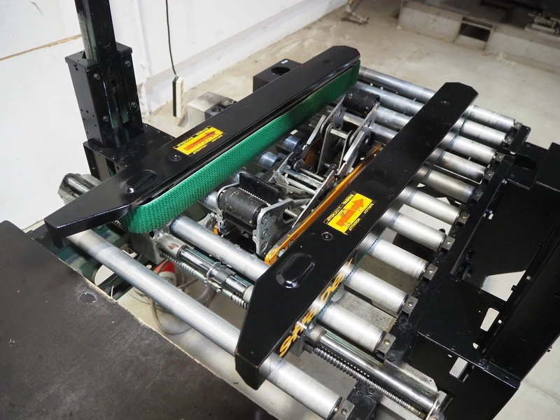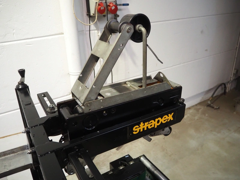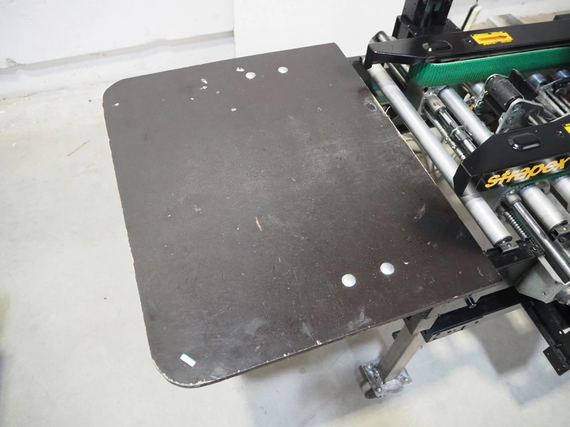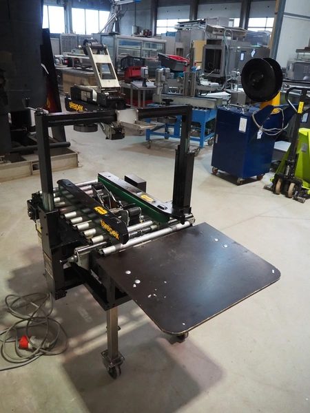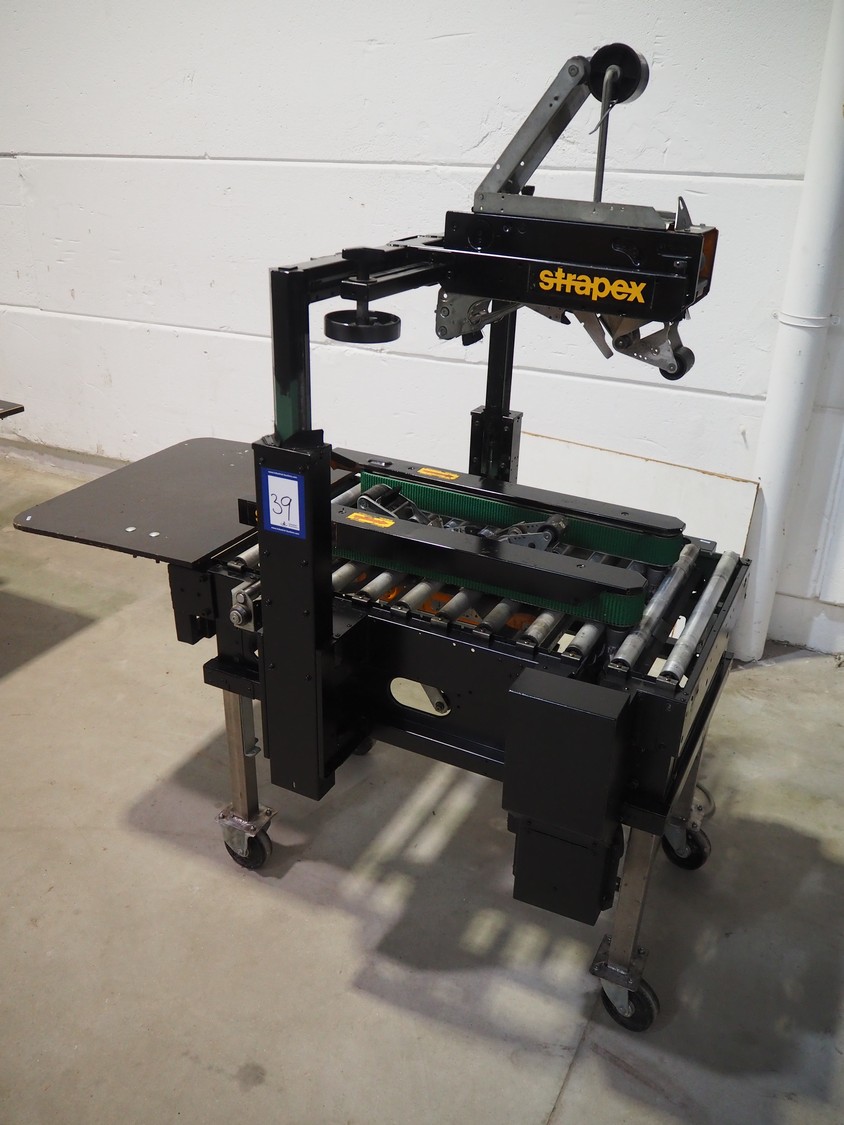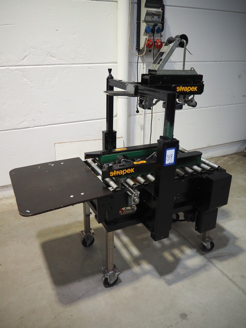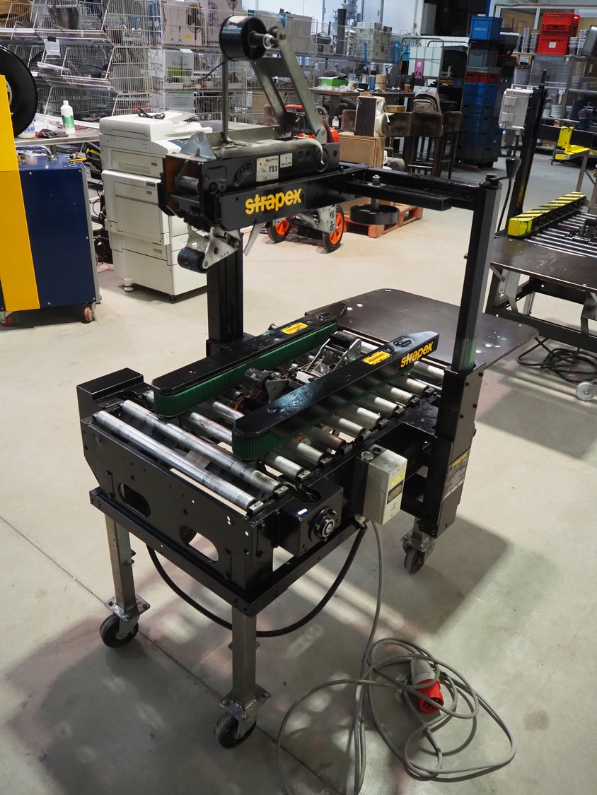 Strapex mobile box closing machine with top and bottom taper, type: GM-50, 380 V, 0.8 A, s/s rollers, roller width: 500 mm, total dimensions: 1400 mm x 850 mm x 1600 mm.