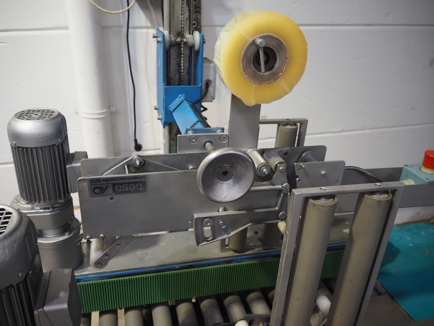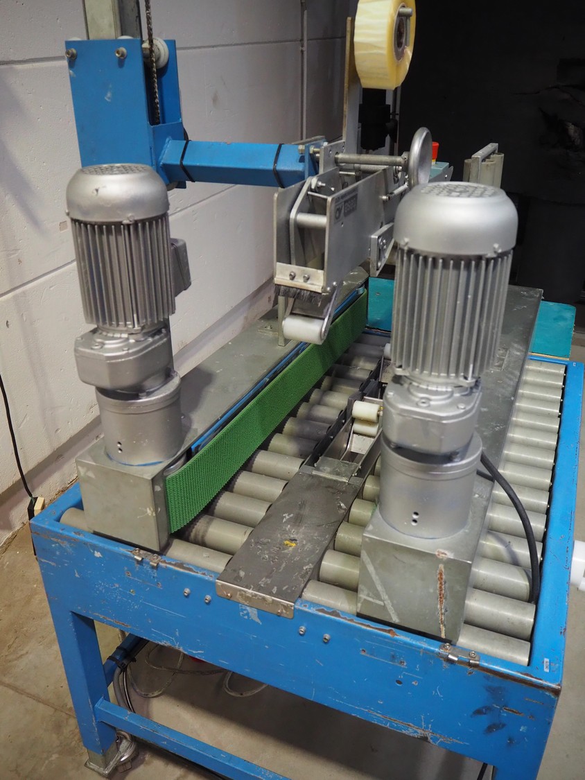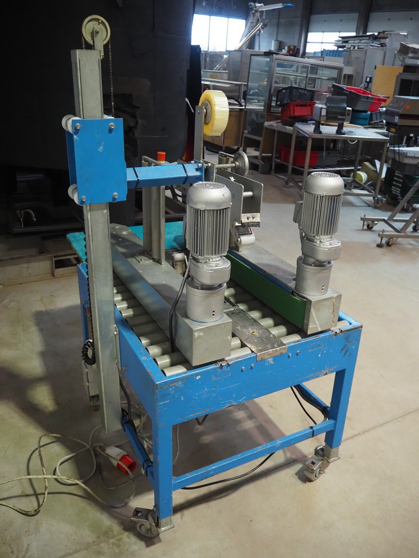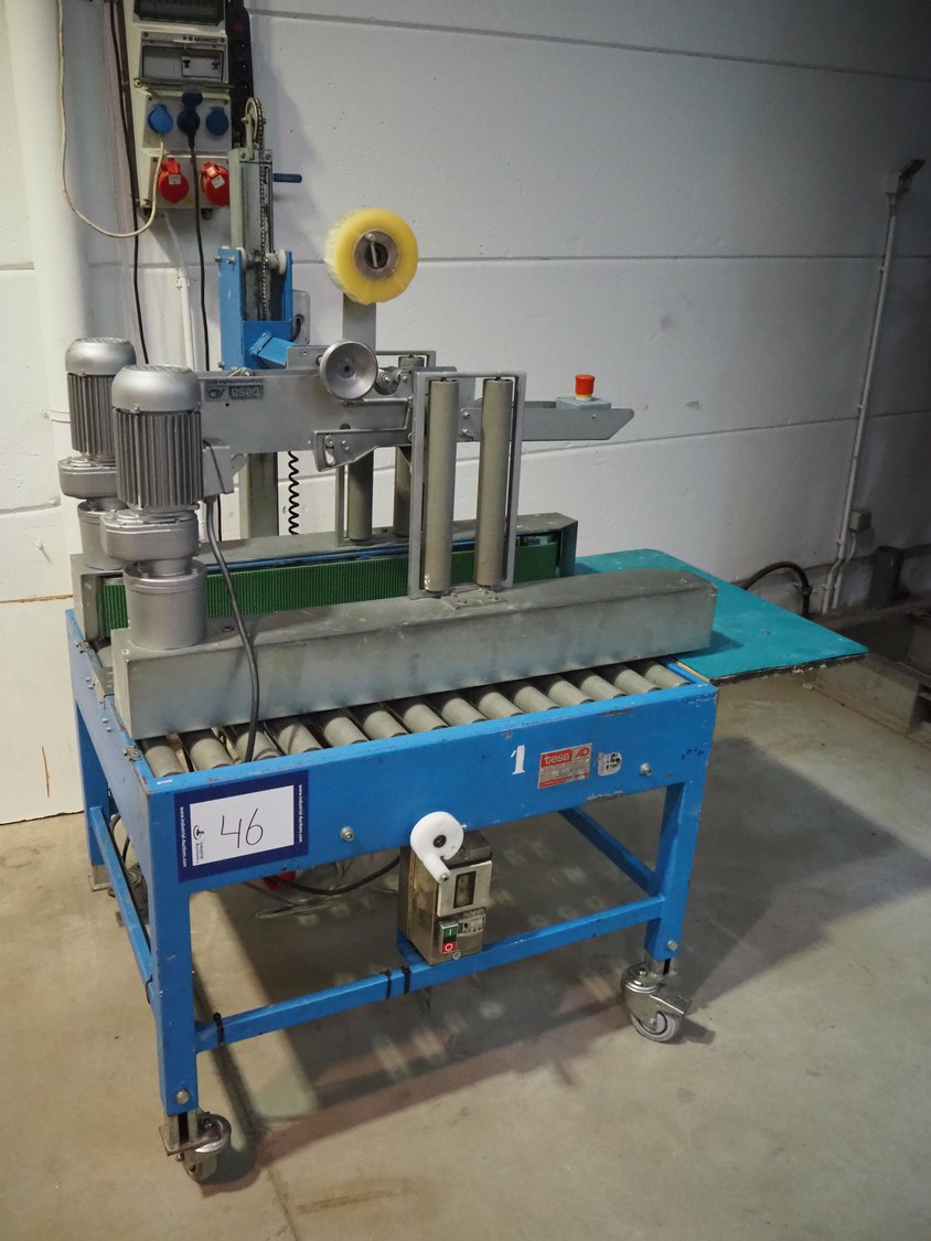 TESA mobile box closing machine with top and bottom taper, type: 6030, serial number: 2700, year of construction: 1986, 380 V, 3 Ph, 50 Hz, 1.5 A, 400 W, plastic rollers, roller width: 300 mm, total dimensions: 1370 mm x 1000 mm x 1680 mm.