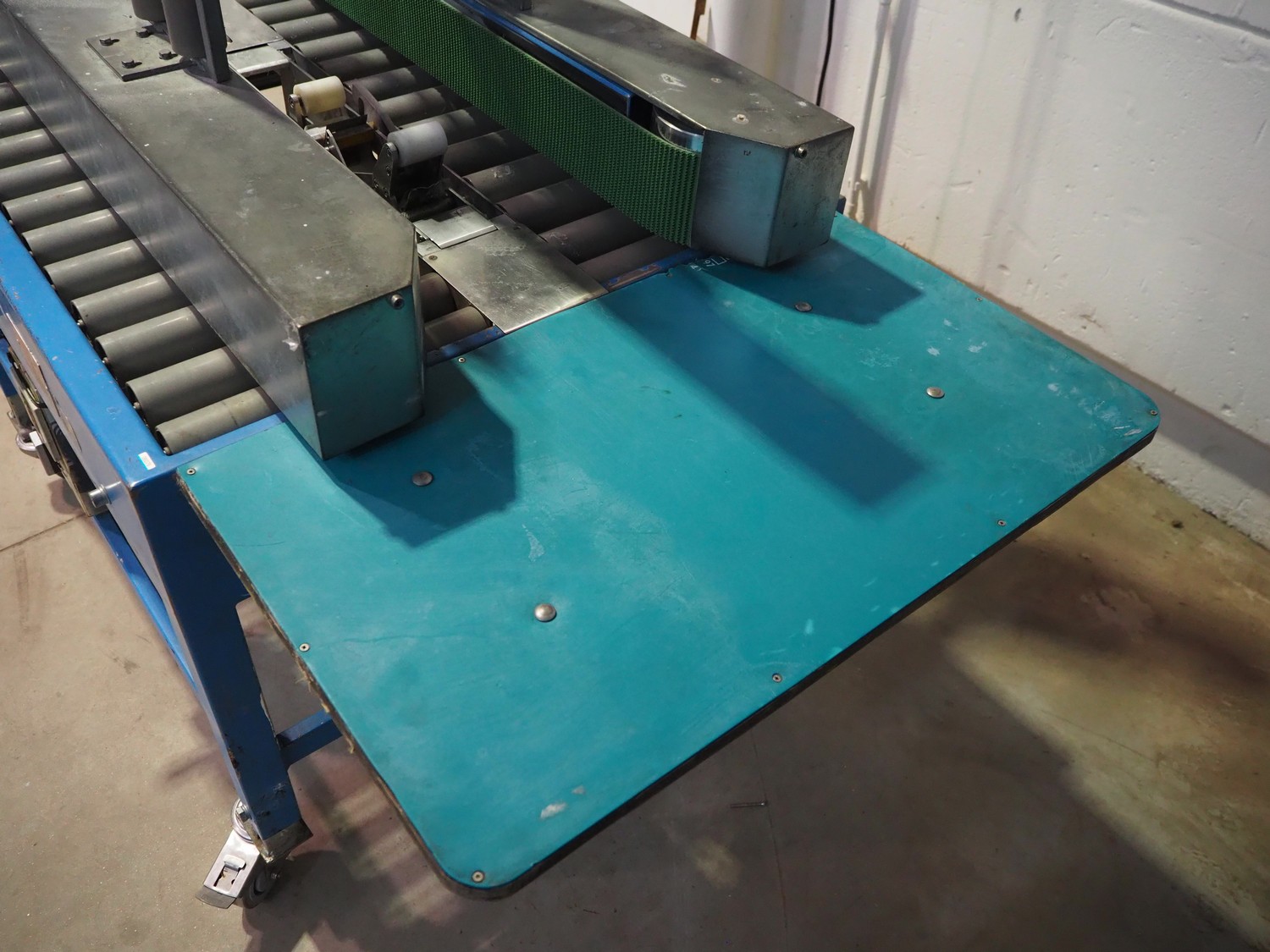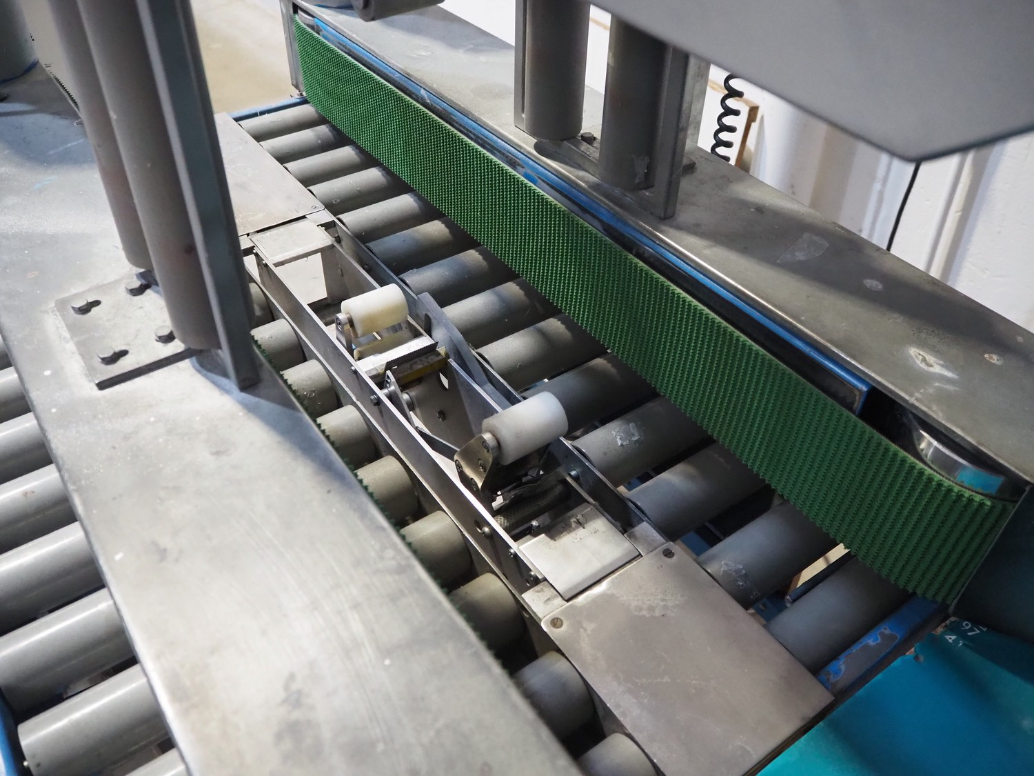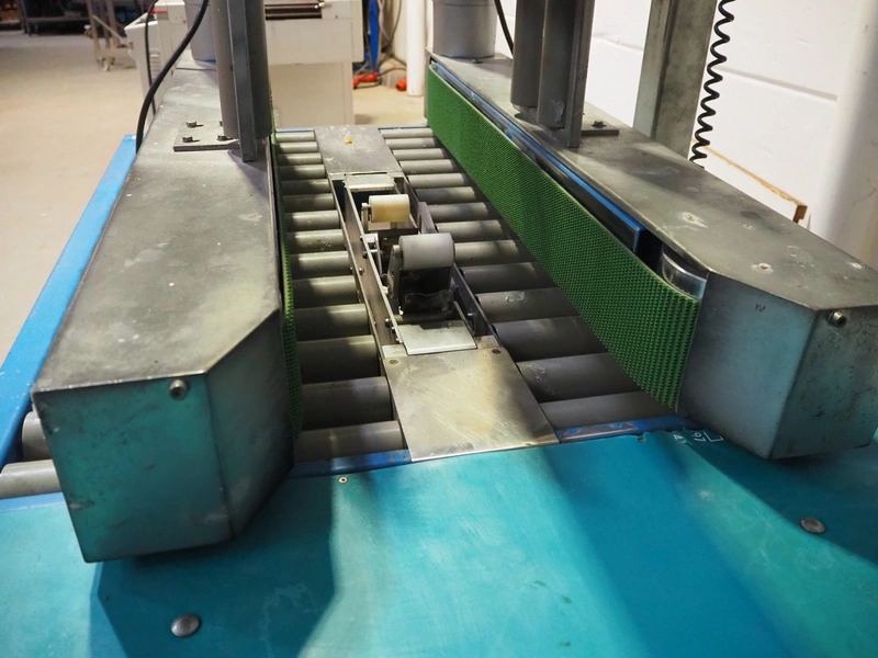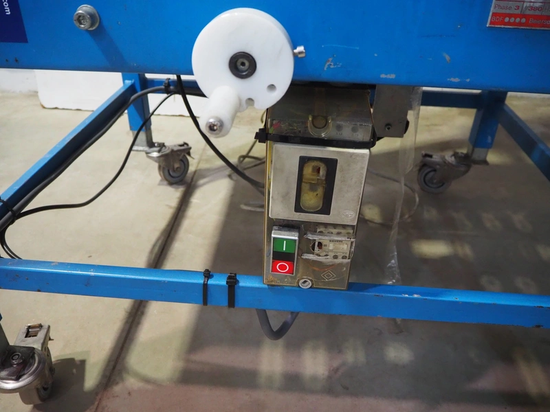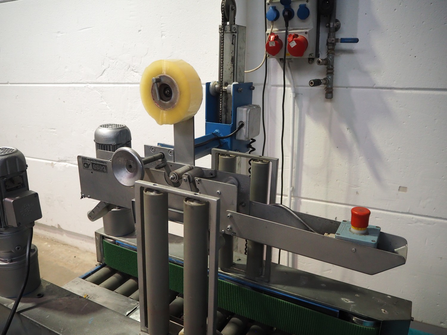 TESA mobile box closing machine with top and bottom taper, type: 6030, serial number: 2700, year of construction: 1986, 380 V, 3 Ph, 50 Hz, 1.5 A, 400 W, plastic rollers, roller width: 300 mm, total dimensions: 1370 mm x 1000 mm x 1680 mm.