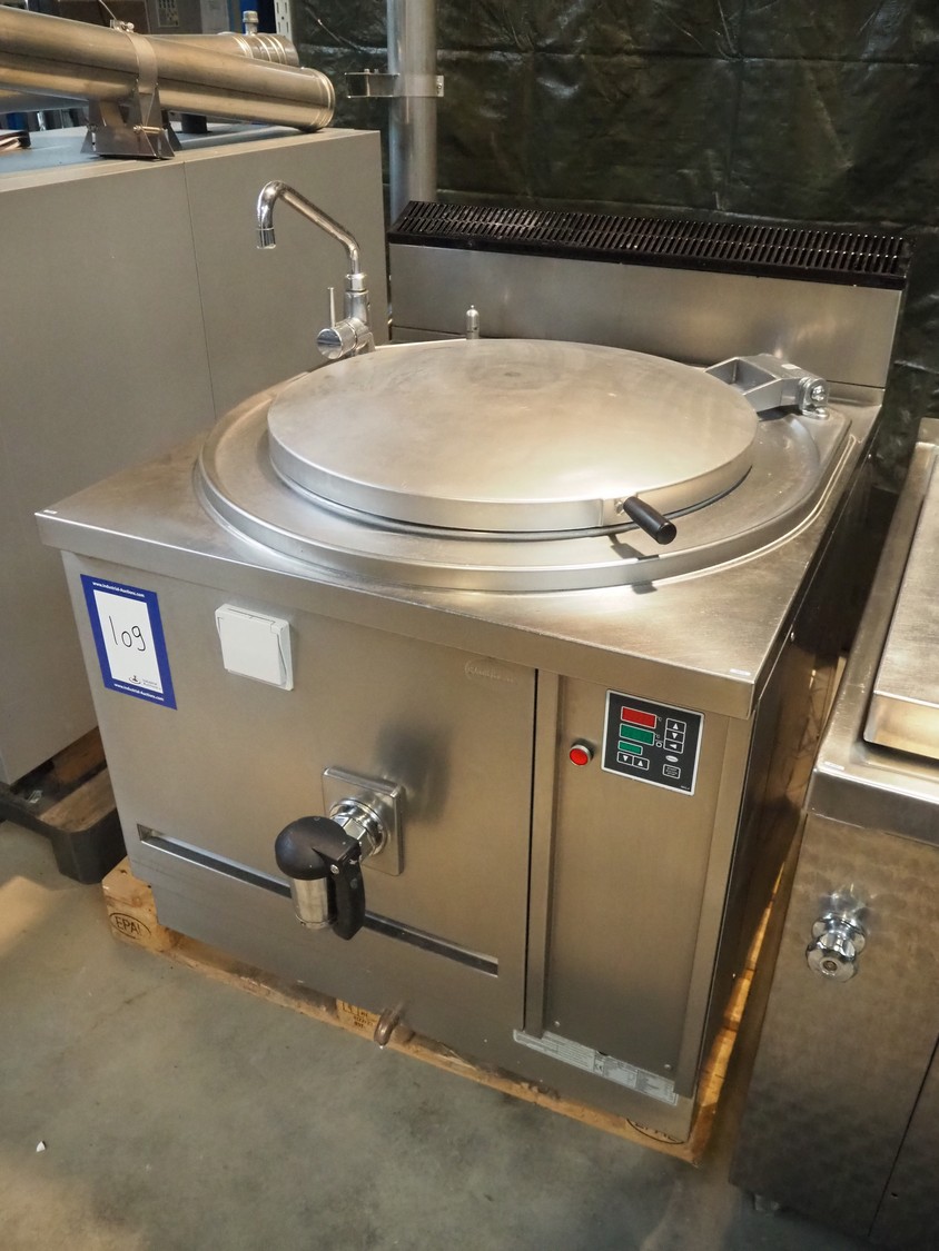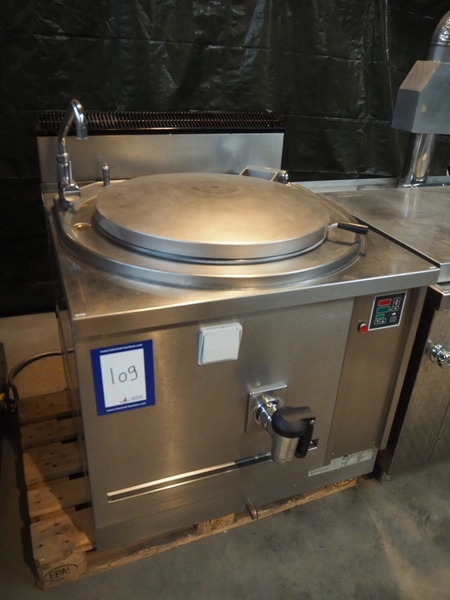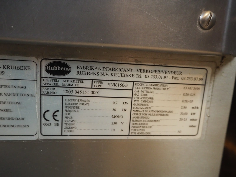 Rubbens cooking vessel, type: SNK150G, number: 2005 045151 0001, 230 V, 50 Hz, 10 A, 0.7 kW, 2.86 m³ per hour, volume: 150 liter, total dimensions: 1000 mm x 1250 mm x 1250 mm.