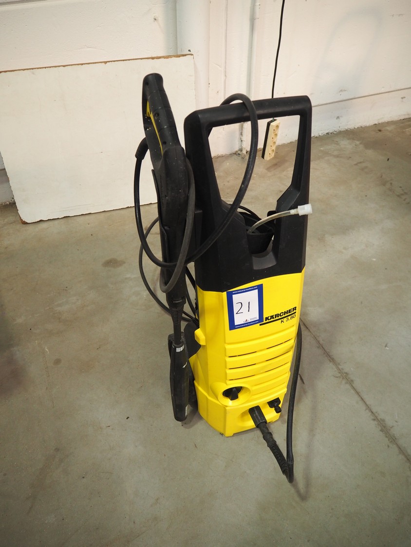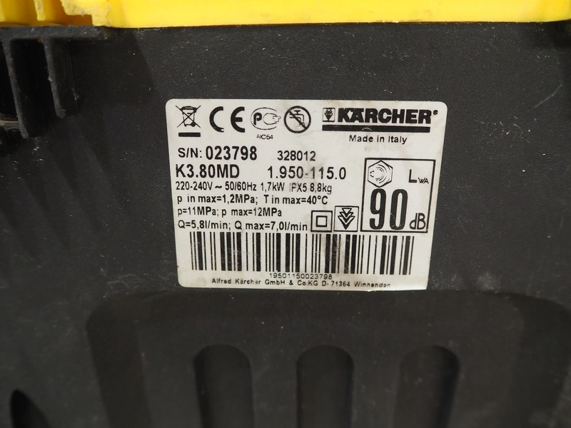 Kärcher mobile high pressure cleaner, type: K3.80MD, serial number: 023798, 220/240 V, 50/60 Hz, 1.7 kW, dimensions: 320 mm x 280 mm x 900 mm.