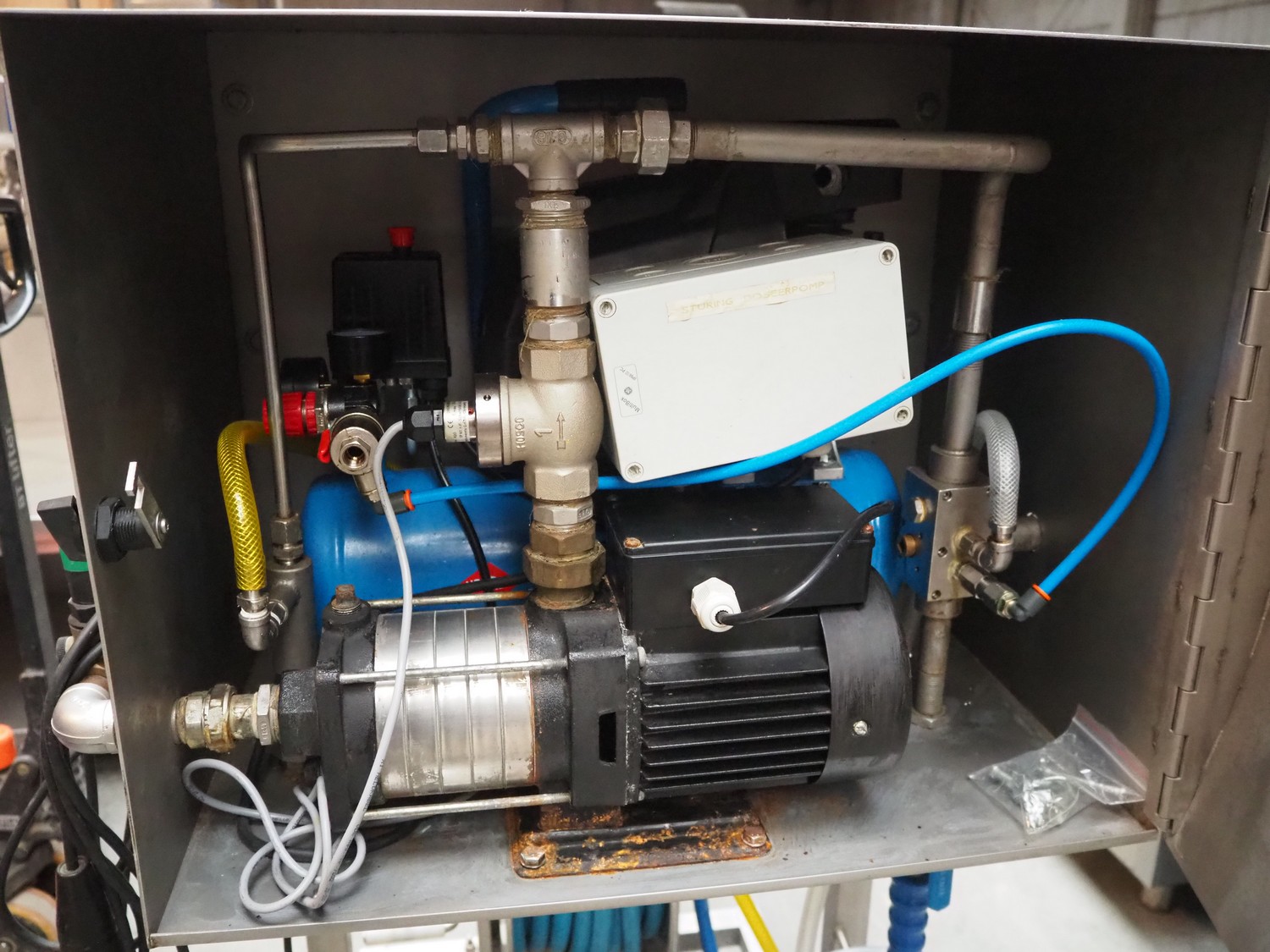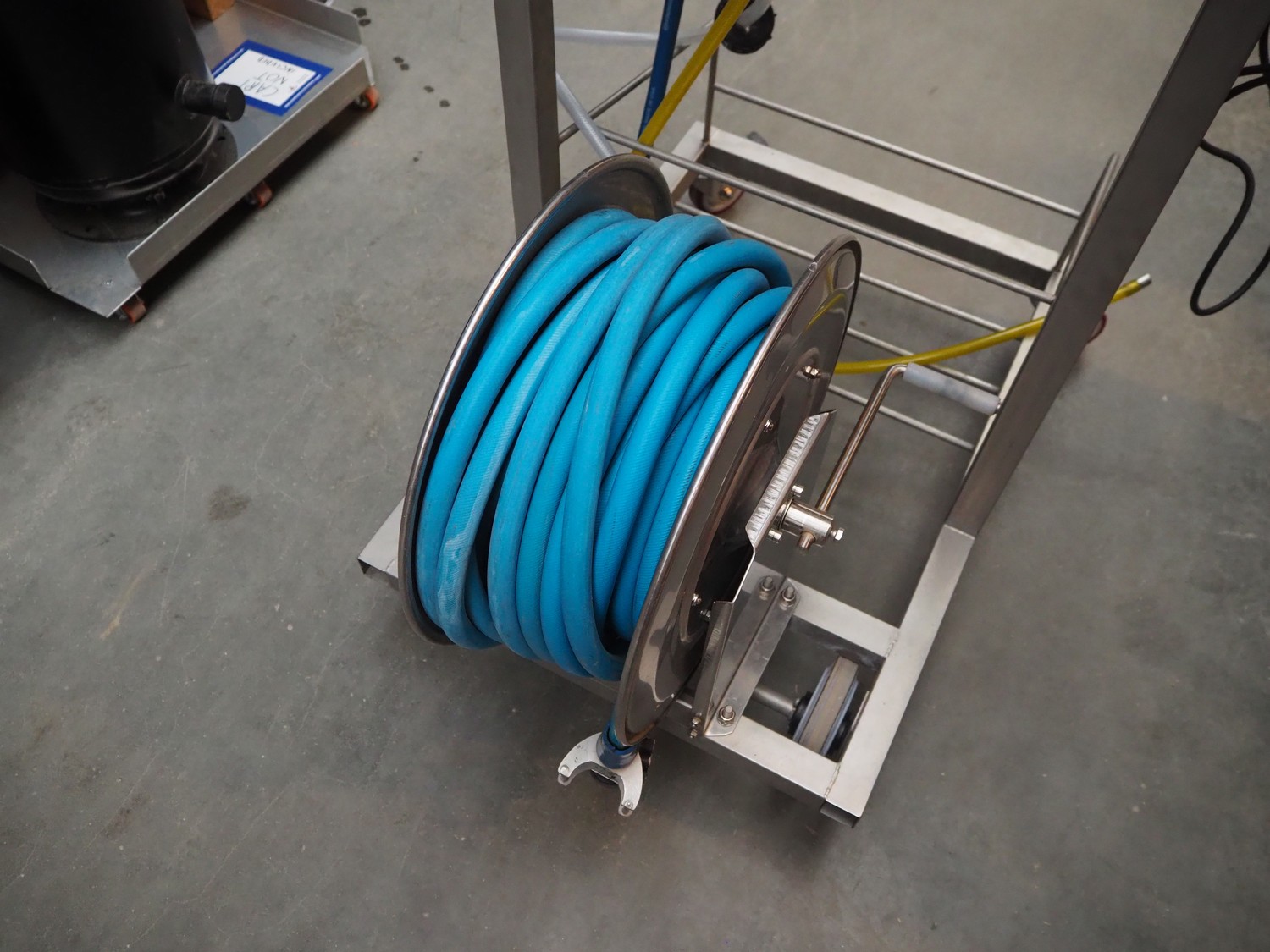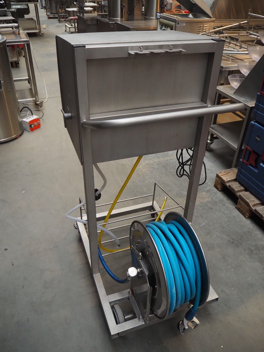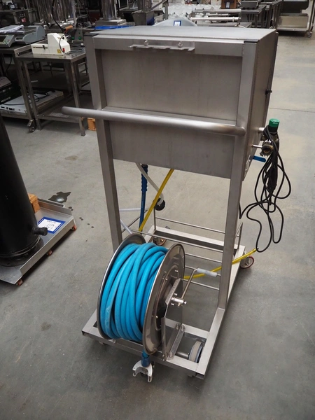 Akwa+reinigingssytemen mobile hygiene trolley with s/s hose reel and pump, dimensions: 980 mm x 730 mm x 1370 mm.