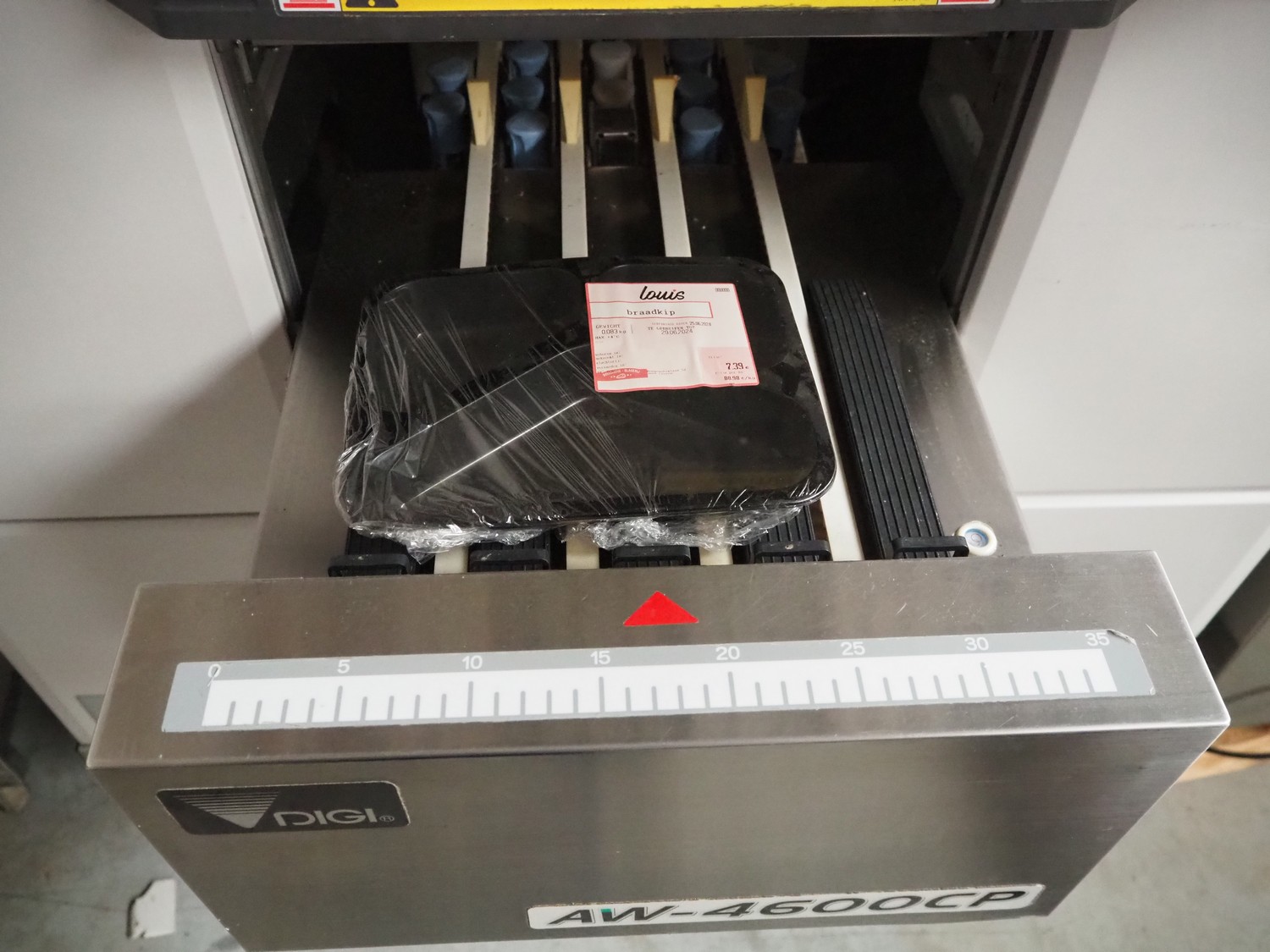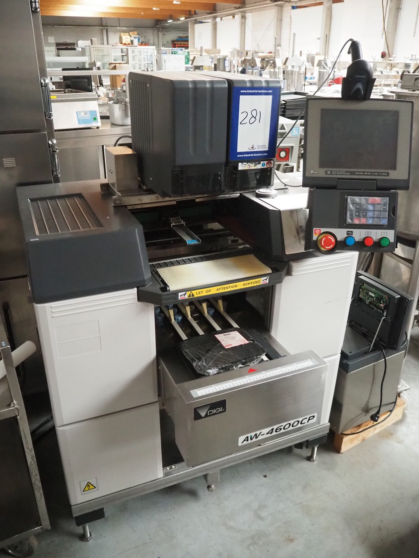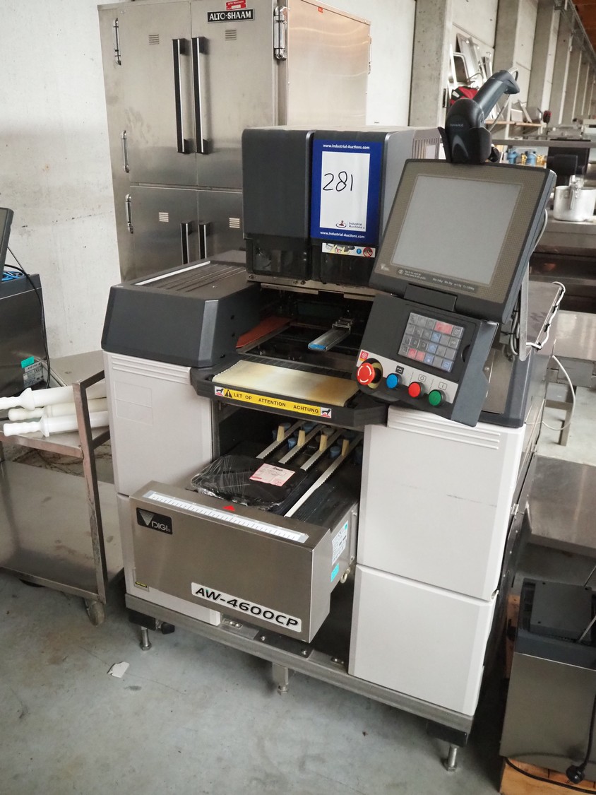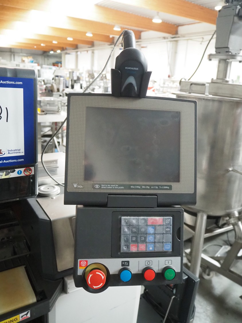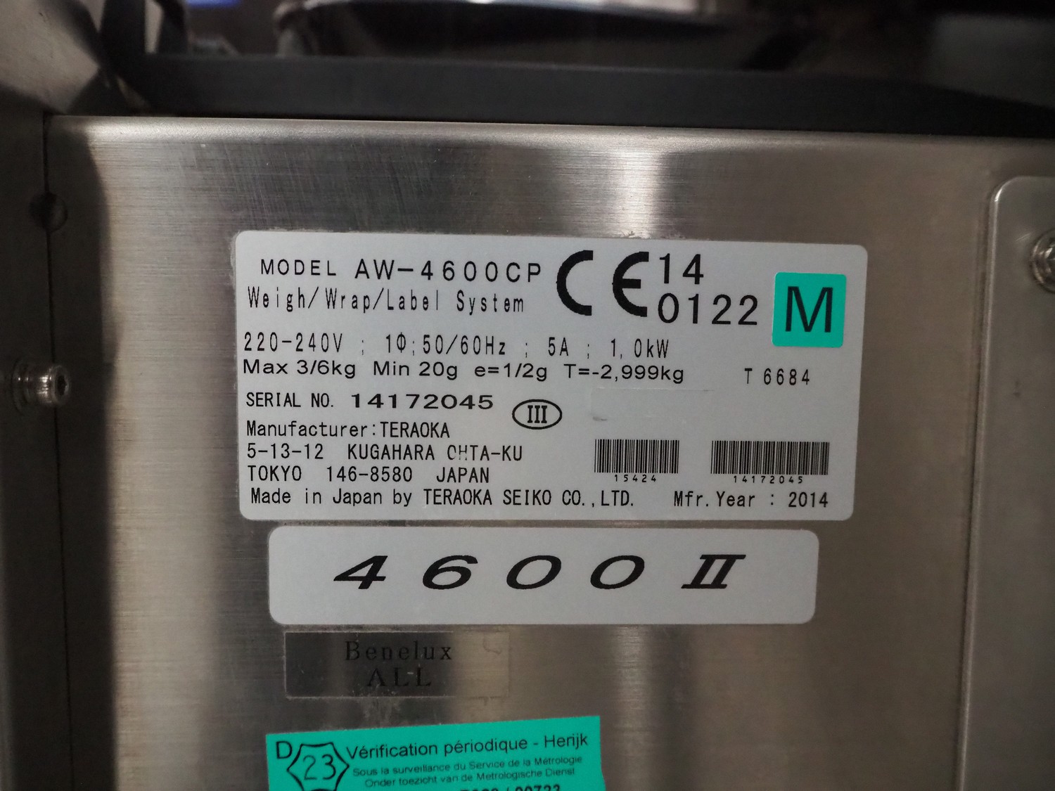 Teraoka Seiko Co., LTD semi automatic weigh, wrap and labelling machine, model: AW-4600CP, serial number: 14172045, year of construction: 2014, 220-240 V, 1 Ph, 50/60 Hz, 5 A, 1.0 kW, maximum weight: 3/6 kg, minimum weight: 20 gram, e=1/2 gram, T=-2.999 kg, dimensions: 1100 mm x 1050 mm x 1500 mm.