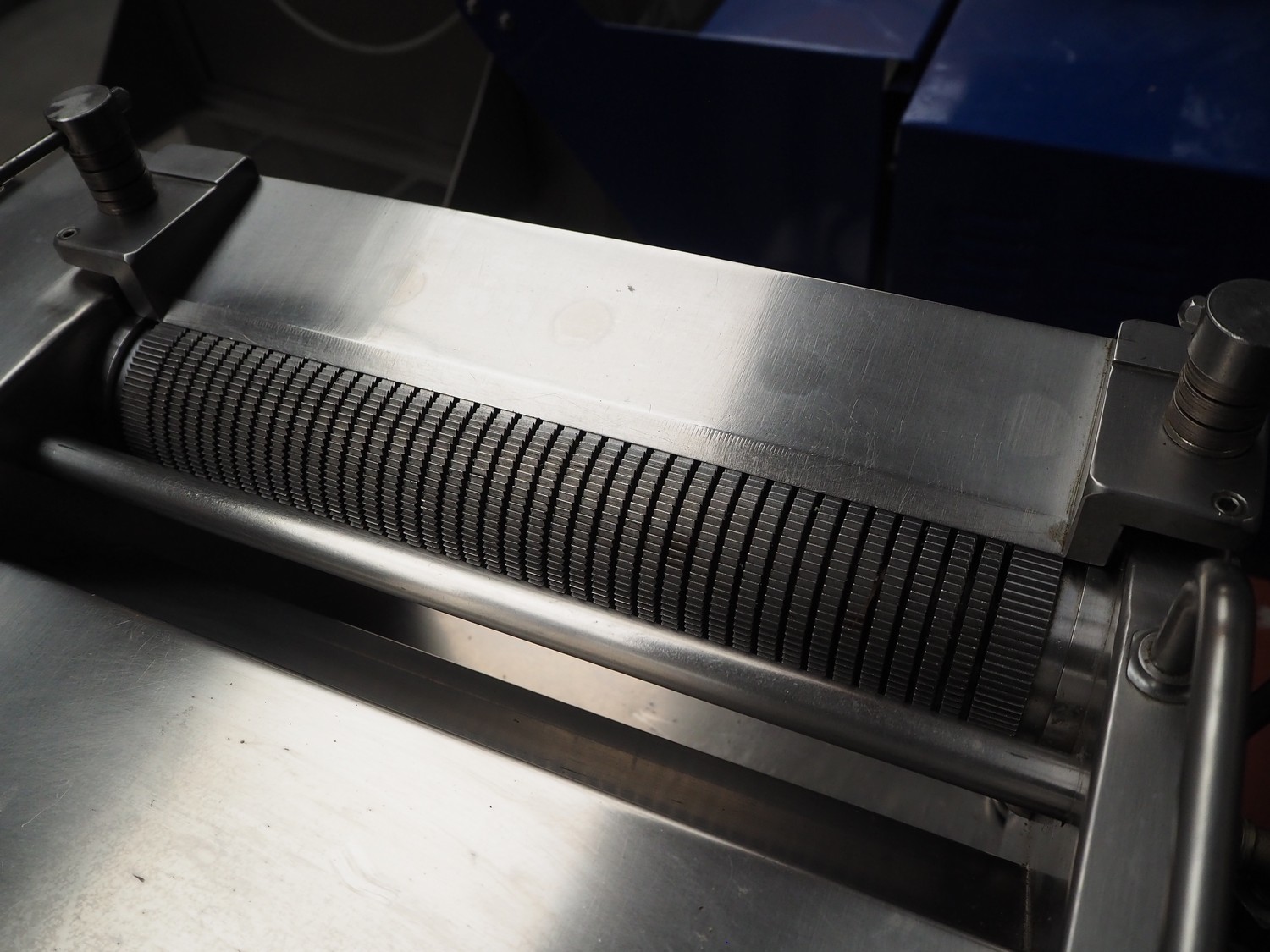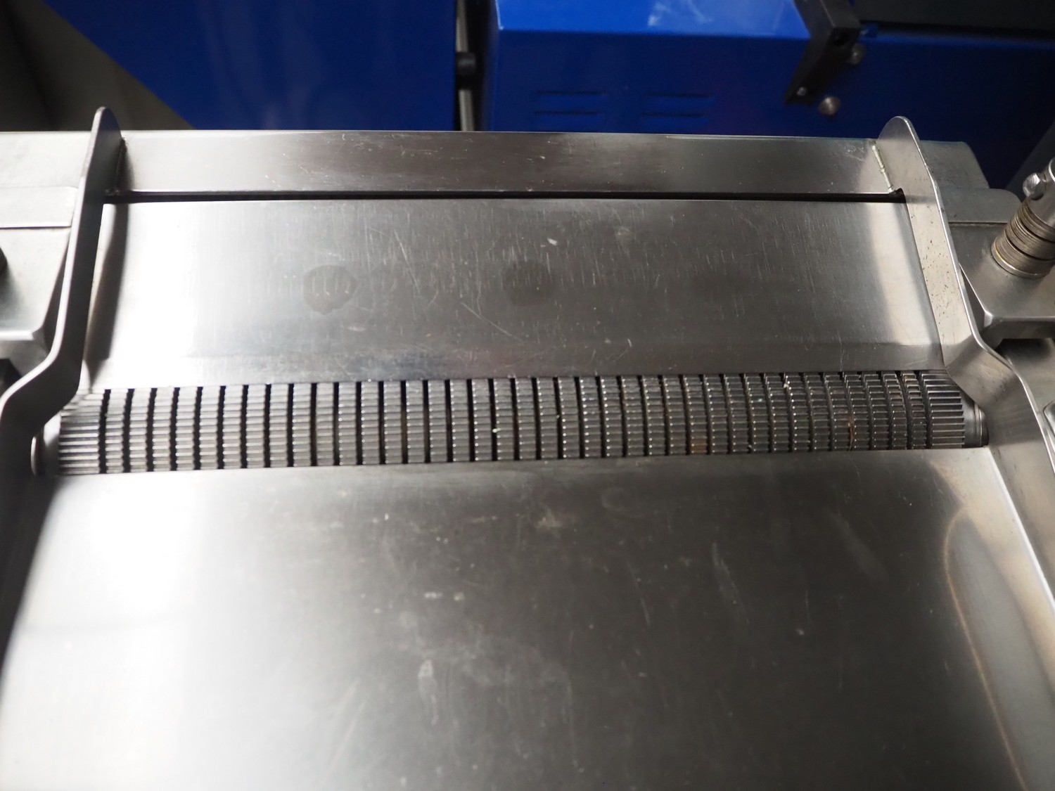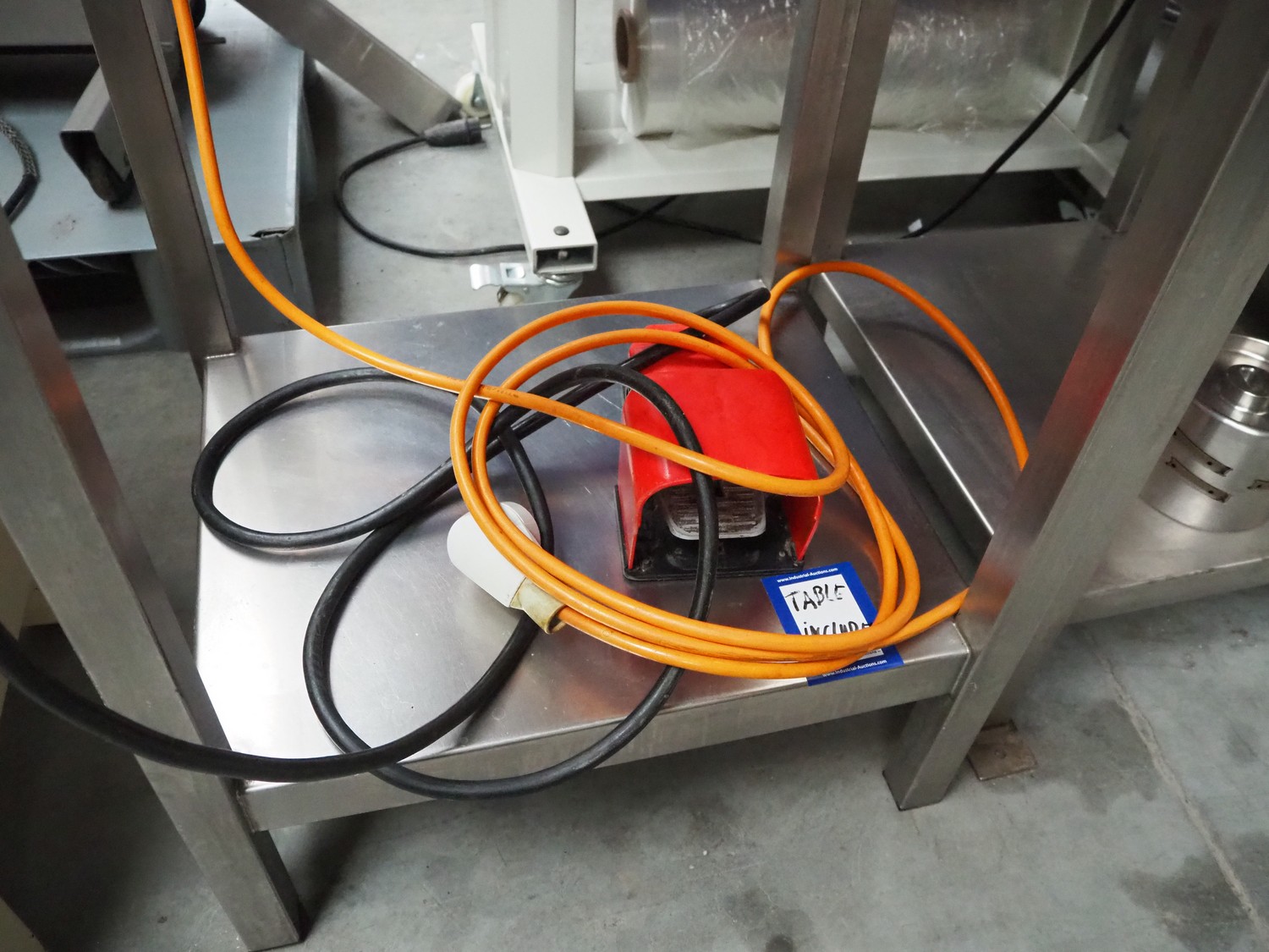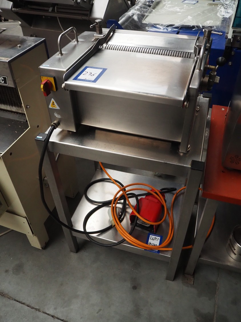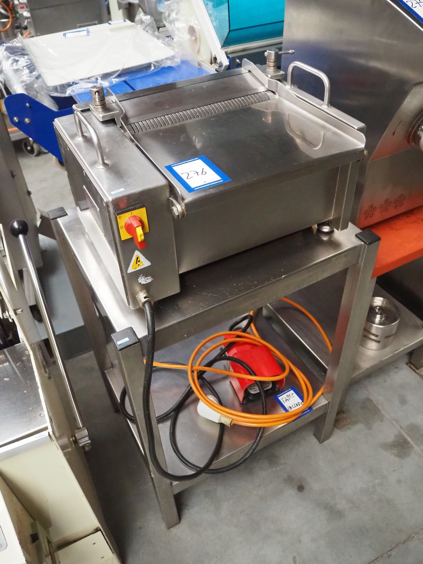 Cretel skinning machine on s/s trolley with foot control, type: 361 F, number: 732.98.05, year of construction: 1998, 220/380 V, 3 Ph, 50 Hz, 1.85/1.05 A, 0.37 kW, working width: 315 mm, total dimensions: 600 mm x 500 mm x 1150 mm.